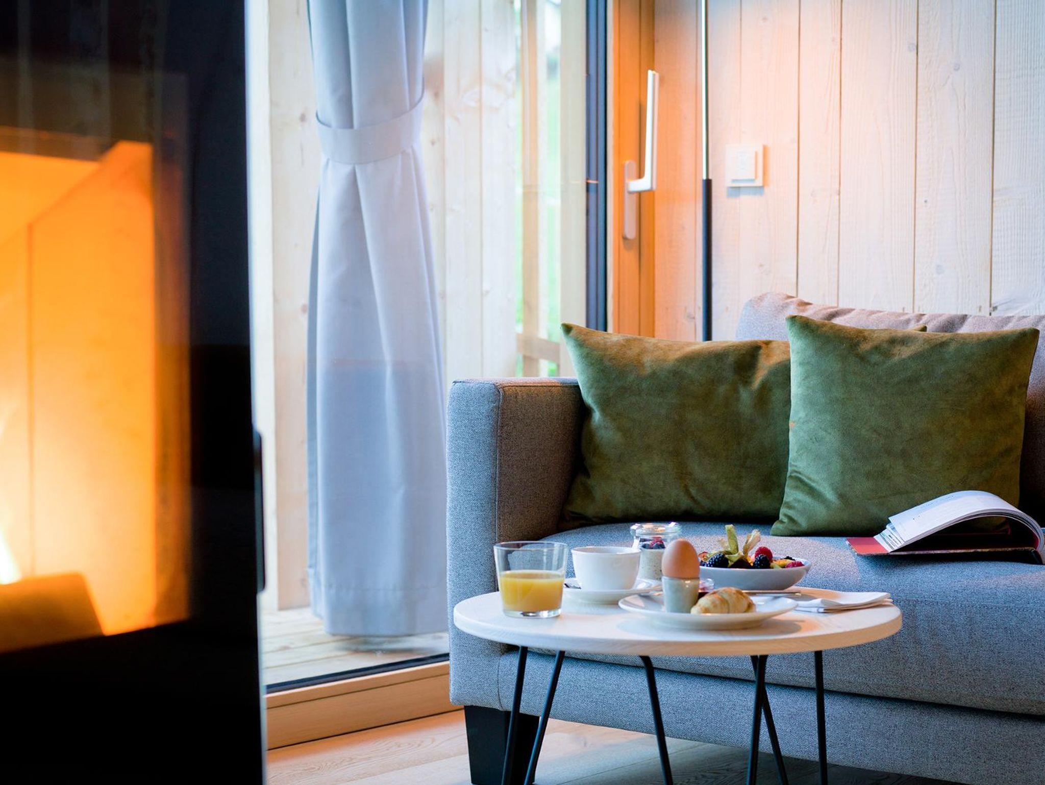 Unsere Luxus-Chalets verfügen über ein King-Size-Bett mit Ausblick ins Grüne, einen Ankleidebereich mit Safe, einen Wohnbereich mit Kamin, Sitzgarnitur und großem Panoramafenster. Der Essbereich beinhaltet neben dem Essplatz und einer geräumigen Teeküche, eine Minibar, eine Kaffee-Kapselmaschine und einen Wasserkocher.