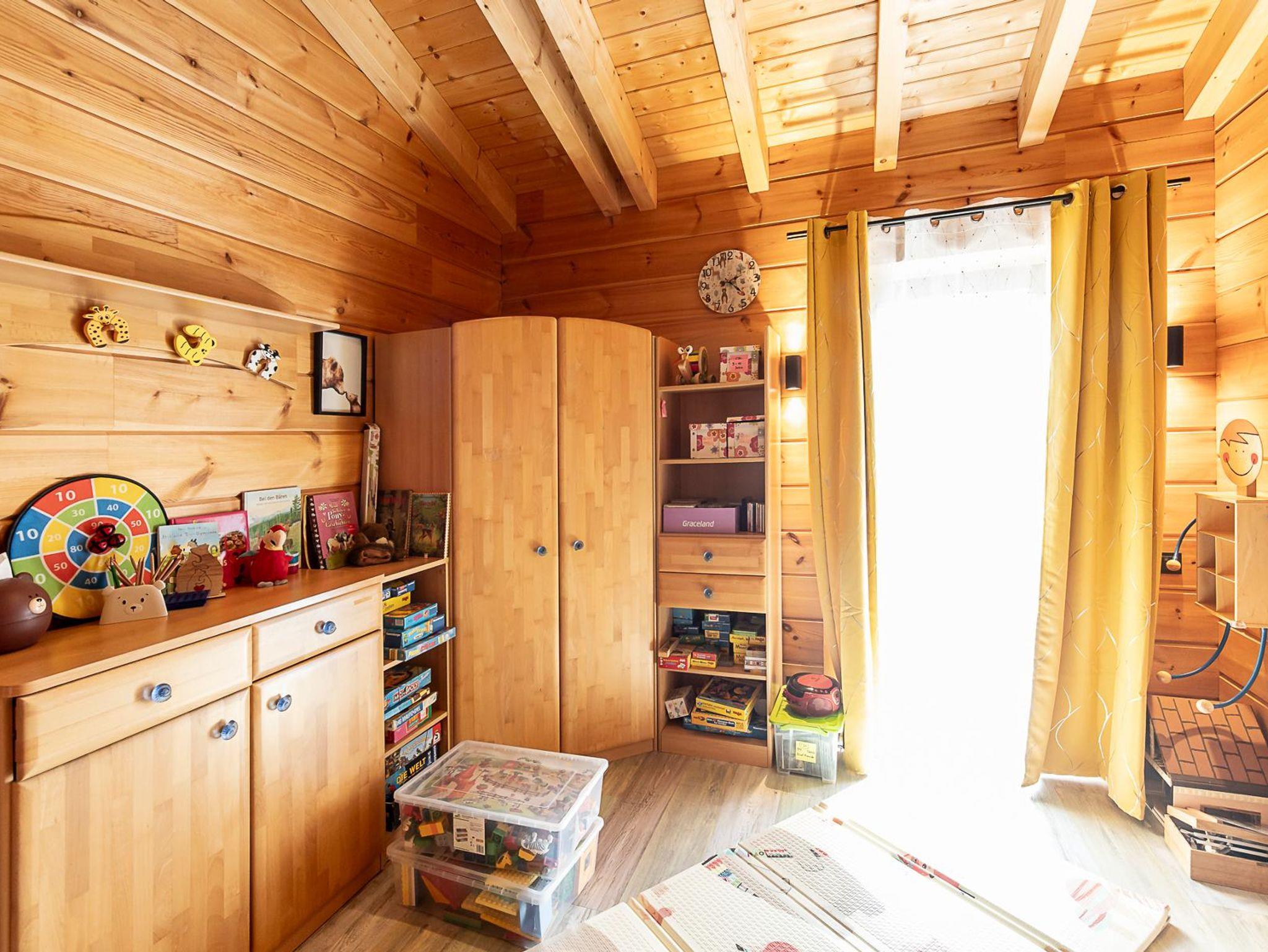 Im geräumigen Eltern- / Schlafzimmer befindet sich ein 1,80m breites Massivholz-Doppelbett mit komfortabler 25cm-Matratze, 50cm Einstiegshöhe und hochwertigem Marken-Lattenrost, welcher manuell verstellbar ist. Ein größerer und ein kleinerer Kleiderschrank mit Spiegel sowie eine 80x40cm große Leder-Sitztruhe bieten viel Stauraum. Der an der Wand befestigte Smart-TV kann auch mit Mediathek genutzt werden. Ein 3m-Panoramafenster vom Boden bis zur Decke sorgt für bezaubernde Ausblicke und der kleine, aussichtsreiche Balkon kann direkt vom Schlafzimmer aus begangen werden. Ein kleiner Schreibtisch mit Lampe und 2 Stühle können als Arbeitsplatz genutzt werden.
