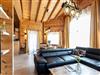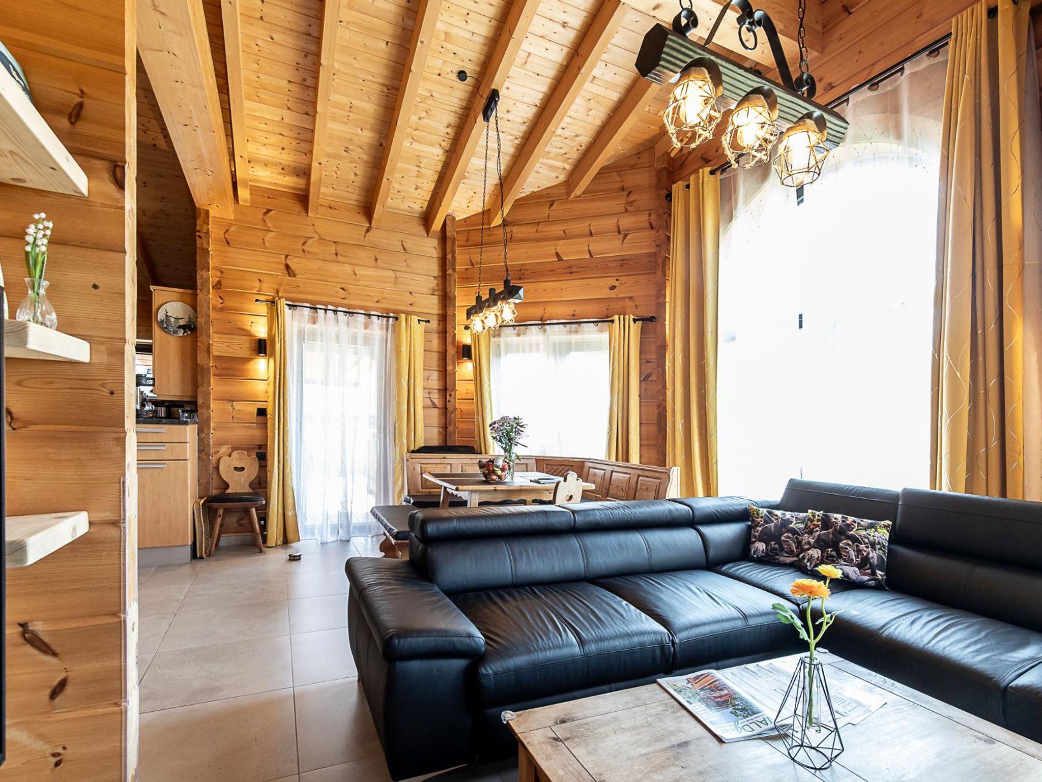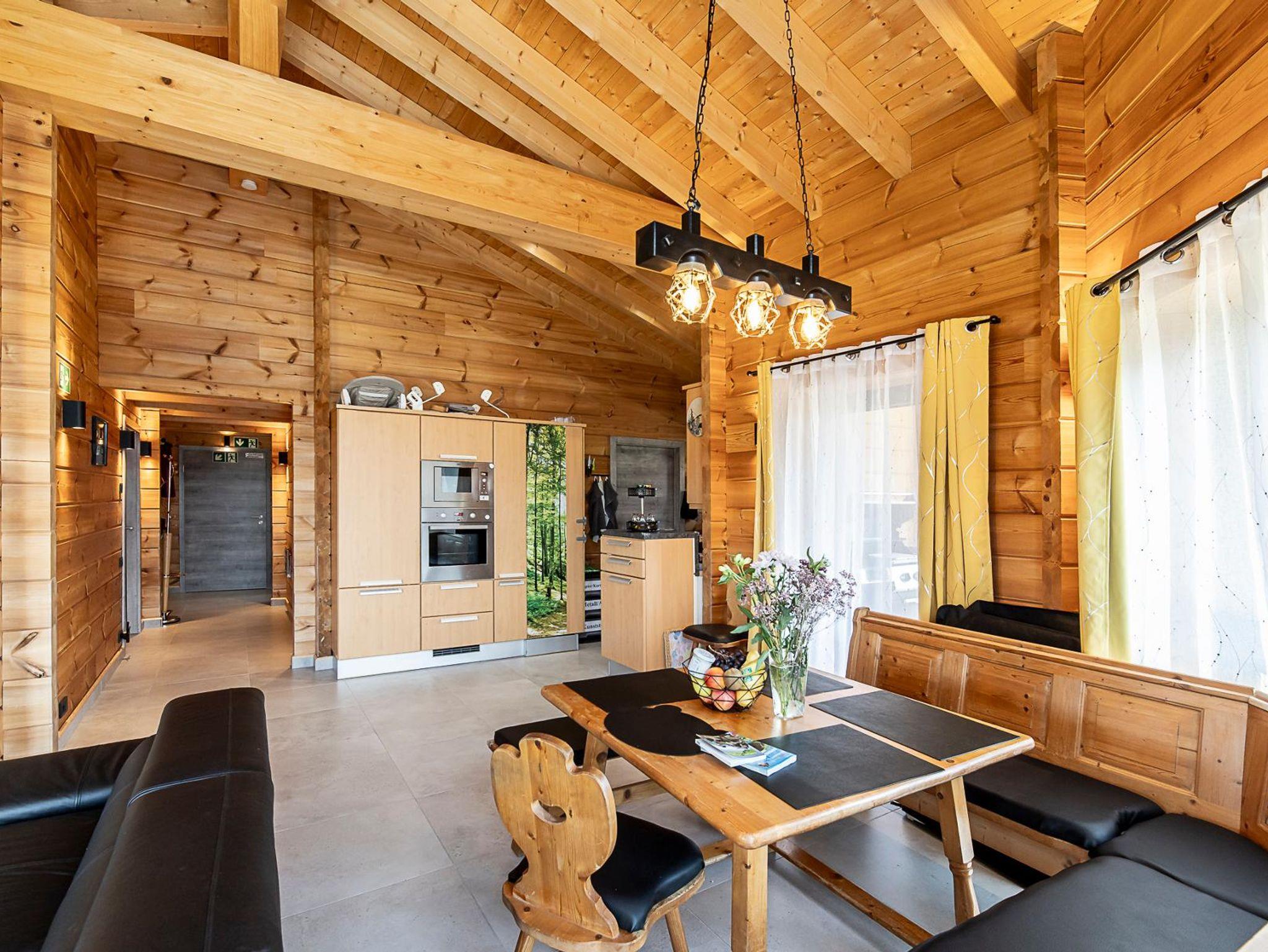 Die Wohnküche/das Wohnzimmer ist offen vom Flur aus erreichbar und besticht durch seine massiven Deckenbalken sowie den 180-Grad-Rundumblick durch die vielen großen Fenster. Auf dem großen Ecksofa aus Kunstleder findet die ganze Familie Platz, 2 Personen können auf der ausgezogenen 1,20m breiten und 1,95m langen Liegefläche schlafen und ein 55 Zoll großer Smart-TV an der Wand gegenüber kann auch mit Mediathek genutzt werden. Der quadratische, urige Holz-Esstisch mit lederbezogener Eckbank und Stühlen direkt an den Fenstern ist der gemütliche Mittelpunkt.