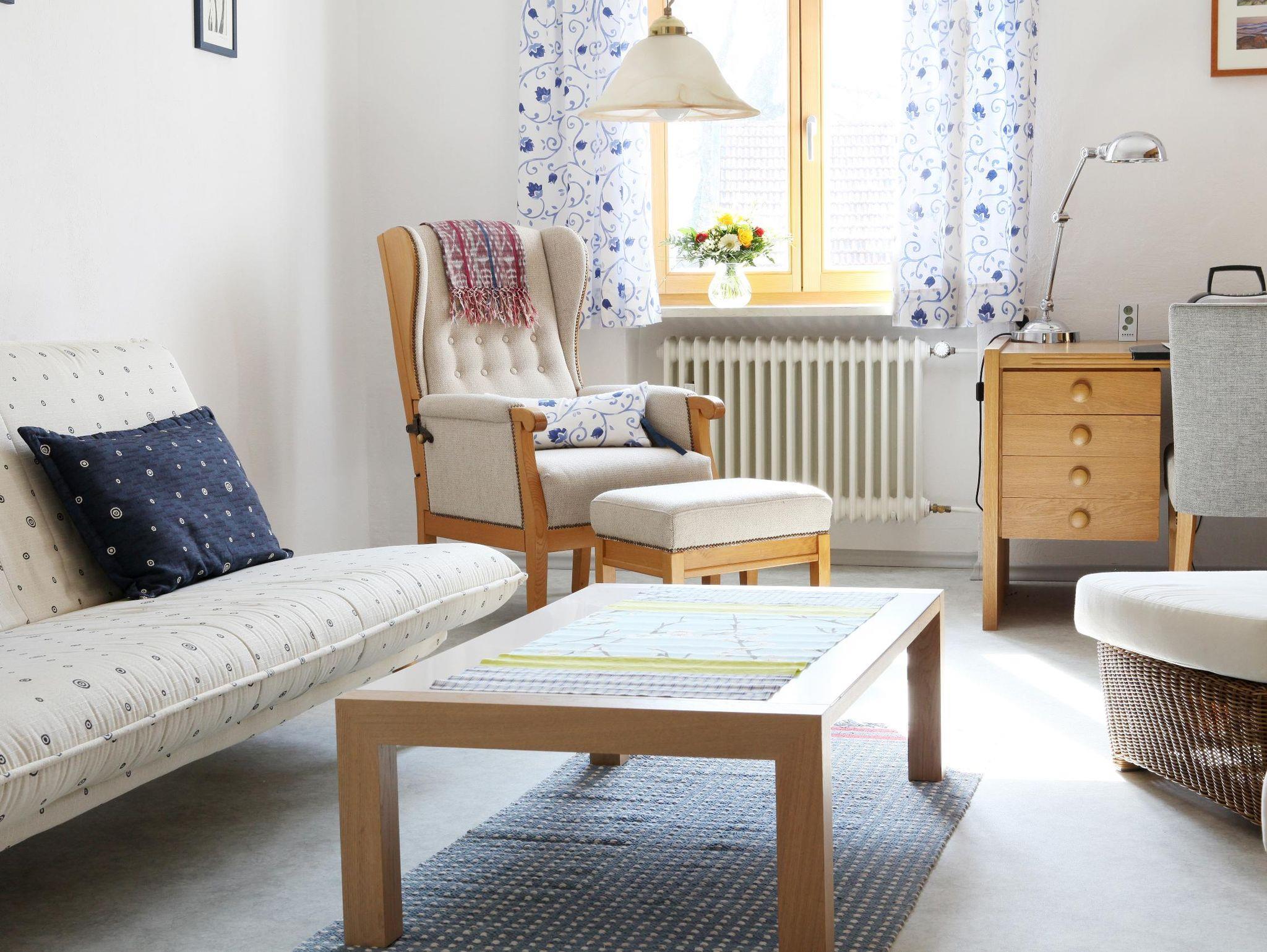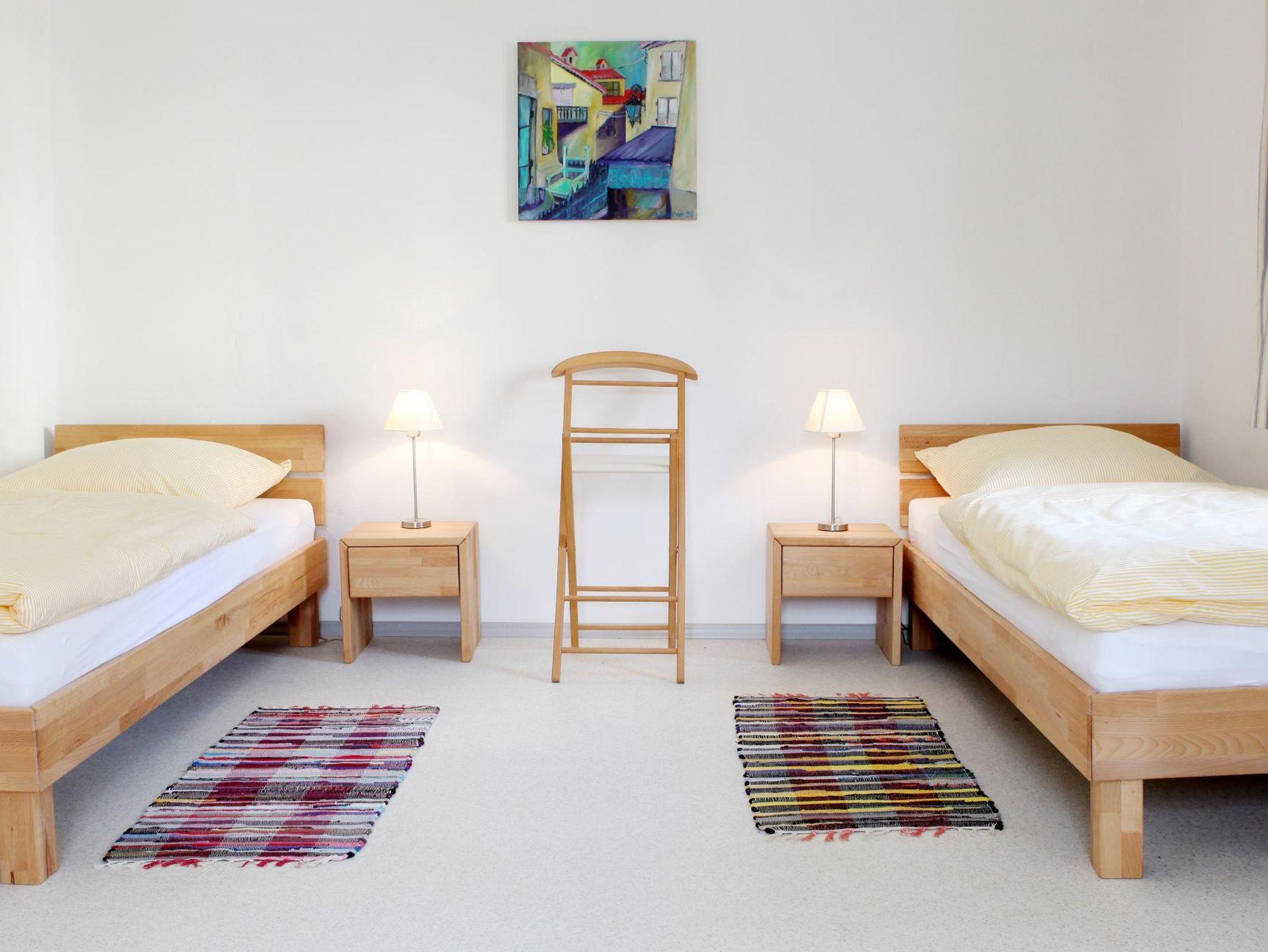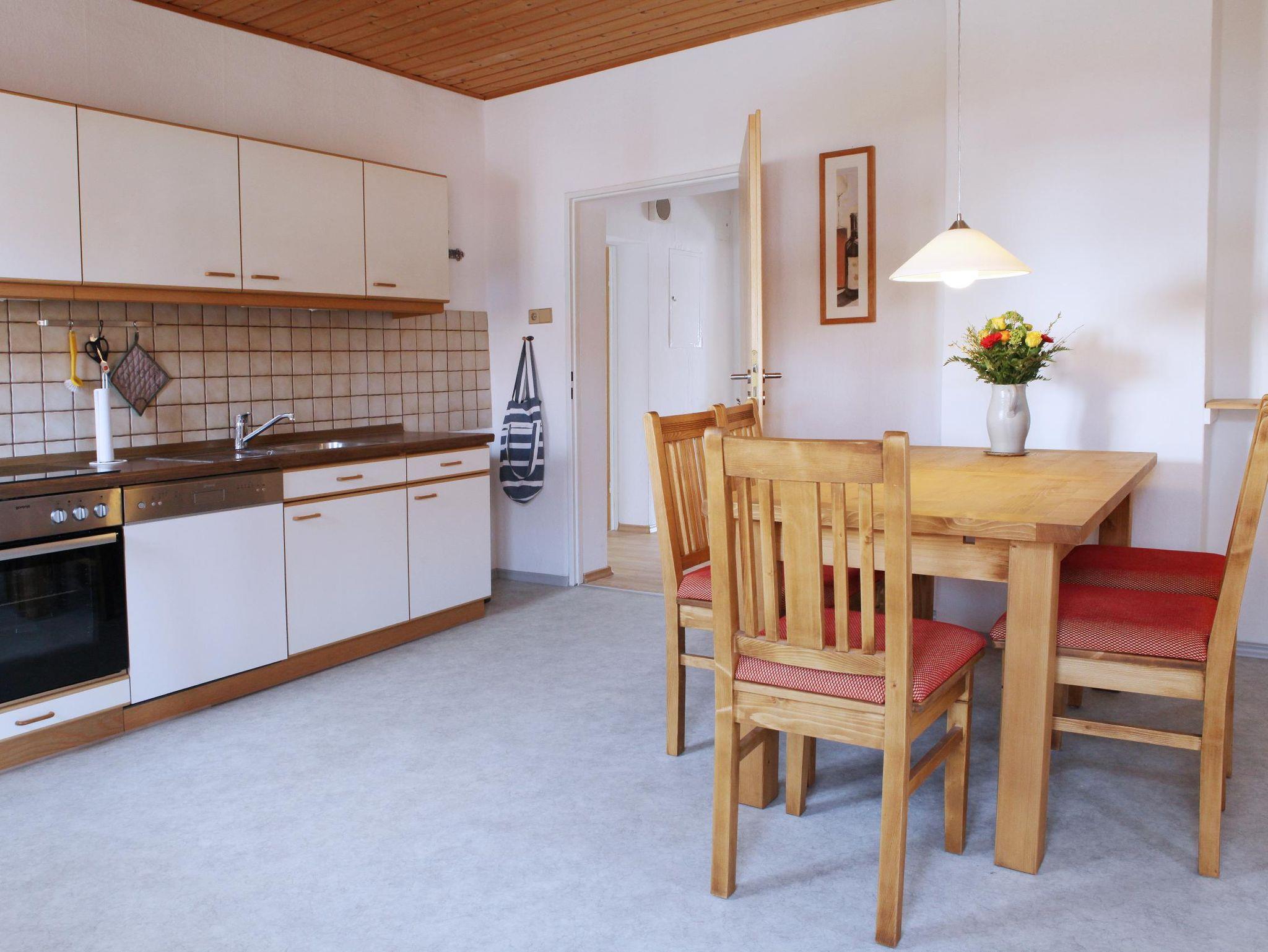 Die Ferienwohnung (110m²) befindet sich im 1. Stock und eignet sich für 5 Personen. Sie ist mit 2 Schlafzimmern ausgestattet, eines mit einem Doppelbett, eines mit drei Einzelbetten. Die Wohnküche verfügt über einen Essplatz, Spülmaschine, Kühlschrank, Herd, Backofen, Toaster, Kaffeemaschine, Mirkowelle, Wasserkocher, Ess- und Kochgeschirr.