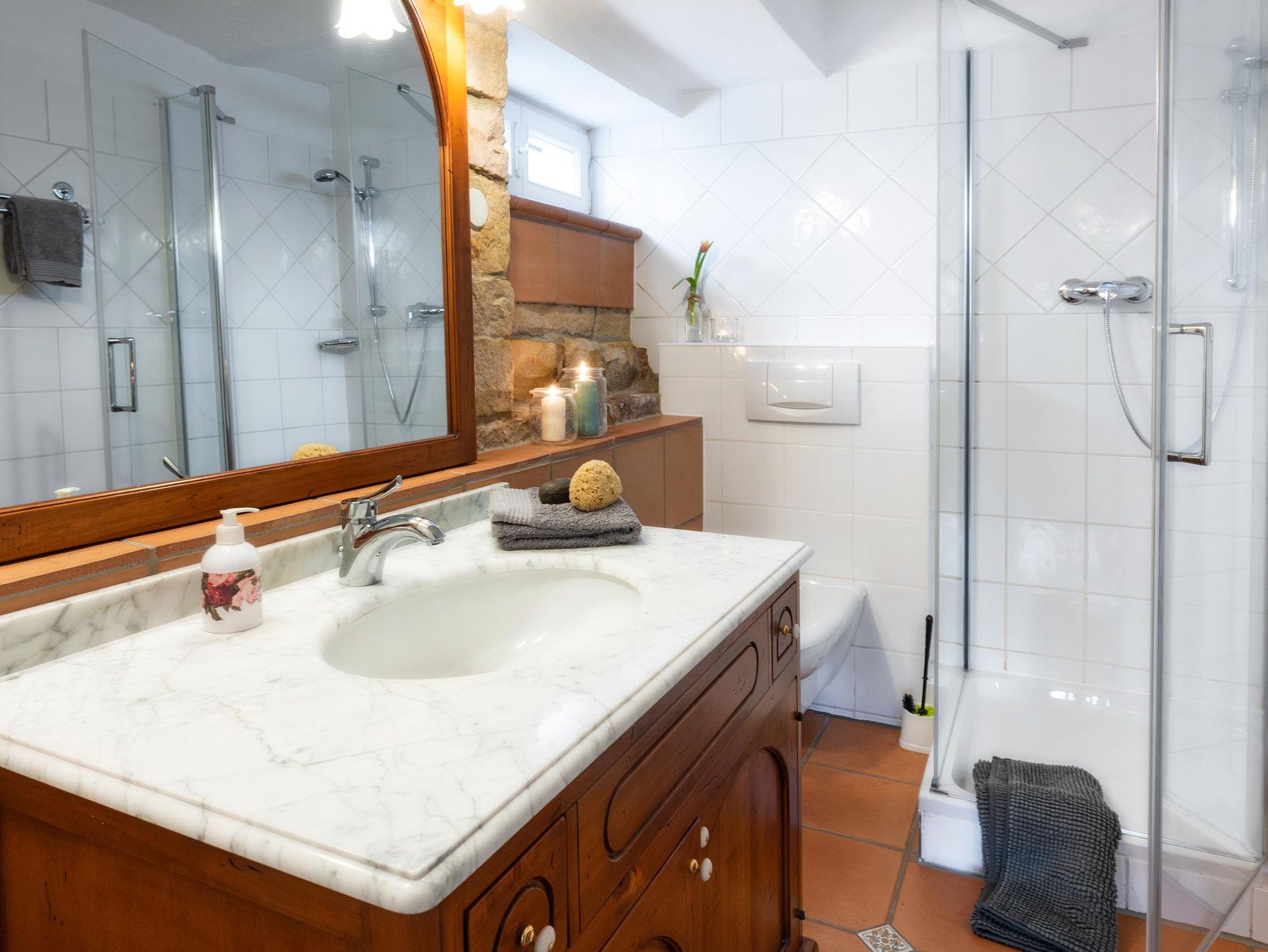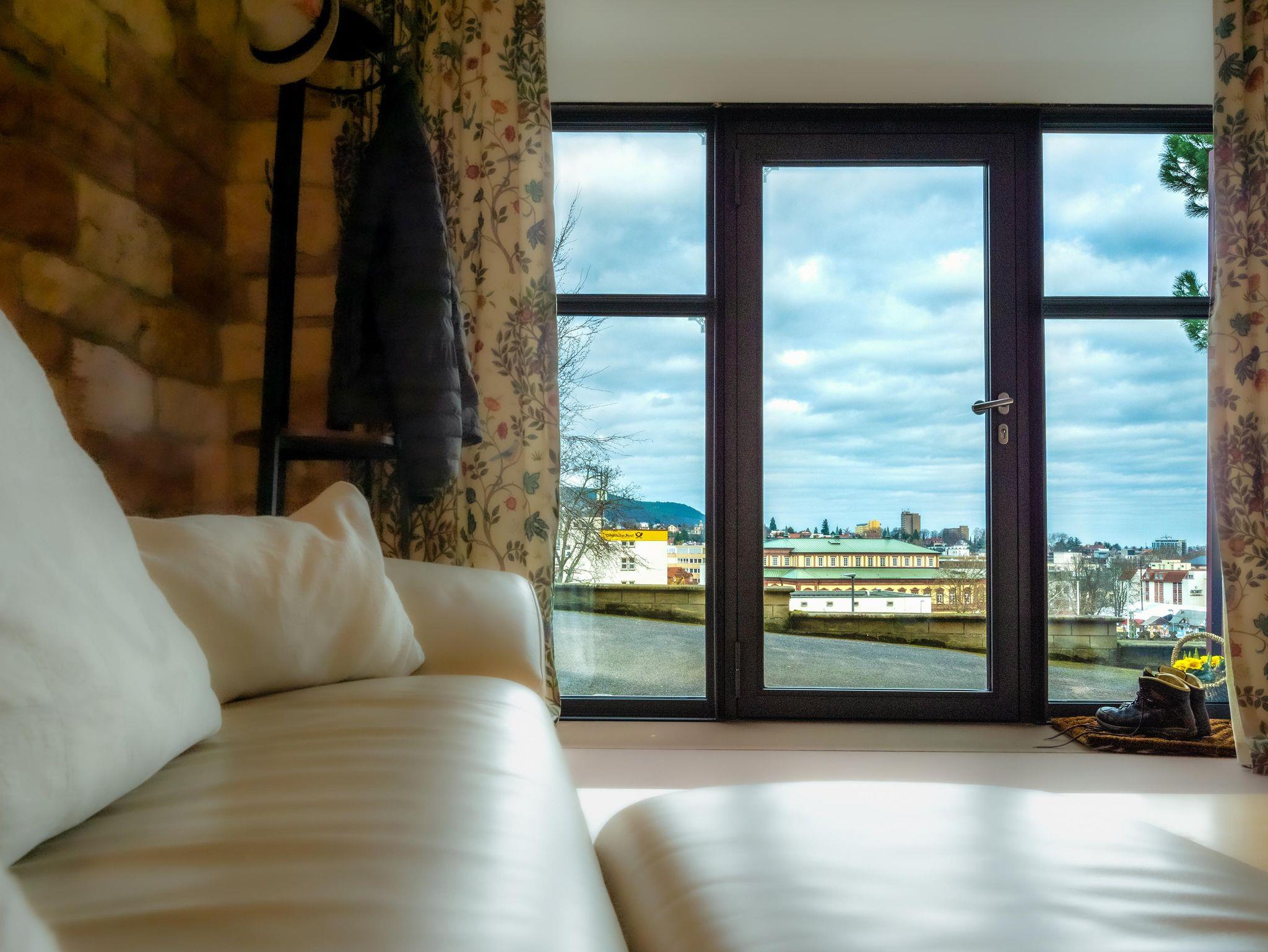 Gemütliches Schlafzimmer mit grossem Boxspringbett, Duschbad mit Handtüchern, Wohnzimmer mit Essplatz, nutzbarem Kaminofen (Holz inklusive) und Designersofa, Terrasse mit Blick über die Stadt, hochwertige voll ausgestattete Küche.