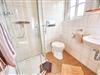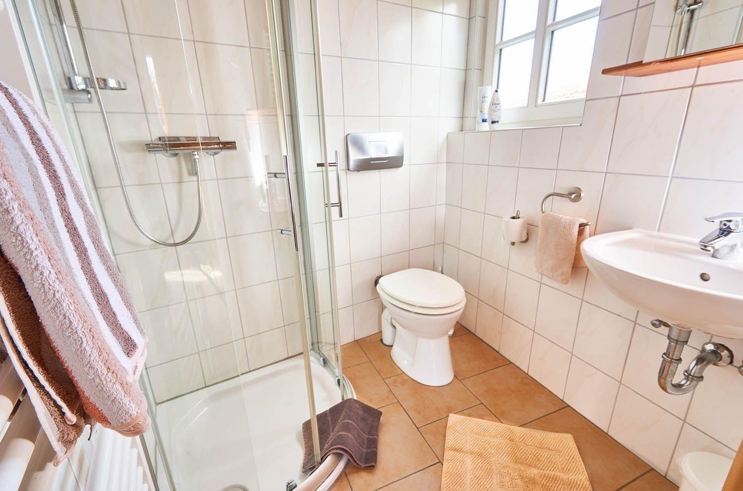 Das Tageslichtbad wurde modern gestaltet. Die Eckdusche wird von einer Glaskabine umschlossen. WC und Waschbecken runden die Ausstattung des Bades stimmig ab.