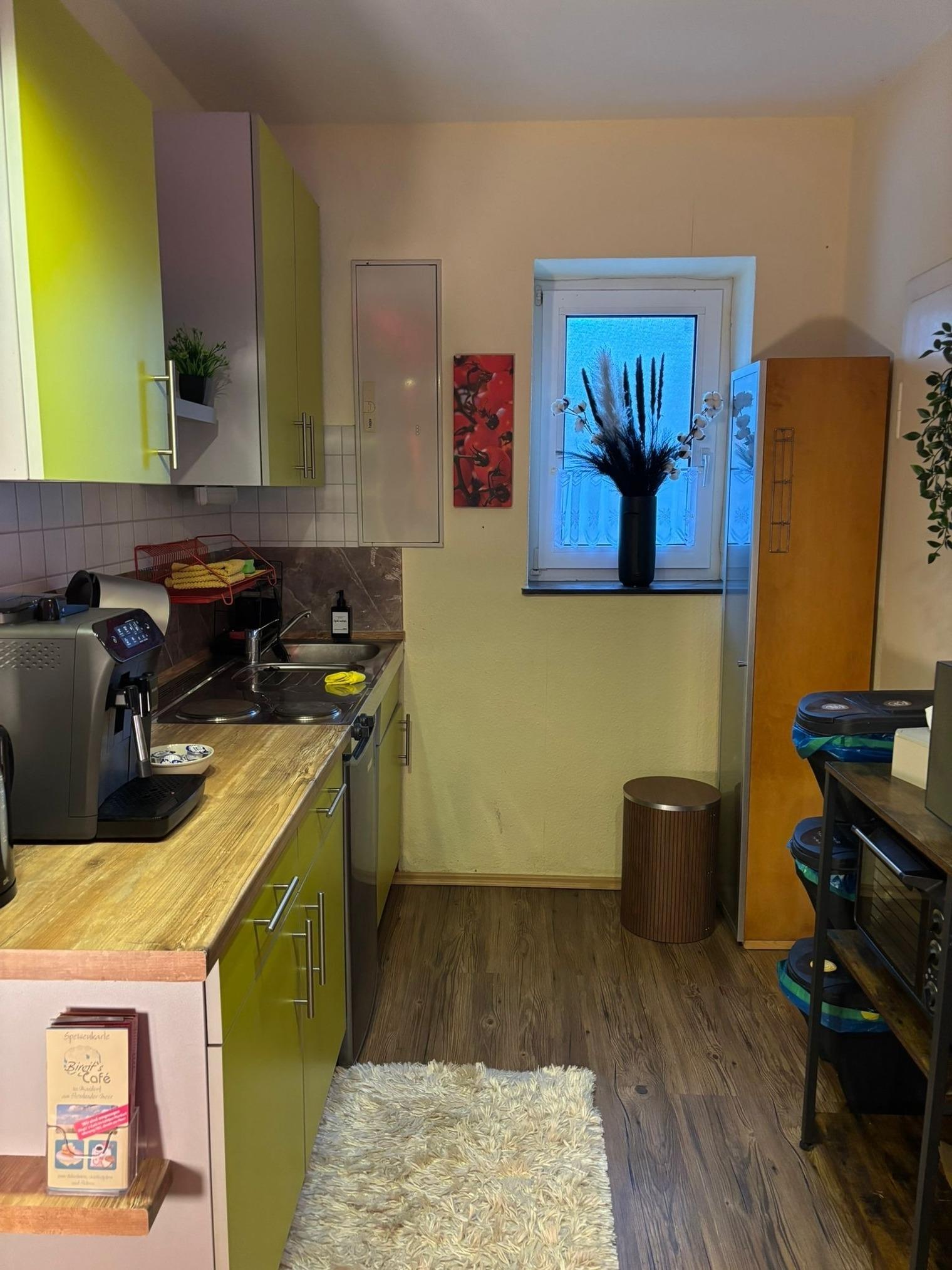 Die Küche ist voll ausgestattet – inklusive Kaffeebohnen, Öl, Zucker und Kaffeesahne. Handtücher, Bademäntel und kleine Annehmlichkeiten liegen bereit. Eigenes Badezimmer mit Dusche und WC ist ebenfalls mit im Apartment vorhanden.