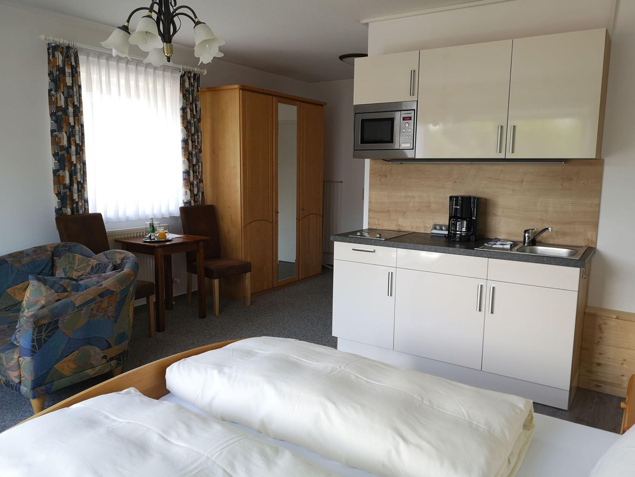 Bei den Appartements und Ferienwohnungen bieten wir eine komplett ausgestattete Küchenzeile mit Ceran-Kochfeld, Kühlschrank mit Gefrierfach, Kaffeemaschine, Wasserkocher und Toaster. Die Appartements verfügen zusätzlich noch über eine Mikrowelle. Bademäntel bieten wir auf Wunsch gegen eine geringe Gebühr an.