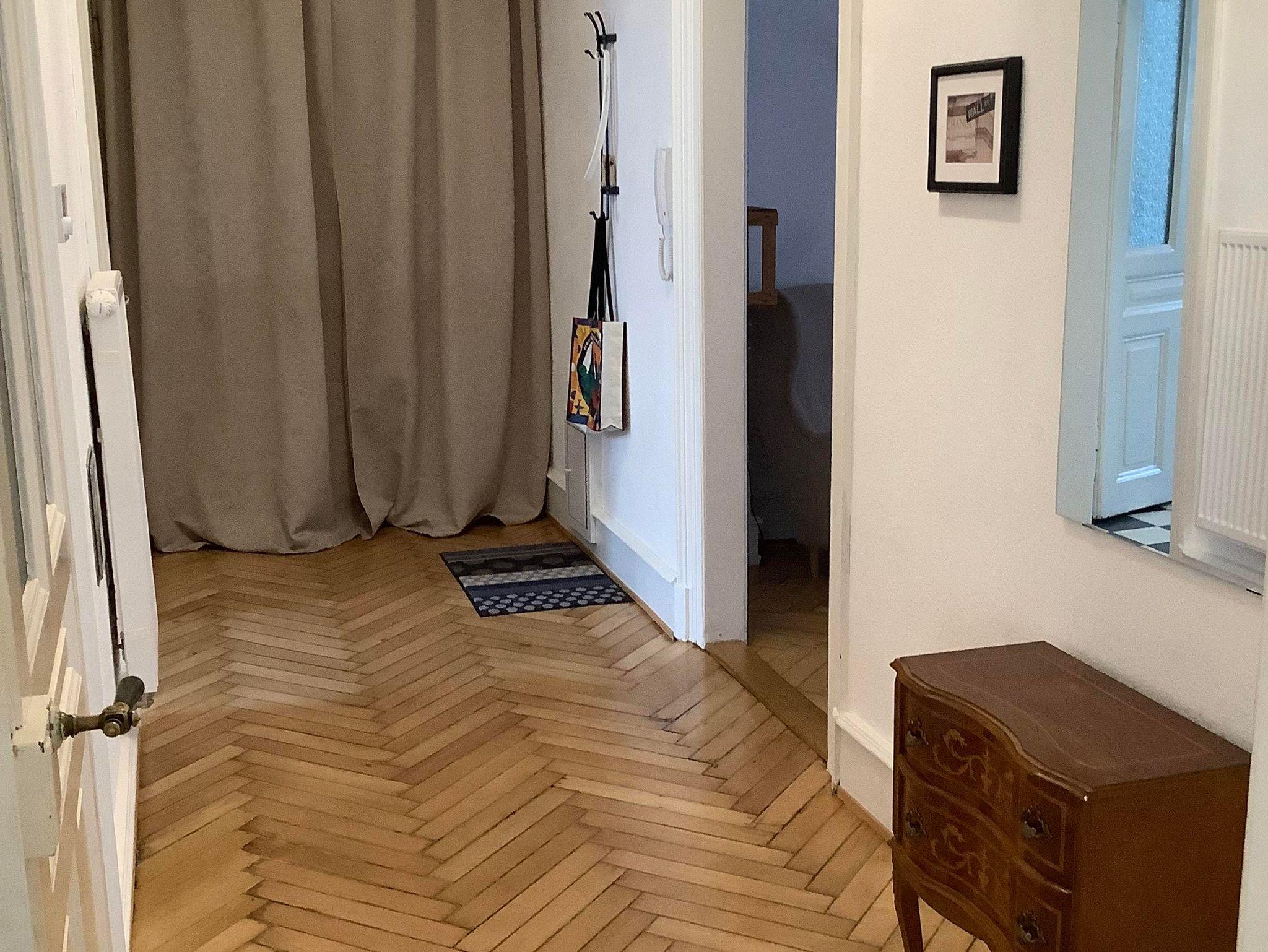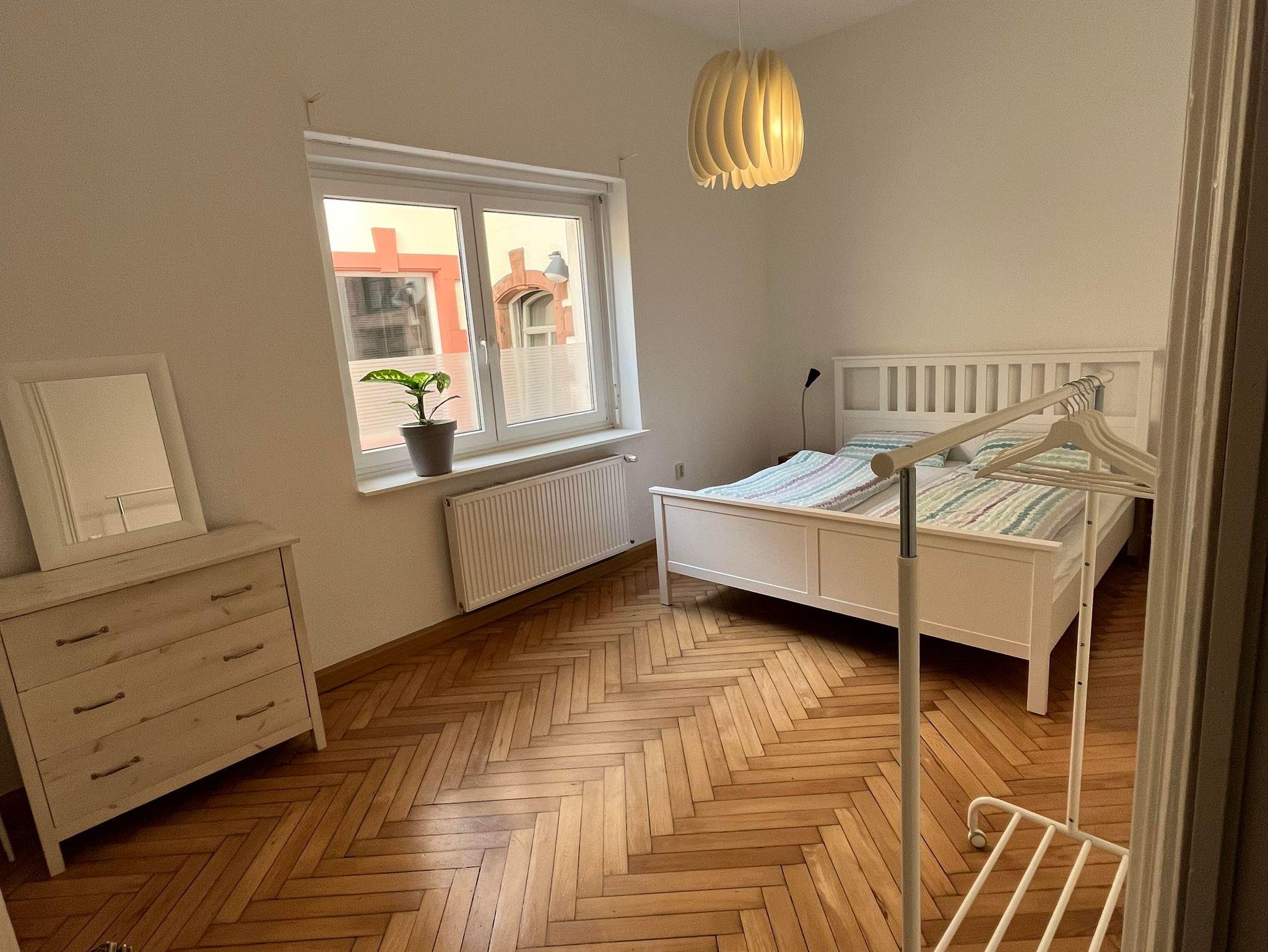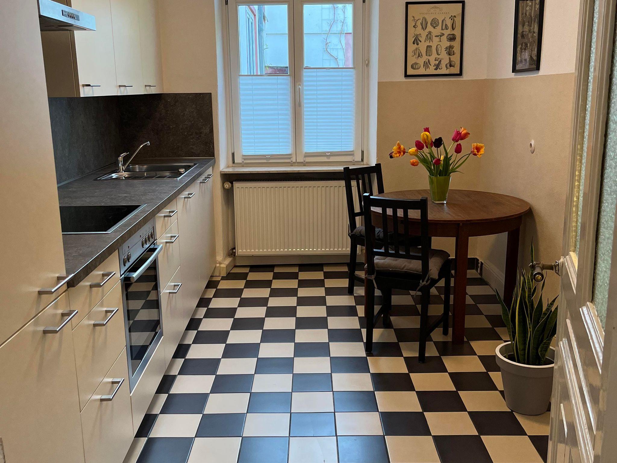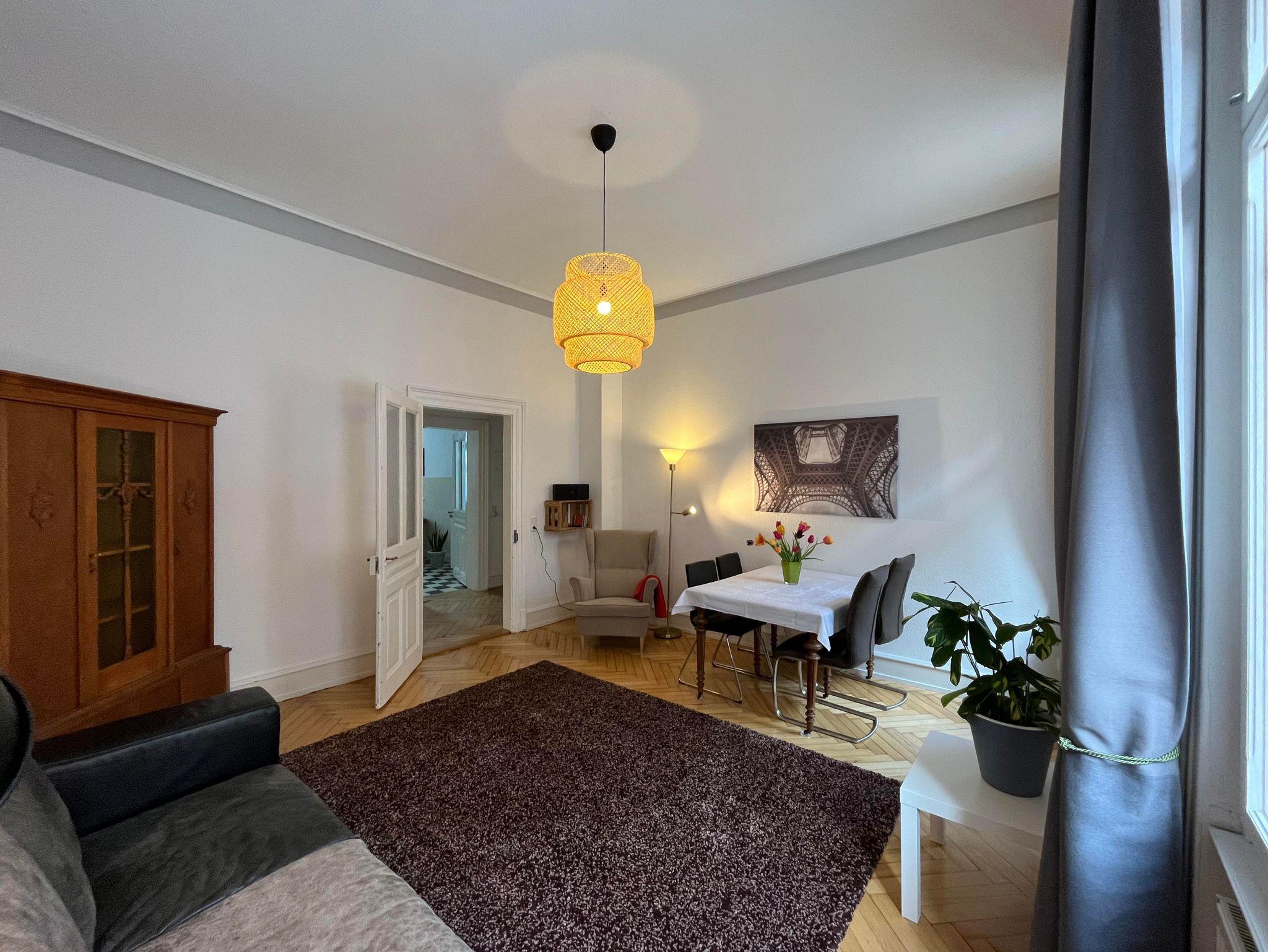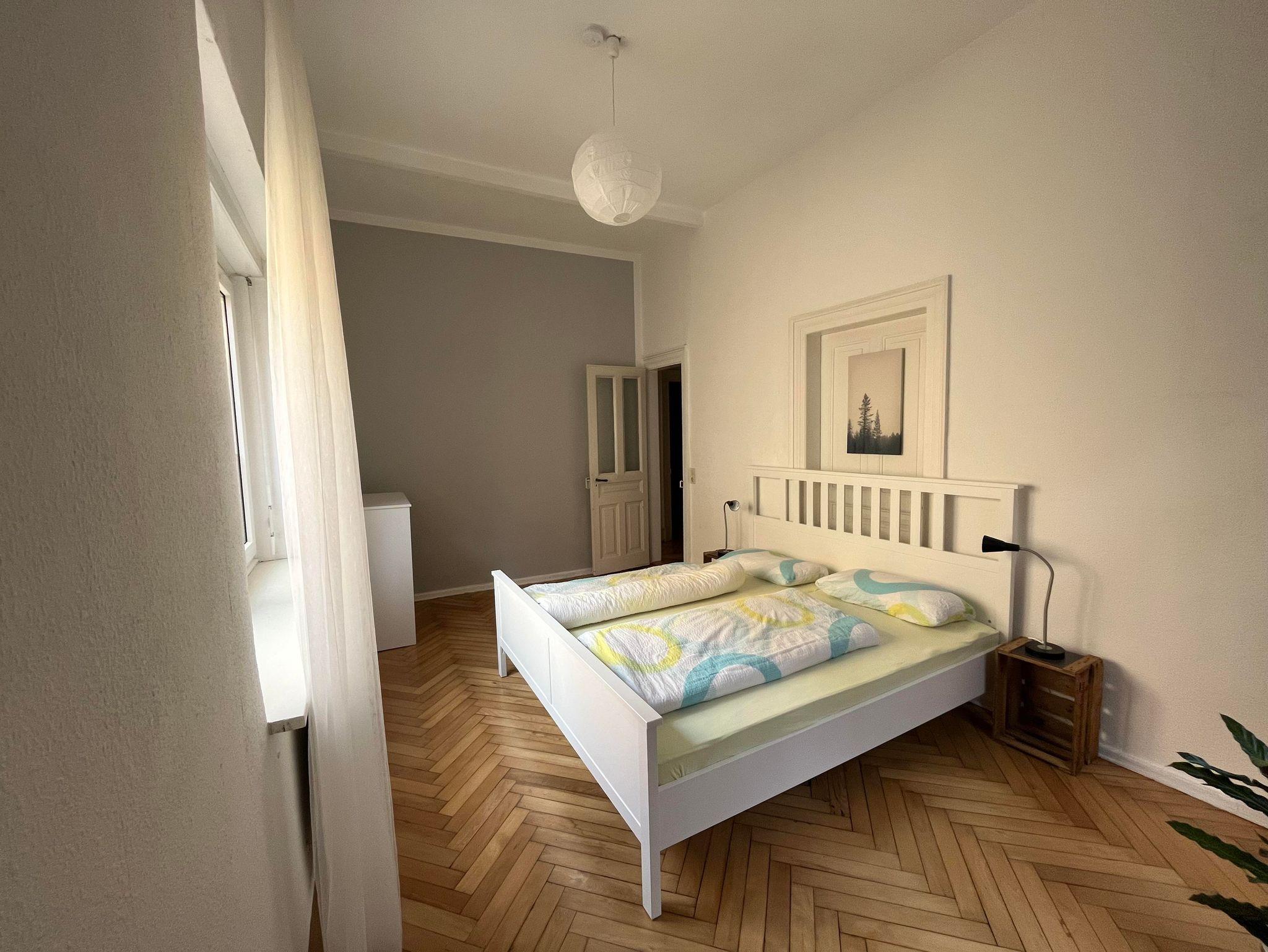 Das denkmalgeschützte Haus mit hohen Decken und dem ursprünglichen Holzparkett ist ein ehemaliges Weingut von 1888. Die 80 m2 geräumige Ferienwohnung im Hochparterre verfügt über eine voll ausgestattete Küchenzeile mit Spülmaschine und Essbereich. Zwei Schlafzimmer mit jeweils einem Doppelbett (1,80x2m) laden zum Ausruhen ein. Das Wohnzimmer mit Essbereich ermöglicht Zeit zum Entspannen und Genießen zu finden. Ein großes Badezimmer mit Badewanne rundet die Unterkunft ab.