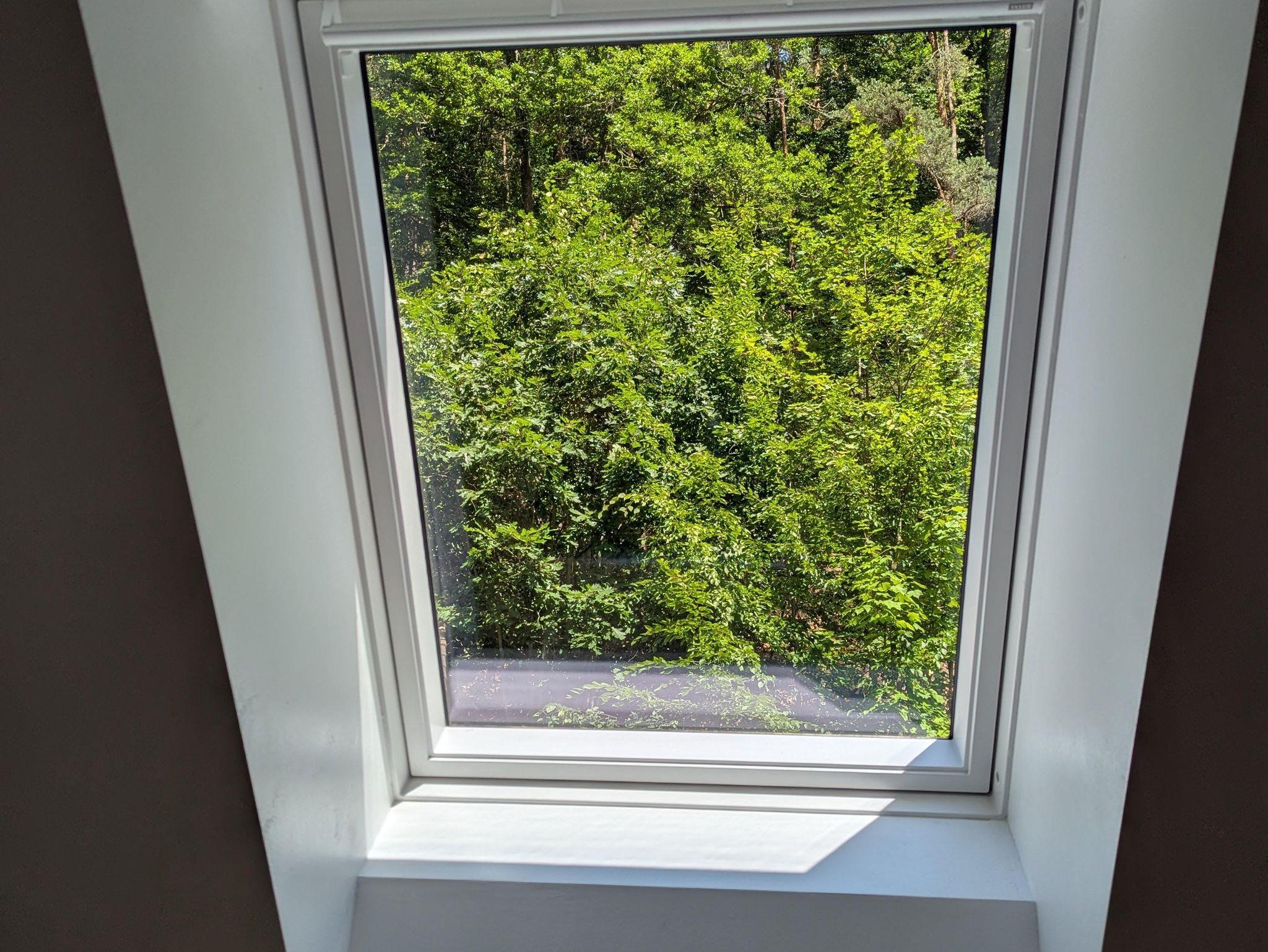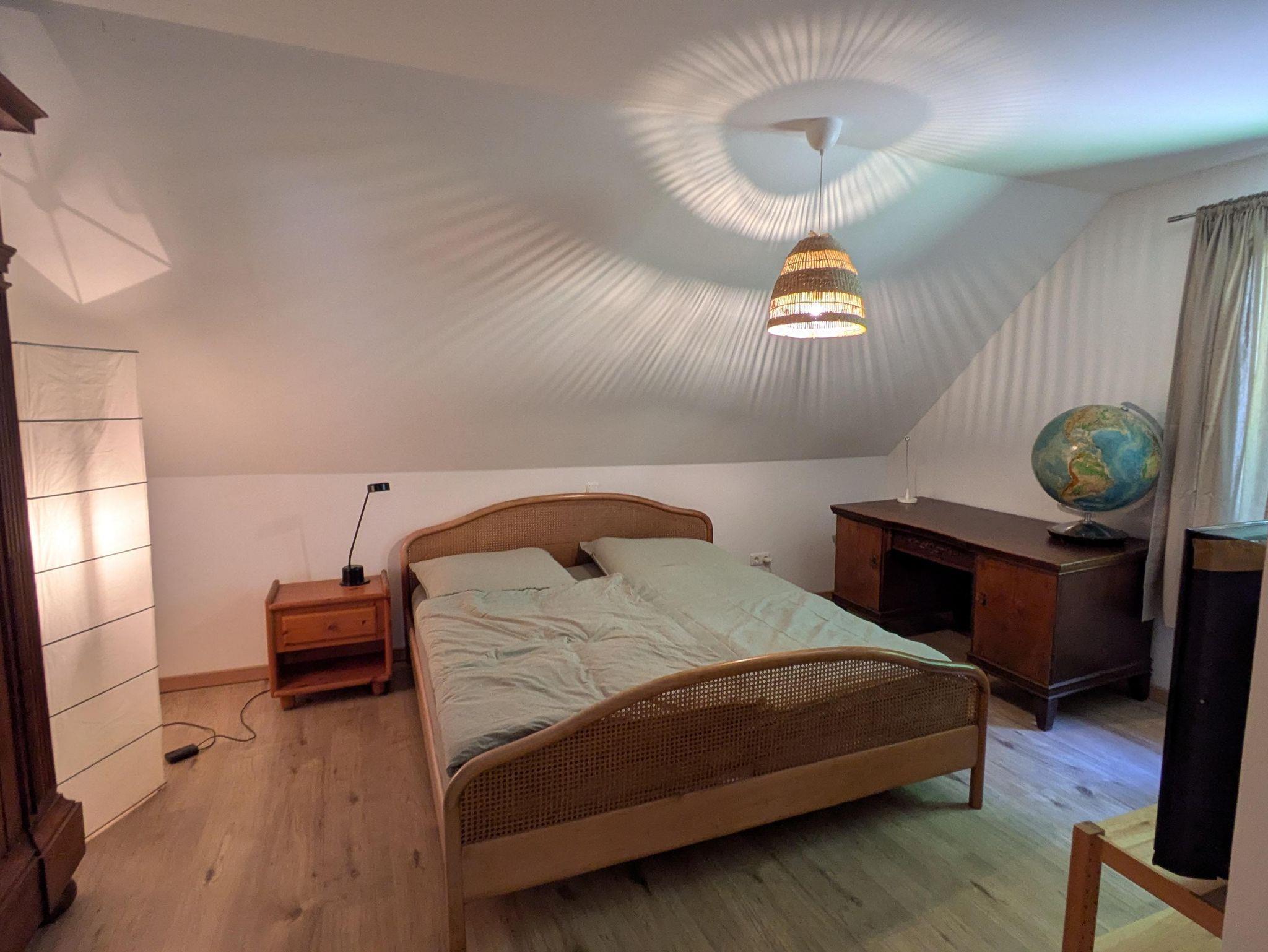 • 1 Schlafzimmer mit Doppelbett (1,80 m Breite) und Schreibtisch mit Blick ins Grüne