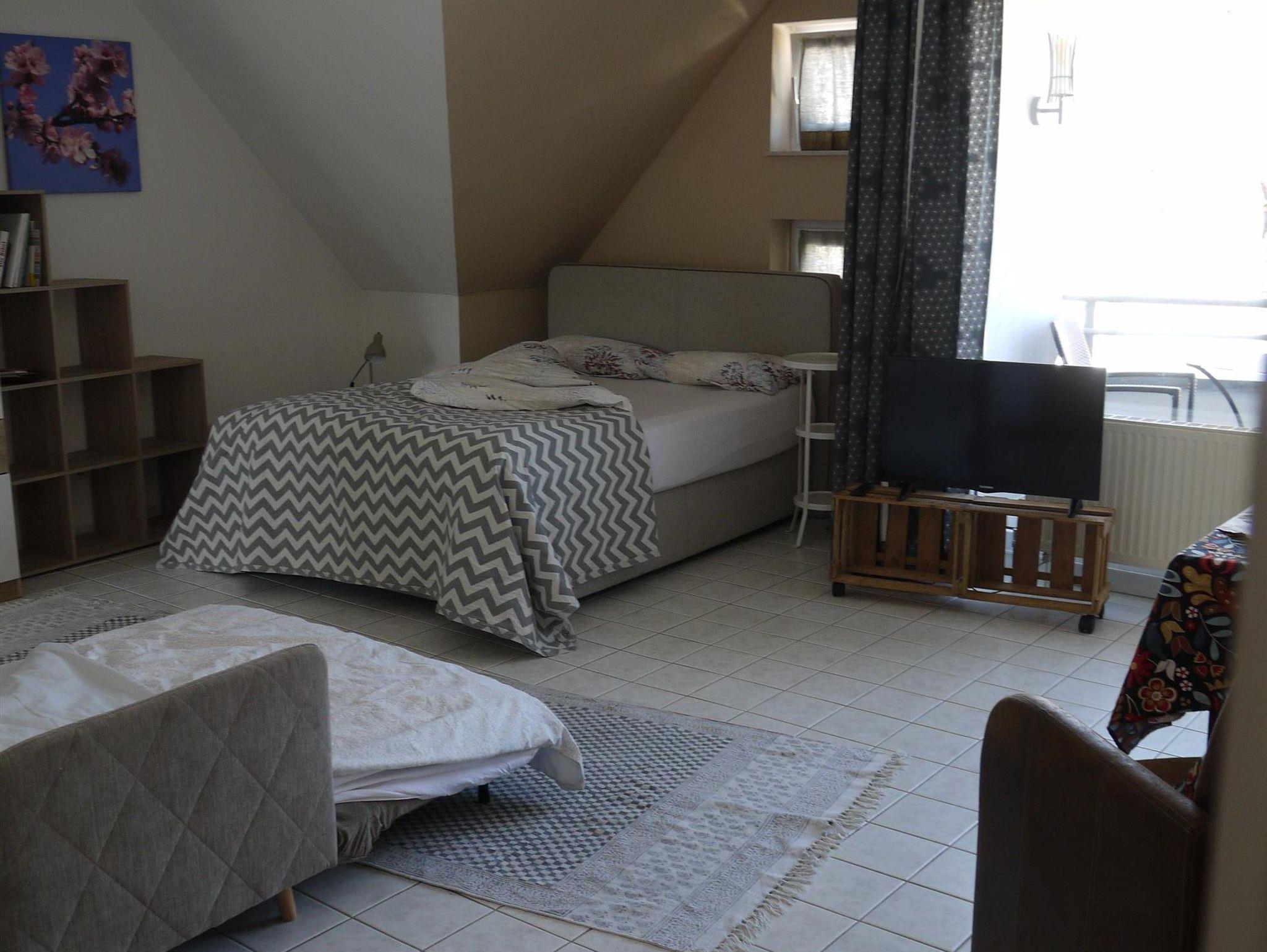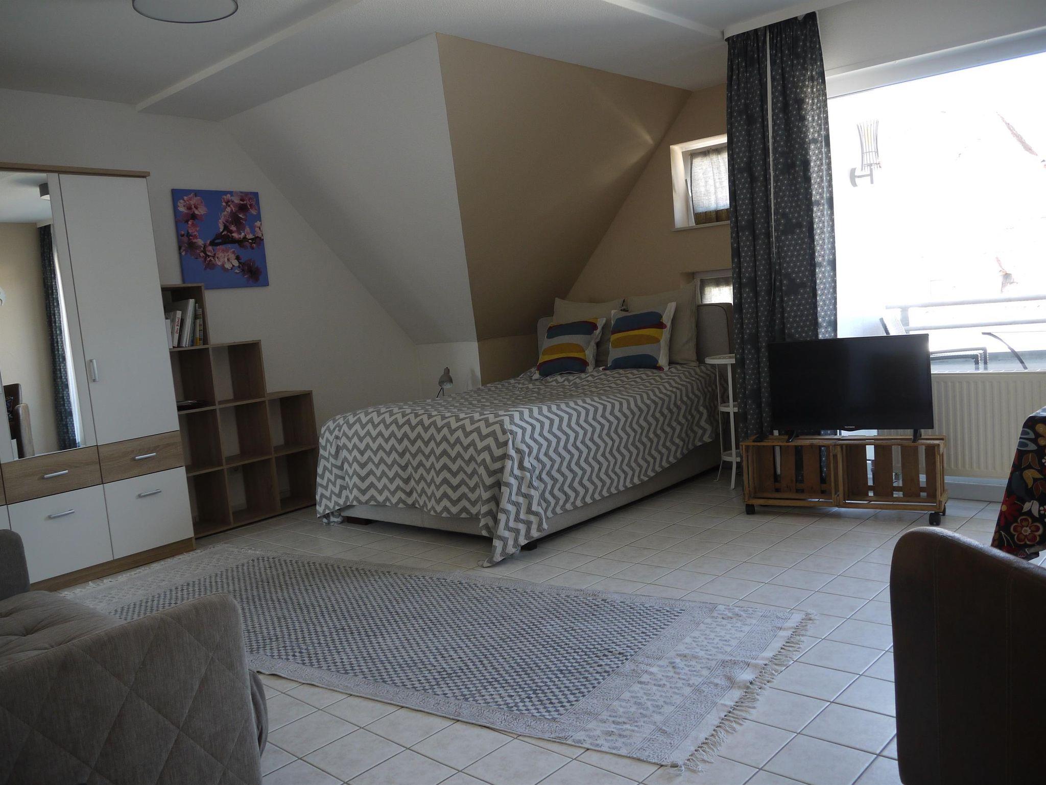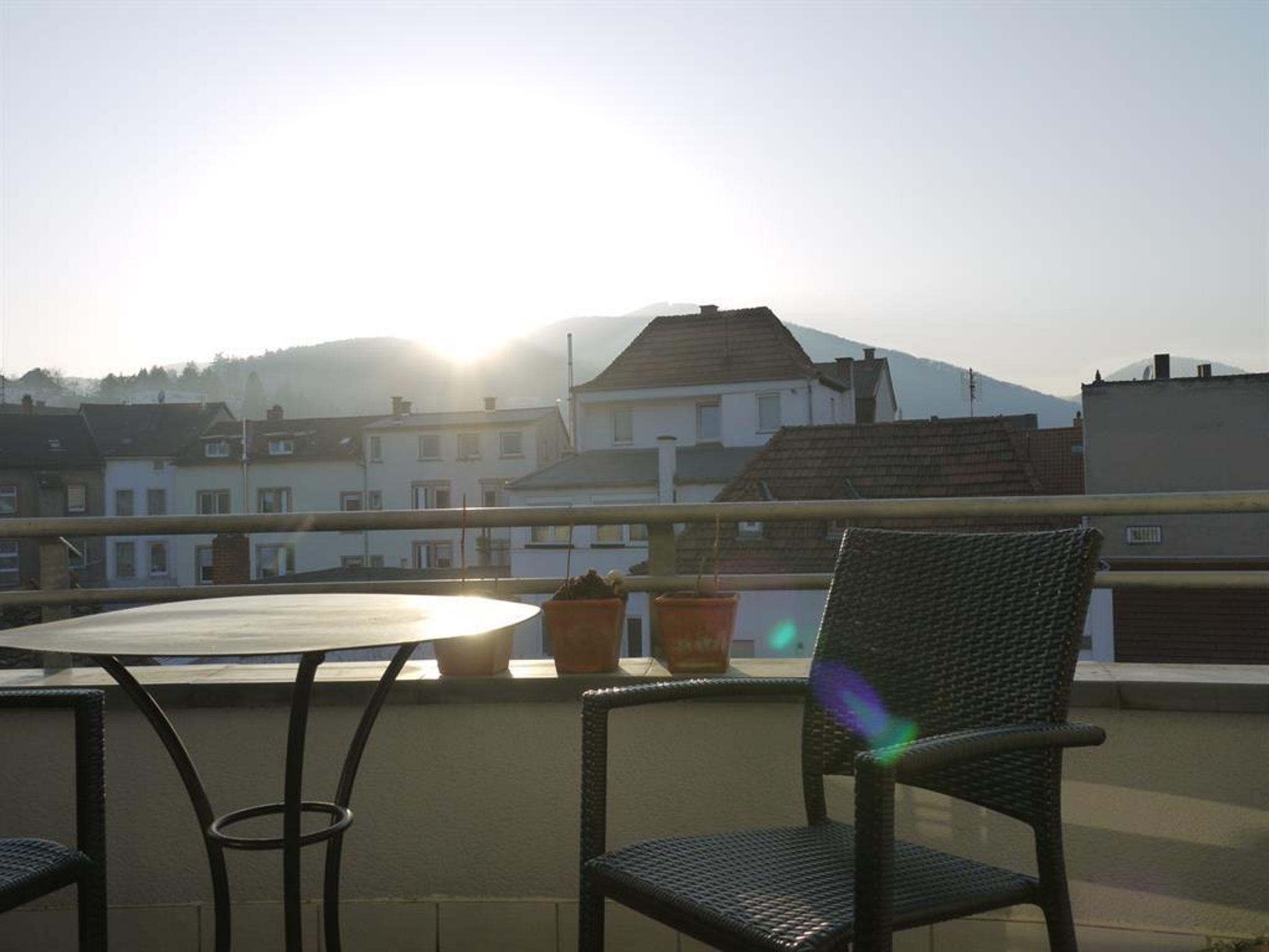 Die Ferienwohnung besteht aus einem Appartement mit separatem Duschbad mit Tageslicht, und einem abgetrennten Küchenbereich. Die Küche ist neuwertig mit Kühlschrank, Wasserkocher, Kaffeemaschine, Toaster, Mikrowelle und Cerankochfeld. Spüllappen, Geschirrhandtuch und Handtuch finden Sie dort ebenfalls. Das Fenster zeigt einen wunderschönen Ausblick auf das Wohnzimmer der Stadt, den Saalbau. Das Duschbad mit Tageslicht verfügt über Dusche, WC und Handwaschbecken. Die Handtücher liegen für unsere Gäste schon bereit. Im hellen Wohn- und Schlafraum befinden sich 2 gemütliche Sessel vor dem Panoramafenster mit Ausblick über die Dächer der Stadt, und zum Pfälzer Wald mit dem Zugang zu einem kleinen aber feinen Balkon. Ein Glas Wein beim Sonnenuntergang, lässt sich hier herrlich genießen. Die Nacht verbringen Sie in einem frisch bezogenen neuwertigen Boxspringbett, Größe 140 x 200 cm. Ablagetischchen und Nachttischlampen sorgen für den Komfort. Es steht ein neuwertiger Kleiderschrank mit Spiegel, ein praktisches Regal für die kleinen Utensilien, ein Fernseher und eine extravagante Garderobe für Sie bereit. In der Wohnung haben Sie freien Zugang zu W-lan. Wir freuen uns auf ihren Besuch und hoffen dass Sie sich wohl fühlen.