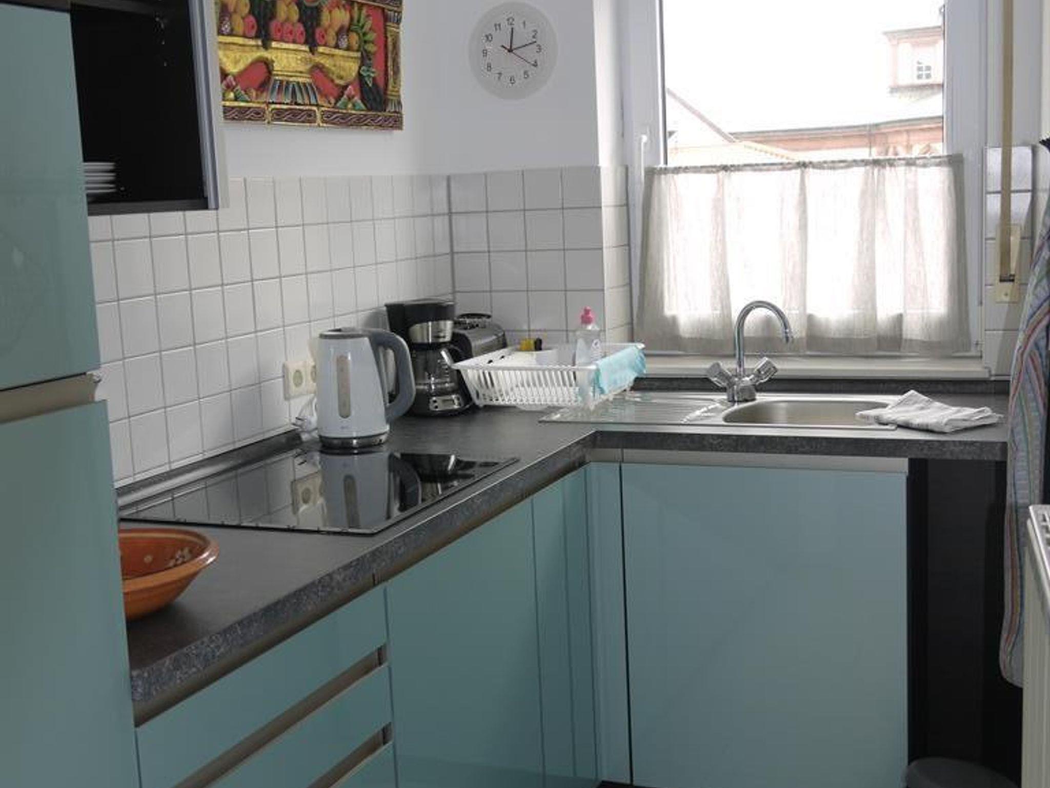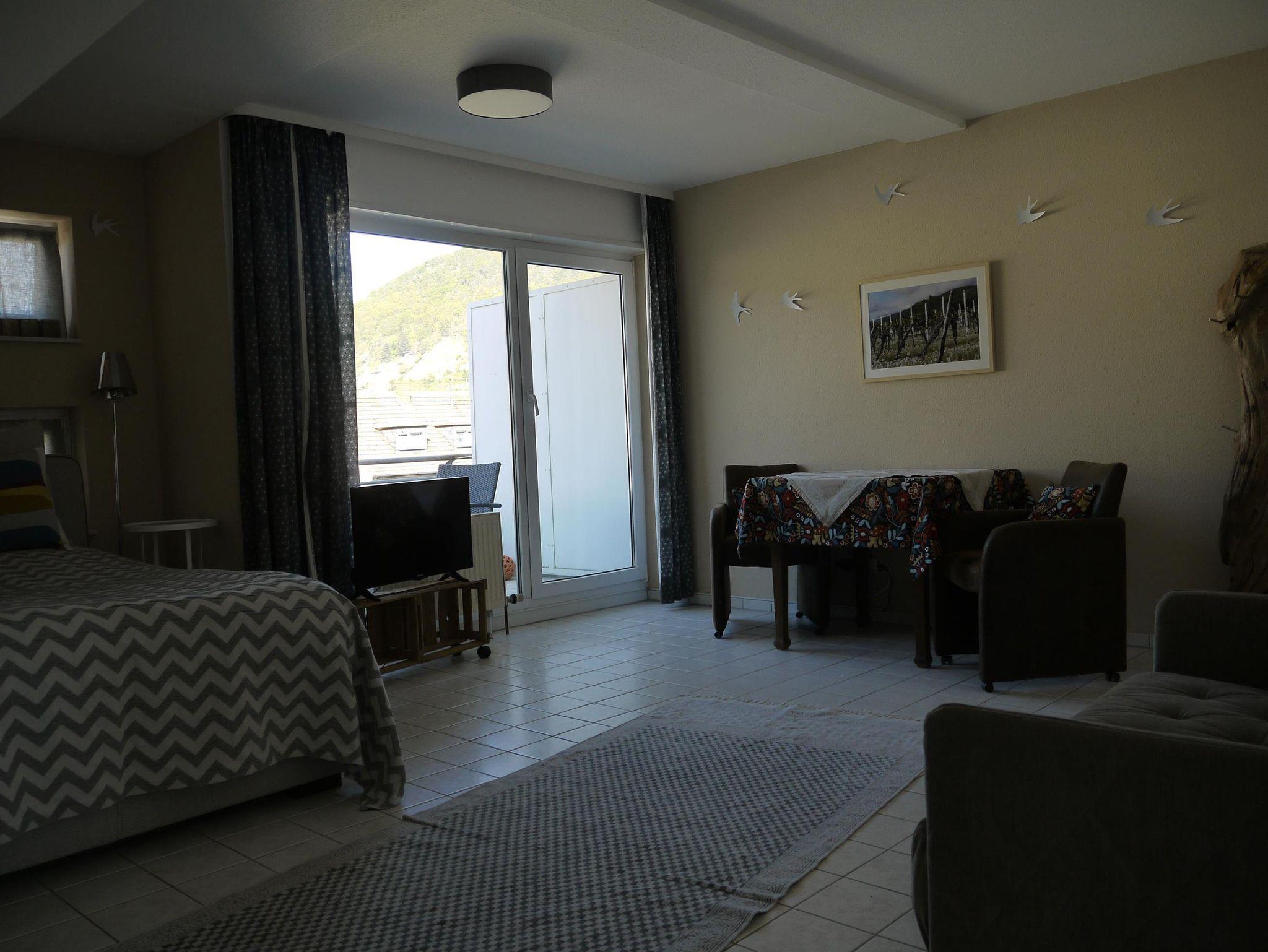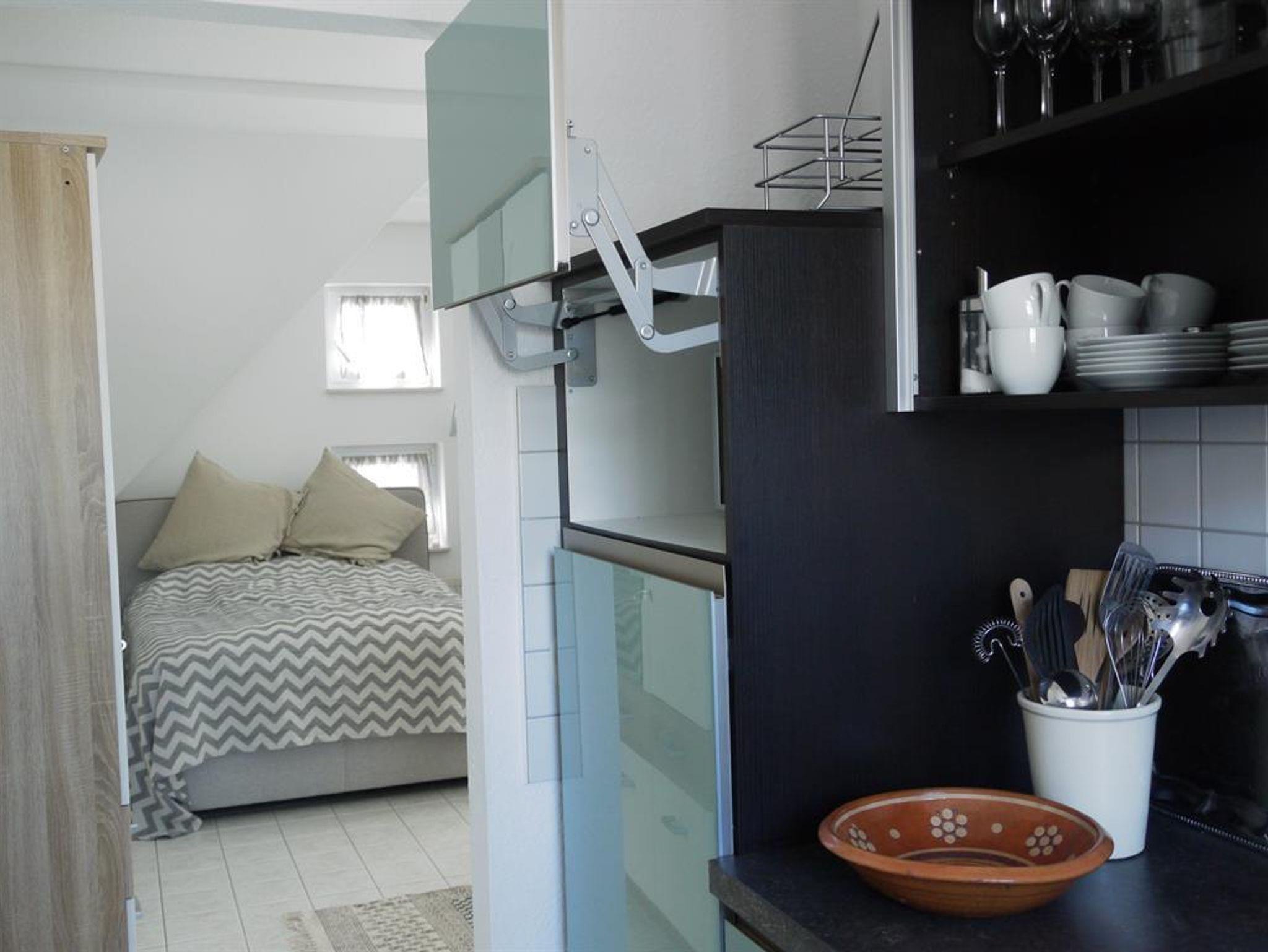 Die Ferienwohnung besteht aus einem Appartement mit separatem Duschbad mit Tageslicht, und einem abgetrennten Küchenbereich. Die Küche ist neuwertig mit Kühlschrank, Wasserkocher, Kaffeemaschine, Toaster, Mikrowelle und Cerankochfeld. Spüllappen, Geschirrhandtuch und Handtuch finden Sie dort ebenfalls. Das Fenster zeigt einen wunderschönen Ausblick auf das Wohnzimmer der Stadt, den Saalbau. Das Duschbad mit Tageslicht verfügt über Dusche, WC und Handwaschbecken. Die Handtücher liegen für unsere Gäste schon bereit. Im hellen Wohn- und Schlafraum befinden sich 2 gemütliche Sessel vor dem Panoramafenster mit Ausblick über die Dächer der Stadt, und zum Pfälzer Wald mit dem Zugang zu einem kleinen aber feinen Balkon. Ein Glas Wein beim Sonnenuntergang, lässt sich hier herrlich genießen. Die Nacht verbringen Sie in einem frisch bezogenen neuwertigen Boxspringbett, Größe 140 x 200 cm. Ablagetischchen und Nachttischlampen sorgen für den Komfort. Es steht ein neuwertiger Kleiderschrank mit Spiegel, ein praktisches Regal für die kleinen Utensilien, ein Fernseher und eine extravagante Garderobe für Sie bereit. In der Wohnung haben Sie freien Zugang zu W-lan. Wir freuen uns auf ihren Besuch und hoffen dass Sie sich wohl fühlen.