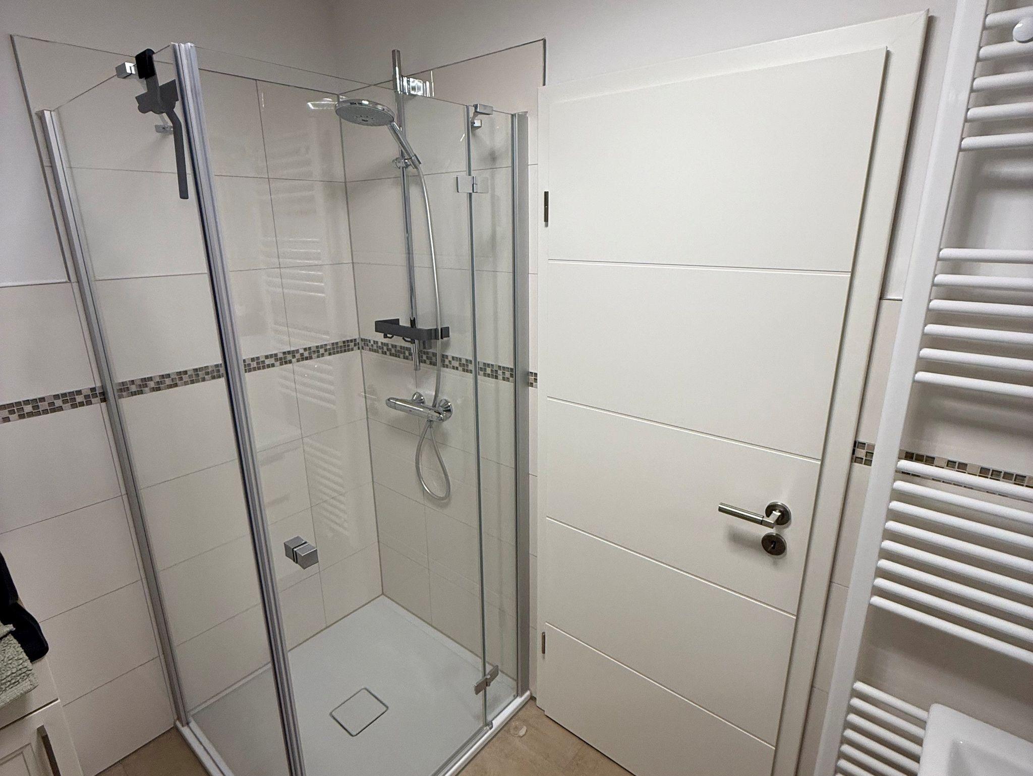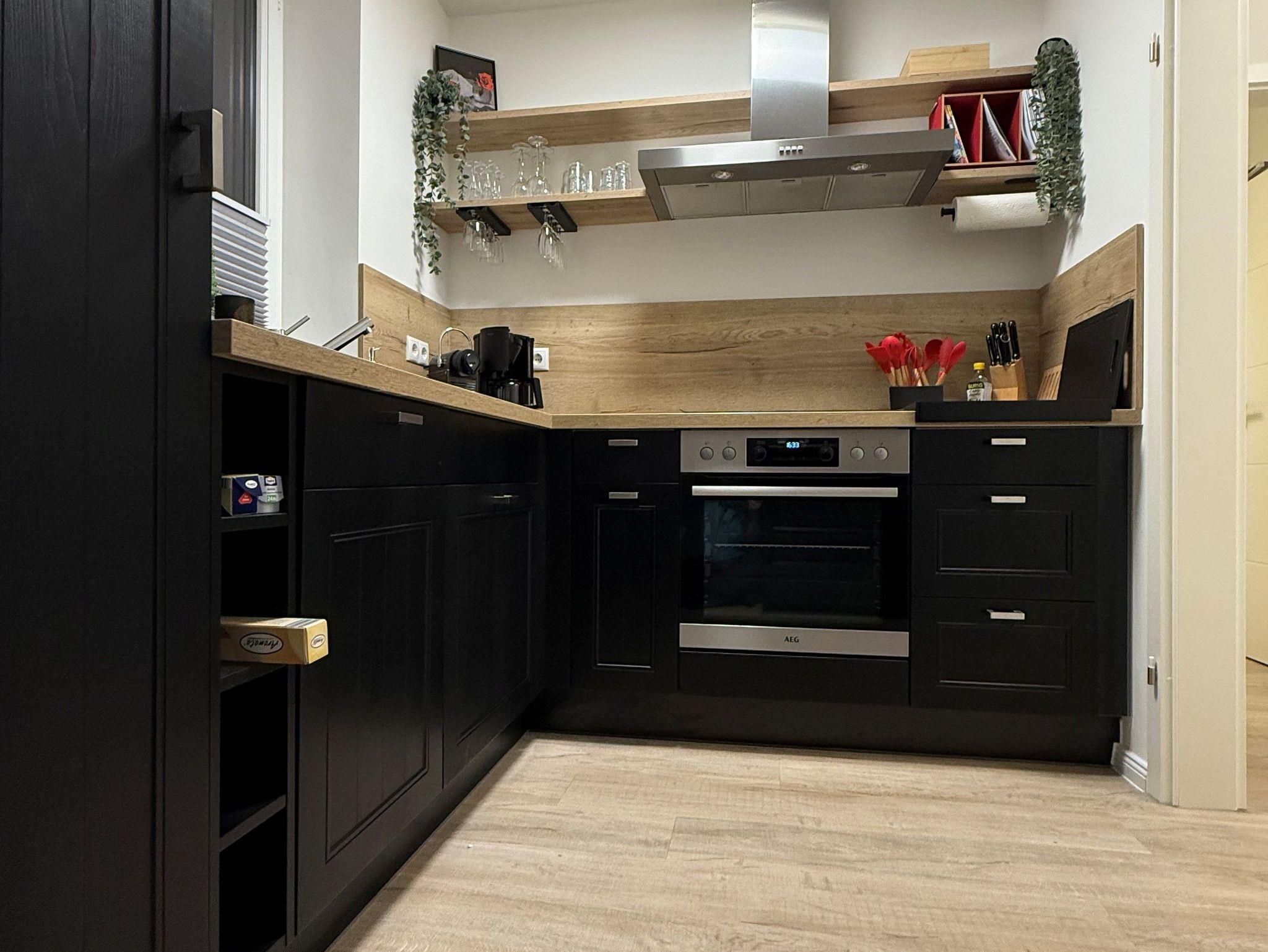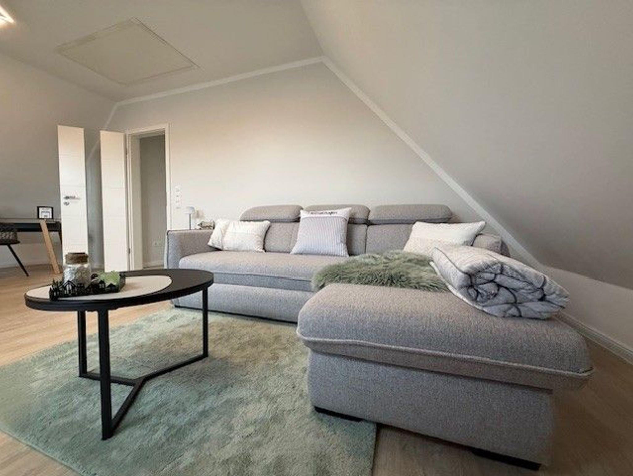 Flur, Schlafzimmer mit Boxspringbett (1,80 m x 2,00 m), eine separate Küche (Geschirrspüler und andere elektrische Küchengeräte vorhanden) Wohnzimmer mit Essbereich, Schlafsofa und TV und ein Duschbad mit ebenerdiger Dusche.