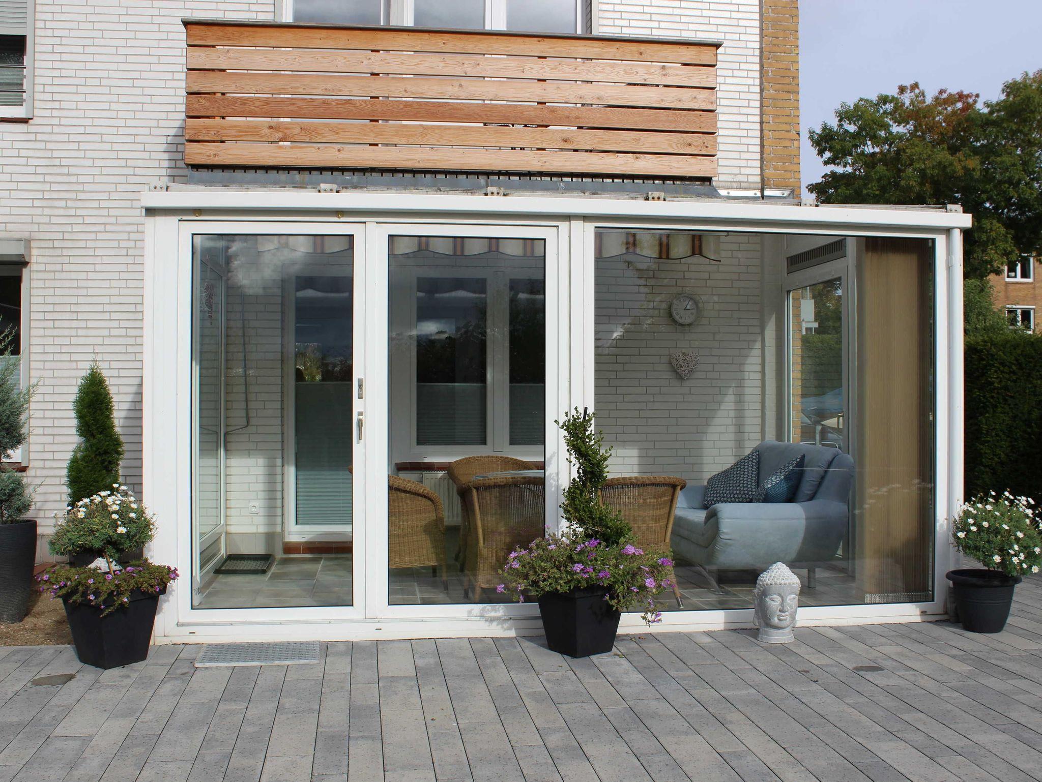 Vom zur Südseite gelegenen Wohnraum gelangen die Gäste in den beheizbaren Wintergarten, der nach Süden ausgerichtet ist. Dieser ist mit Sitzgelegenheiten und einem Tisch ausgestattet. Hier kann man das Frühstück genießen und blickt während dessen in den Garten.
