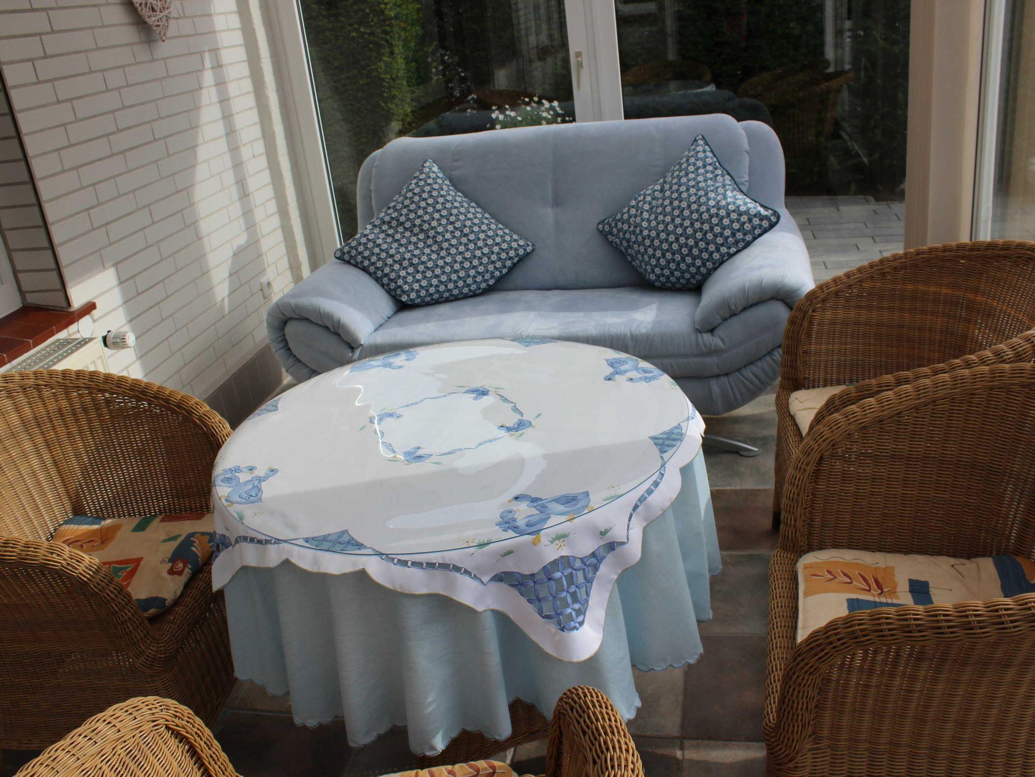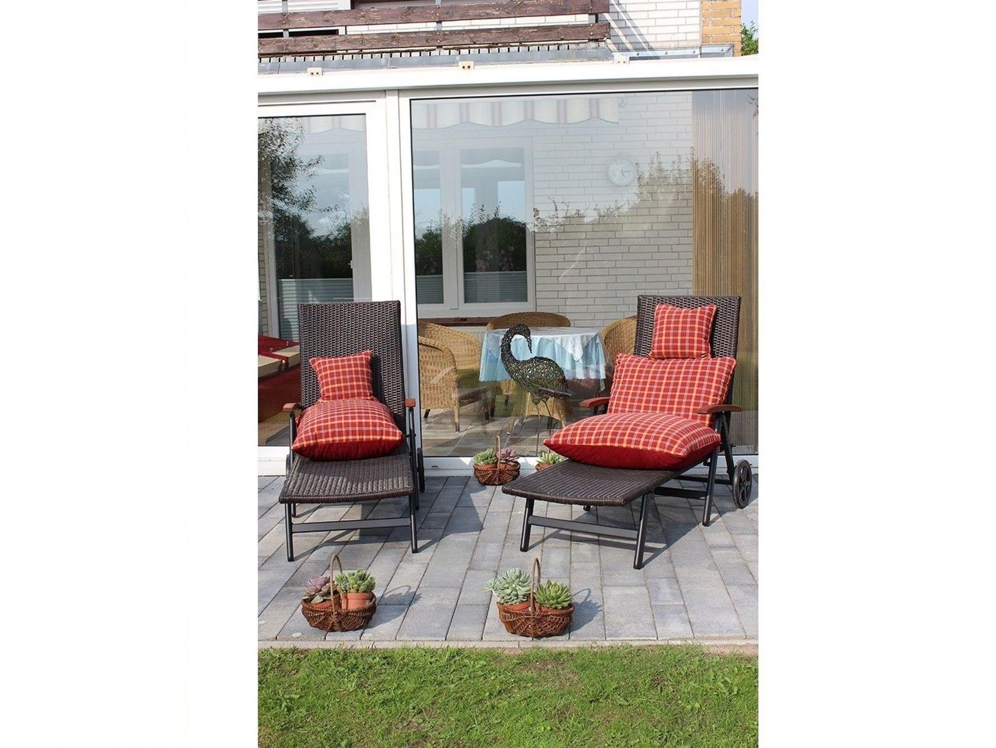 Vor dem Wintergarten befindet sich eine Terrasse. 2 Rollliegen, 4 Gartenstühle mit Auflagen und ein Tisch stehen zu Ihrer Verfügung.