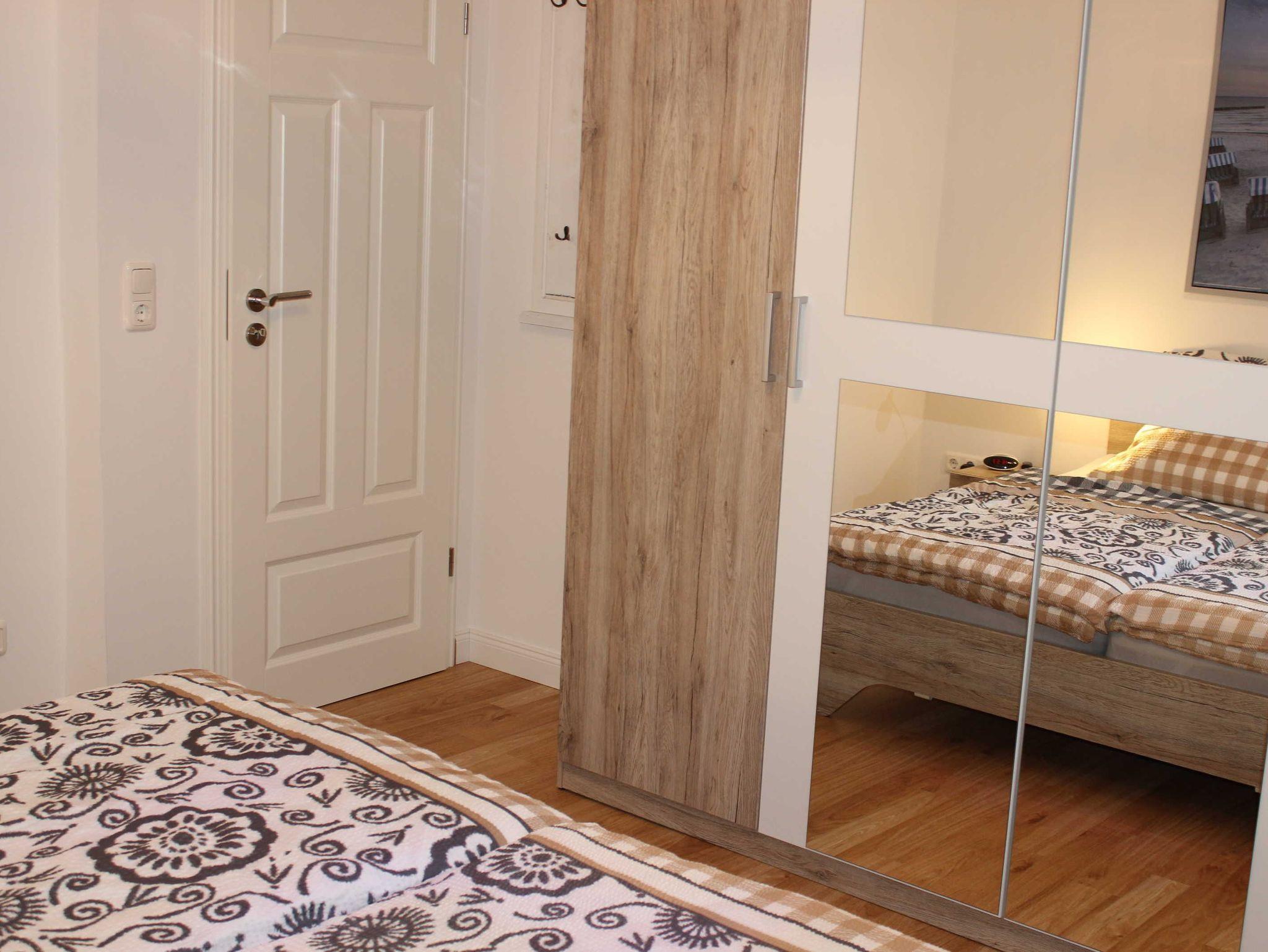 Die Mittags- und Abendsonne strahlt in den Raum. Hier stehen ein Doppelbett (2 x 90 cm x 200 cm) und ein großer Kleiderschrank mit Spiegel.