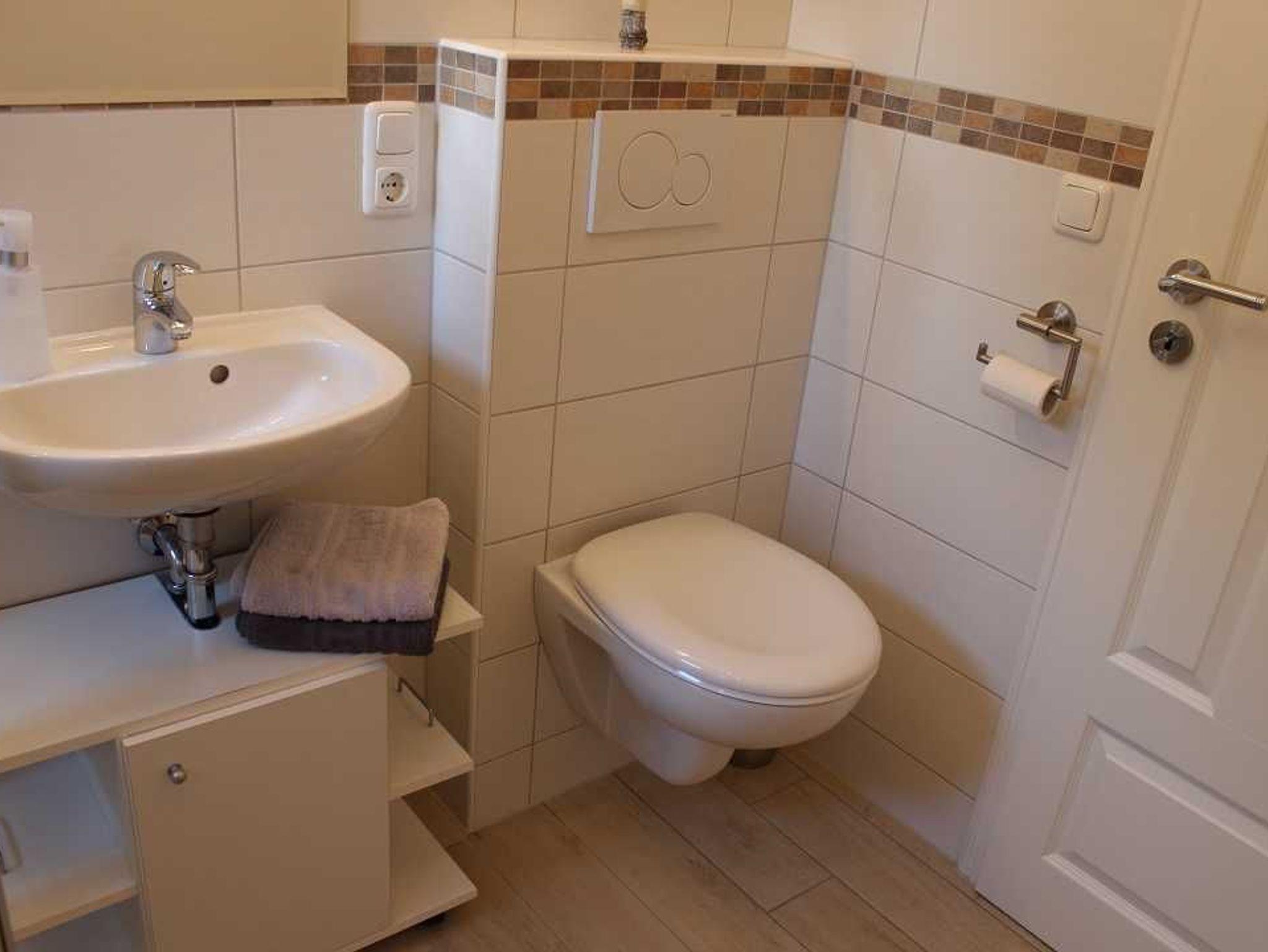 Das geflieste Tageslichtbadezimmer mit Dusche, WC und Waschtisch und modernen Badmöbeln lässt unsere Gäste gut in den Tag starten. Ein Fön ist vorhanden.