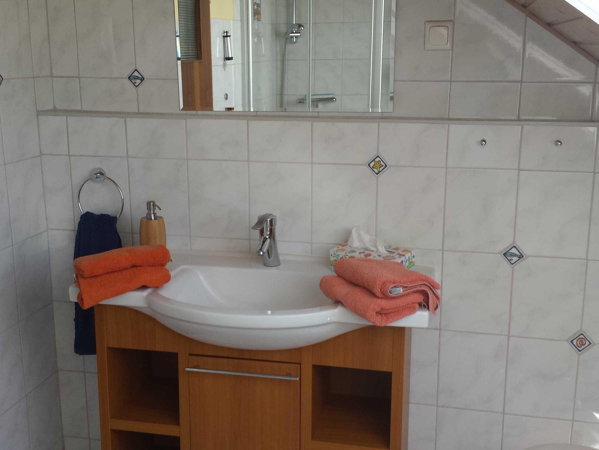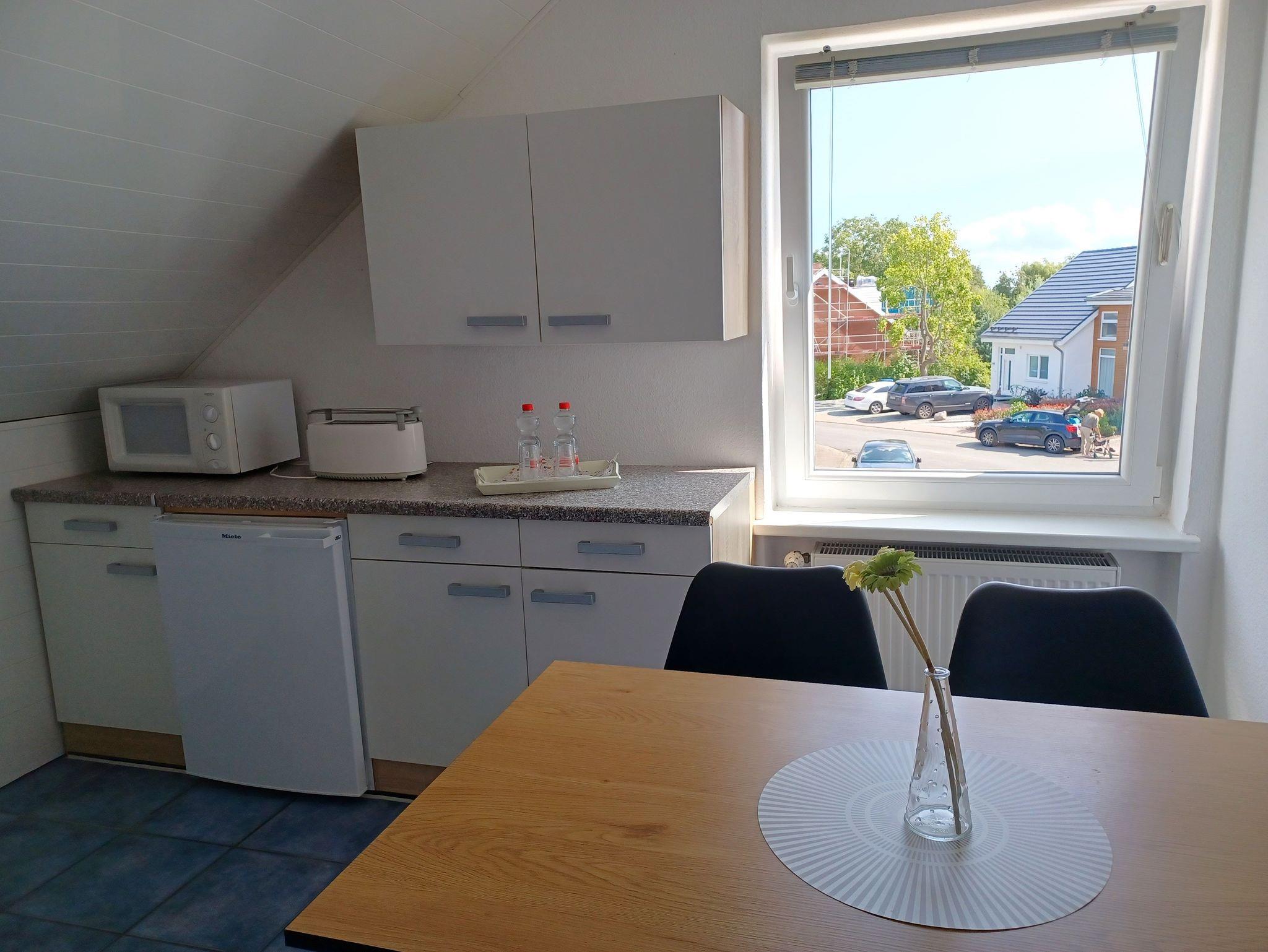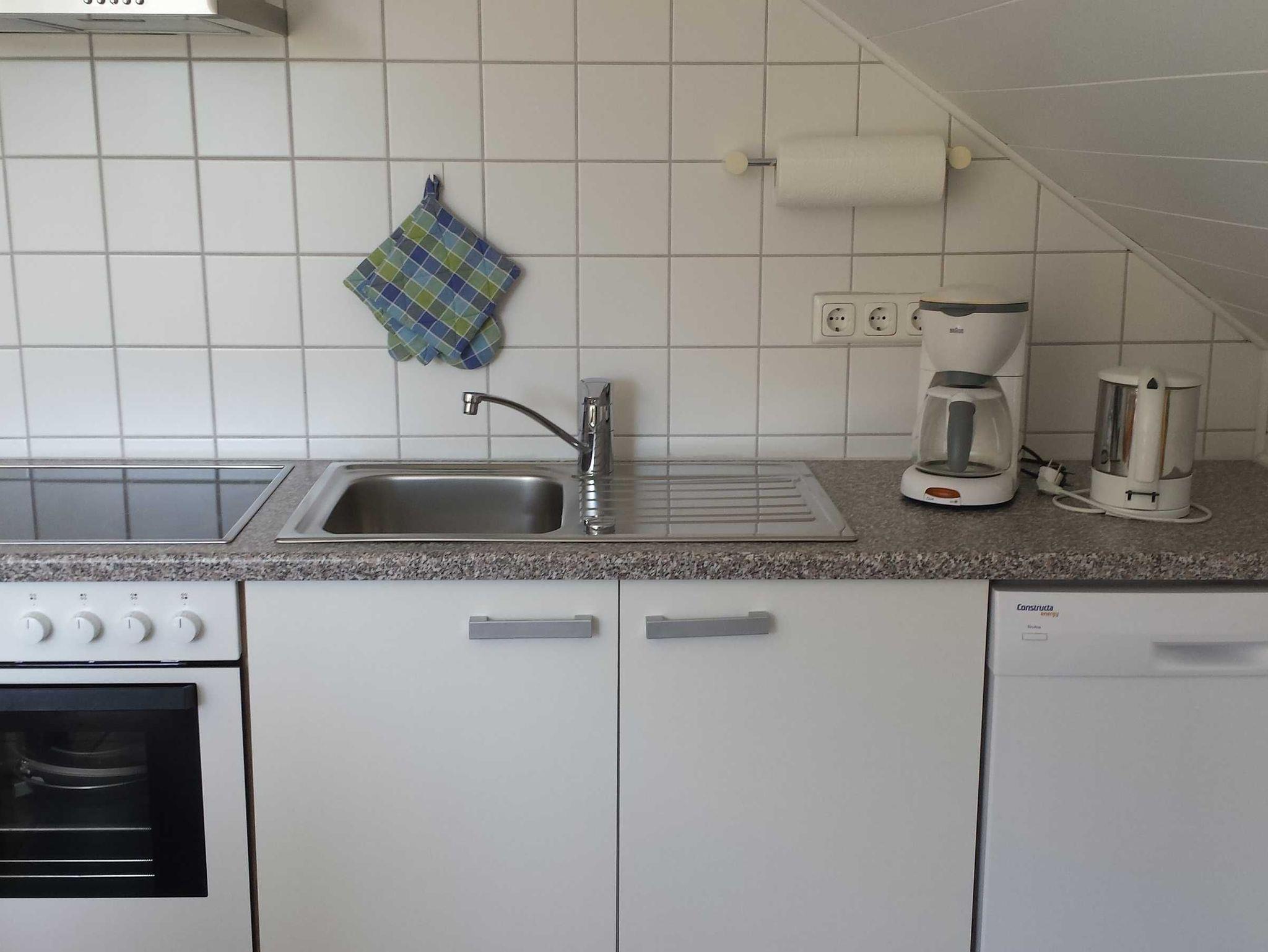 Die separate komplett ausgestattete Küche mit Einbaumöbeln (Herd m. Backofen, Mikrowelle etc.) verfügt natürlich über einen Geschirrspüler und einen Essplatz. Dusche und WC komplettieren die Wohnung. Flur, Küche und Bad sind gefliest. Bettwäsche incl., Handtücher können für 11,00 EUR pro Aufenthalt gemietet werden.