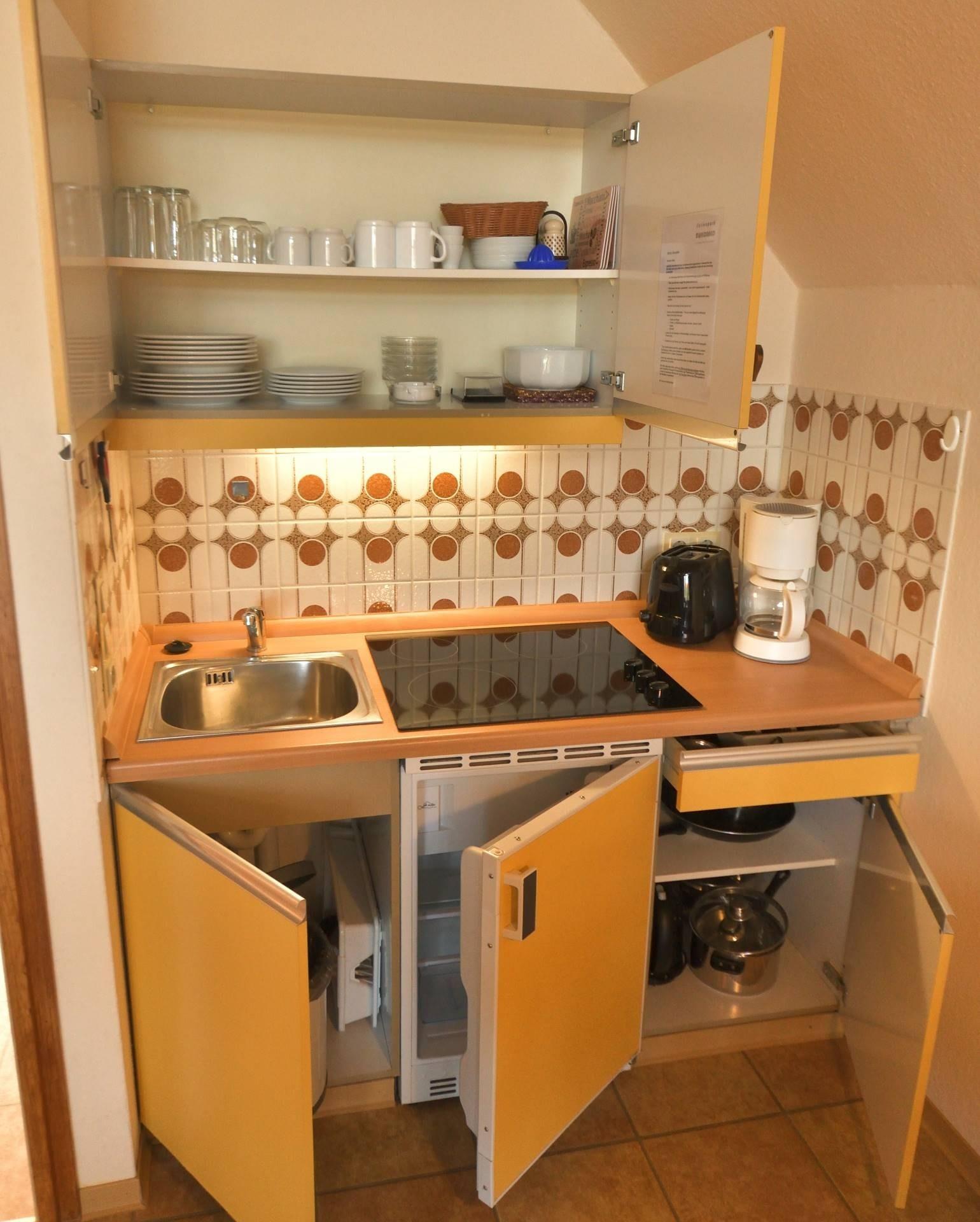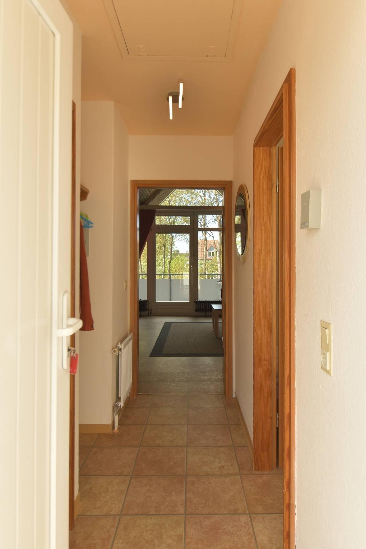 Vom Eingang Ihres Appartements gelangen Sie über einen kleinen Flur in den großzügigen Wohnraum (mit Südloggia), mit Schlafsofa (180 × 200 cm, einteilig) für zwei Personen, Essecke und Küchenzeile mit Kühlschrank, Elektroherd, Kaffeemaschine, Toaster, Wasserkocher, Geschirr und Besteck. Vom Flur erreichen Sie auch ein kleines Schlafzimmer mit 2 Einzelbetten (90 × 190 cm) sowie ein Bad mit Waschplatz, Dusche und WC. SAT-TV und Radio sowie ein Pkw-Stellplatz gehören selbstverständlich zu jedem Appartement.