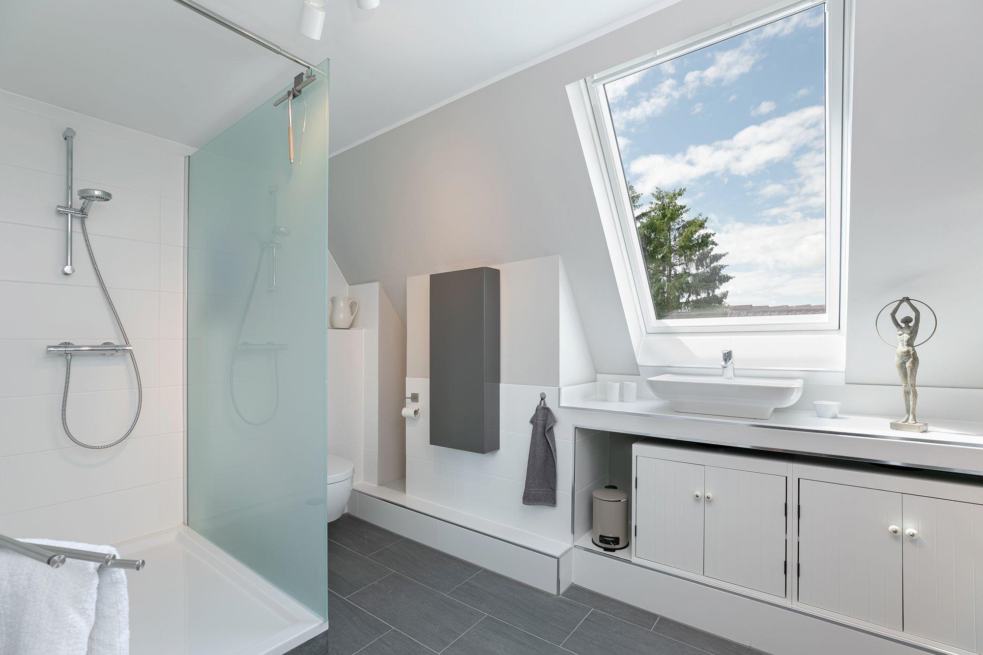 Über eine Treppe im Eingangsbereich erreichen Sie die 1. Etage. Hier befinden sich 2 separate Schlafräume: Ein Schlafzimmer mit Doppelbett (160x200 cm) und Kleiderschrank und ein weiteres Schlafzimmer mit Doppelbett (180x200 cm), Flachbildfernseher und einem weiteren Kleiderschrank. Von einem Schlafzimmer aus gelangen Sie in das separate Badezimmer mit Dusche, WC, beheizbarer Handtuchheizung und Stauraum für Ihre Badutensilien. Über eine Treppe im Flur der 1. Etage erreichen Sie den Spitzboden mit zwei getrennt stehenden Einzelbetten (je 90x200 cm), einem Nachttisch sowie einem Veluxfenster. Alle Schlafräume lassen sich zur Nacht mit elektrischen Außenrolladen angenehm verdunkeln.