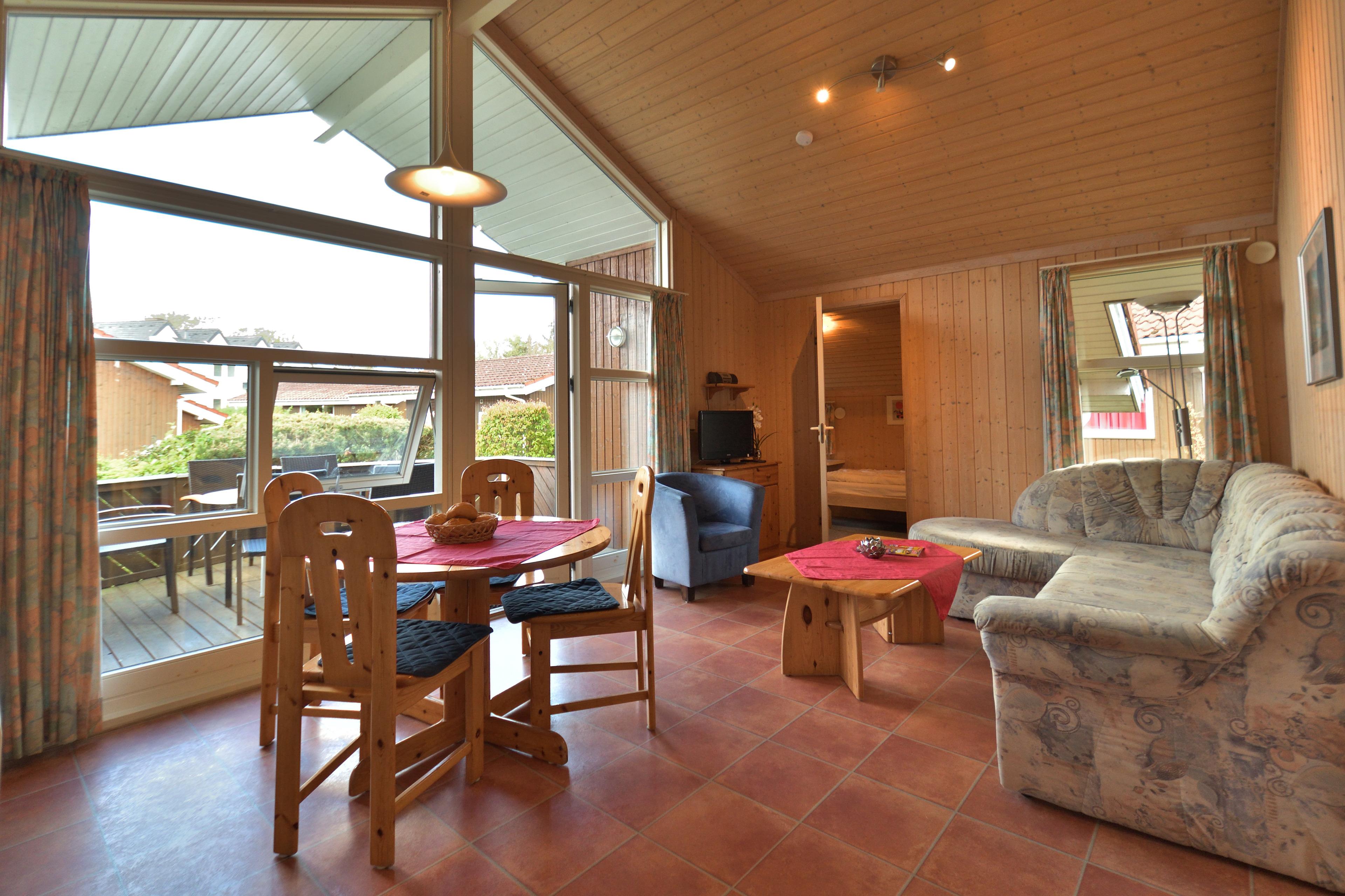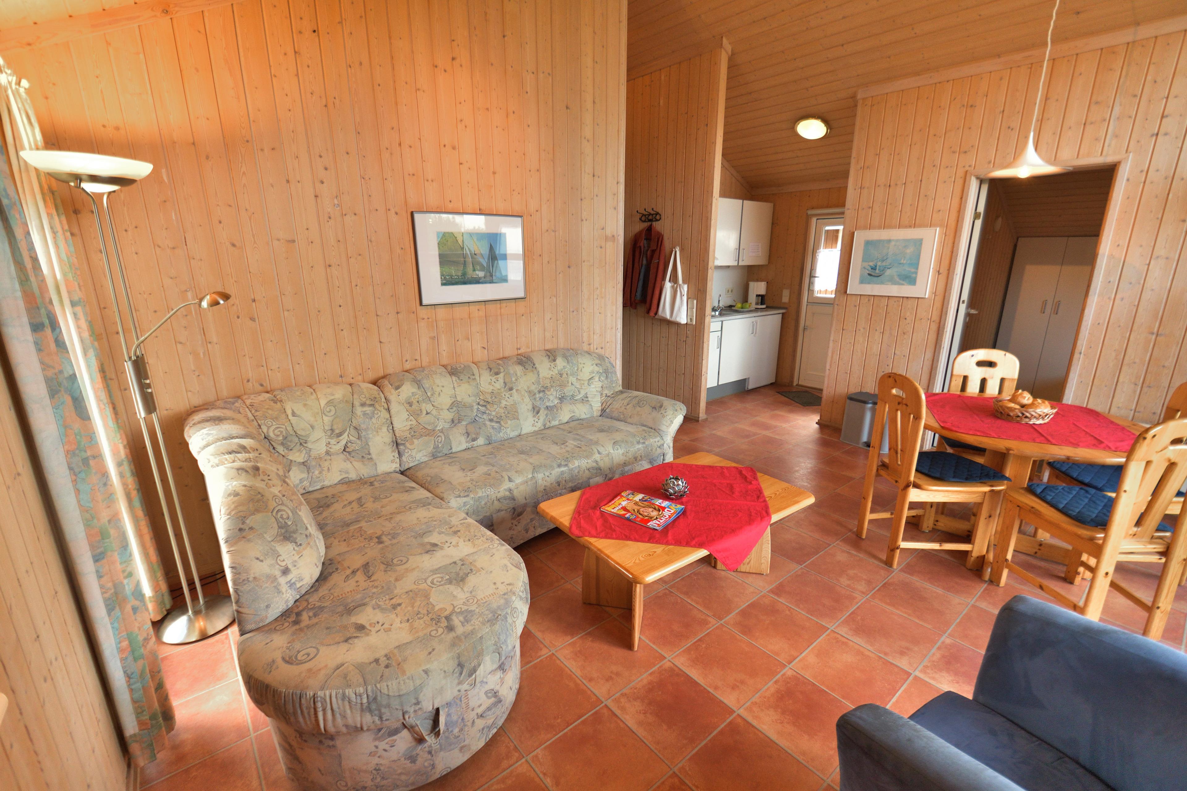 Gleich im Eingangsbereich Ihres Ferienhauses finden Sie eine kleine Küche mit Kühlschrank, Elektroherd, Backofen, Kaffeemaschine, Toaster, Wasserkocher sowie Geschirr und Besteck. Von dort gelangen Sie in den gemütlichen Wohnraum mit Sitzecke, Essecke, TV und Radio. Dieser gesamte Bereich ist mit hochwertigem Laminat-Fußboden ausgestattet.