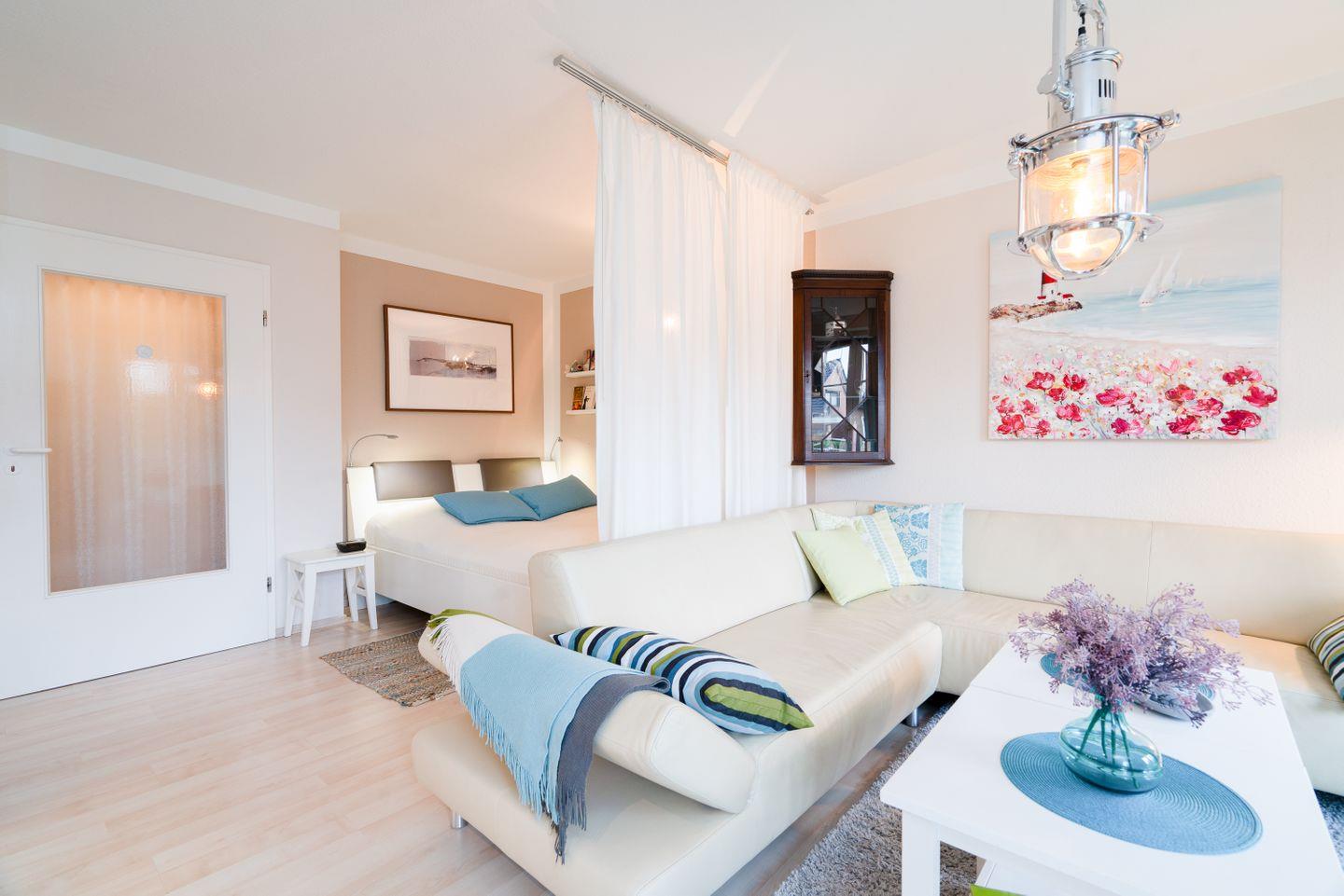 Die gepflegte 1-Raum-Ferienwohnung mit kleinem Balkon liegt in einem Mehrparteienhaus in einem ruhigem Wohngebiet in Neustadt in Holstein. Im kombinierten Wohn-Schlafraum schlafen Sie in einem Doppelbett (1,6m x 2 m), das optisch etwas abgetrennt von der Wohnlandschaft liegt. Es gibt eine kleine Küche und ein innenliegendes Wannenbad.