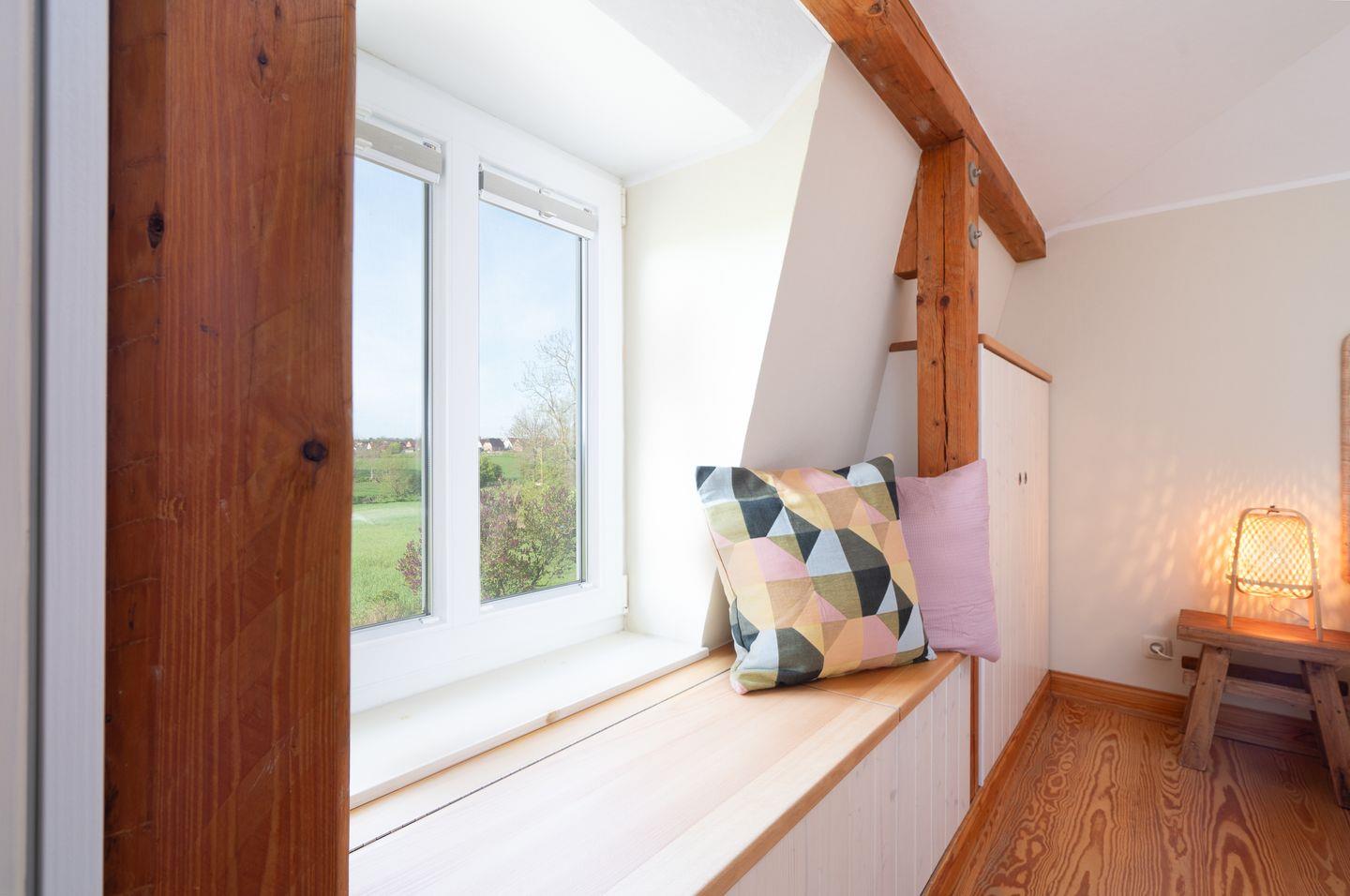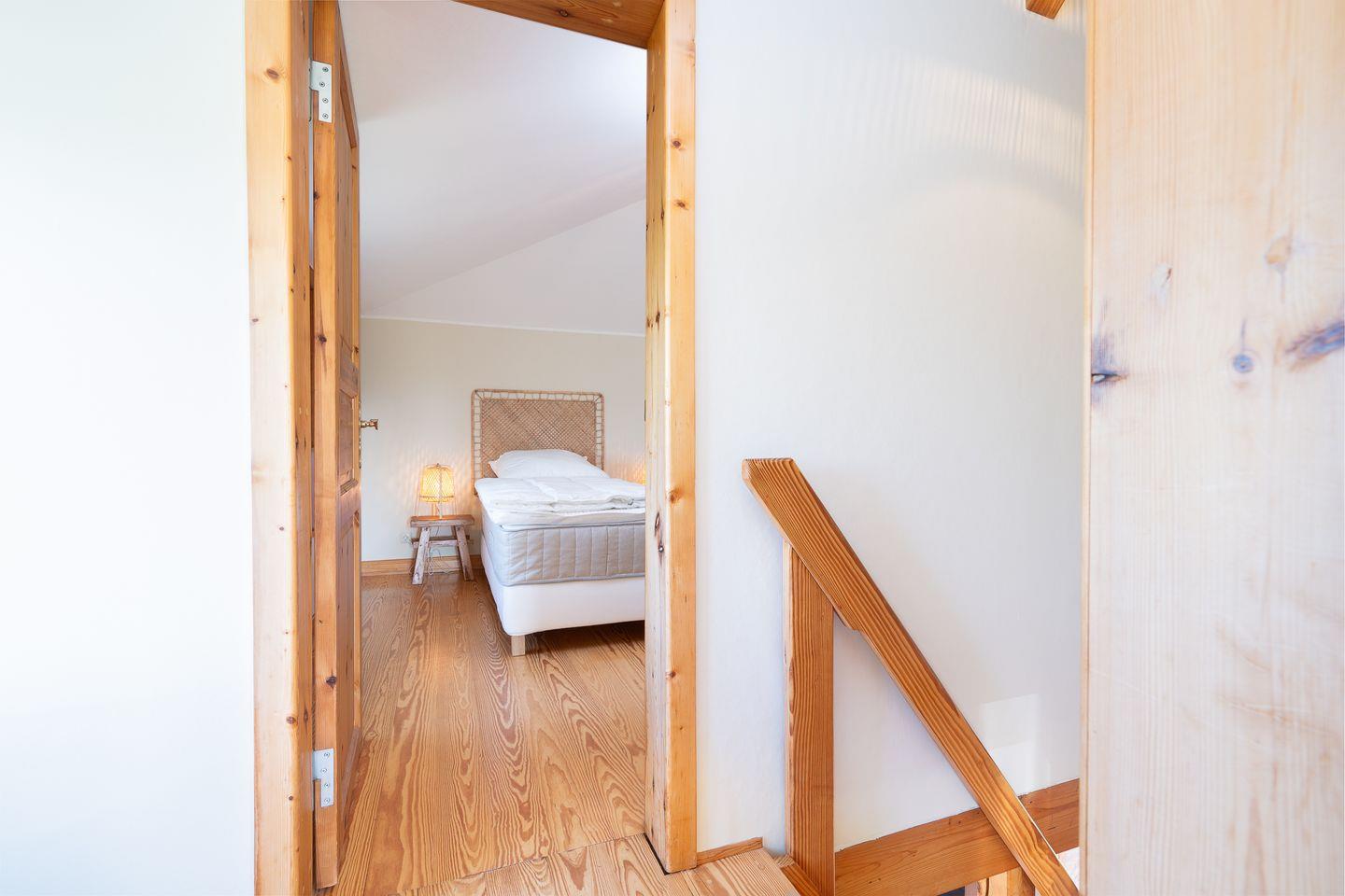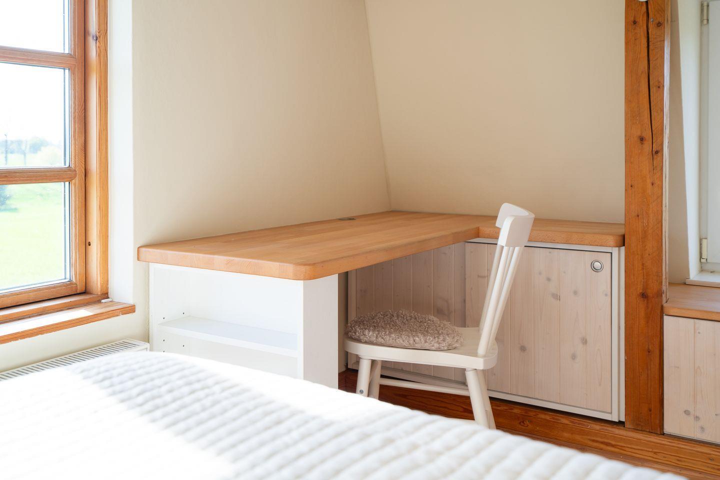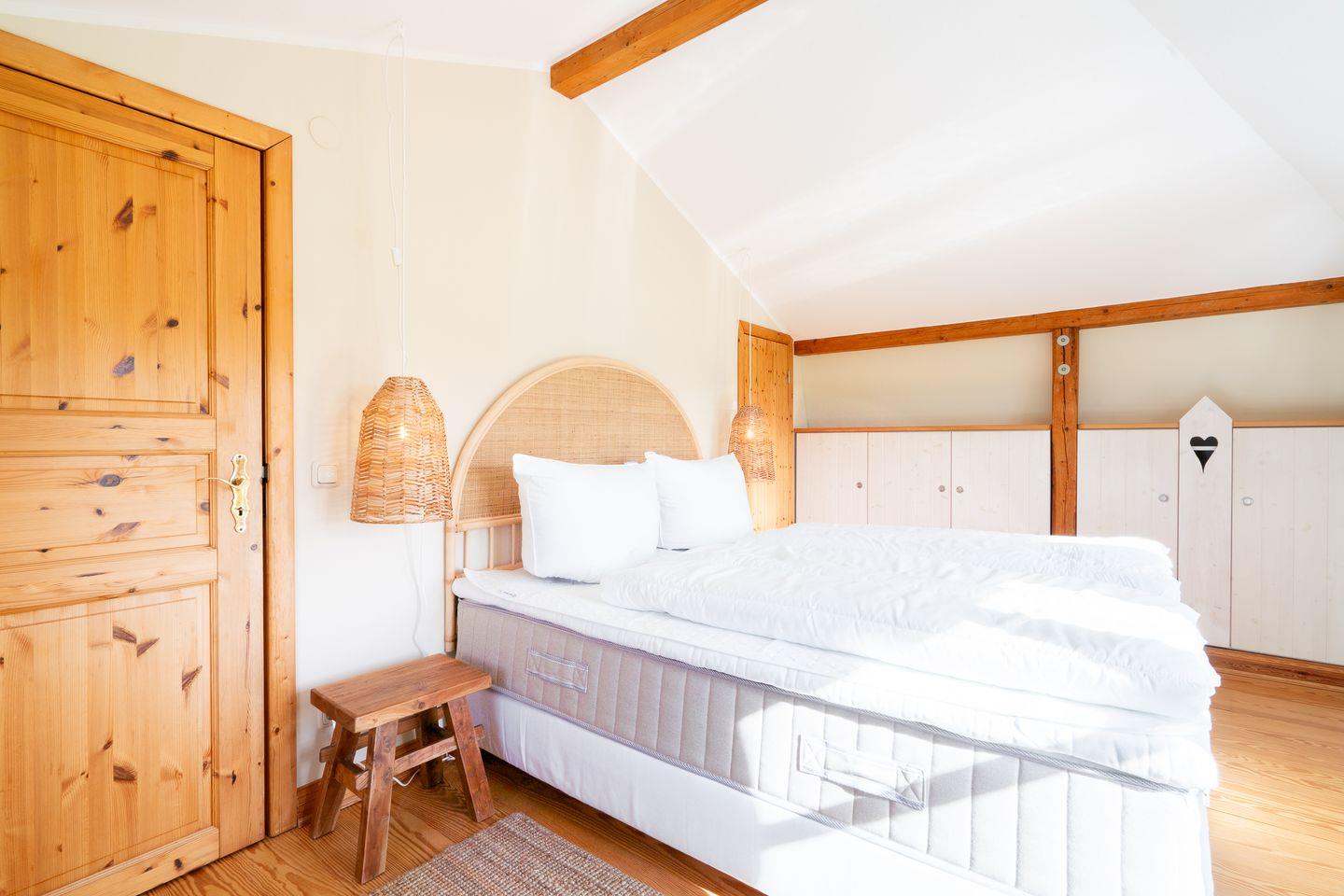 Das Duschbad ist mit Hänge-WC, kleinen Schränkchen, Handtuchtrockner und Waschbecken ausgestattet. Im Flurbereich führt eine Holztreppe in die obere Ebene, in der sich die beiden Schlafräume befinden. Raffiniert wurden die Schrägen genutzt, um möglichst viel Staufläche zu schaffen. Im ersten Schlafzimmer mit kleiner Arbeitsniesche und Doppelbett (160 x 200 cm) wurde ein begehbarer Kleiderschrank integriert. Im zweiten Schlafzimmer stehen zwei Einzelbetten (je 90 x 190 cm).