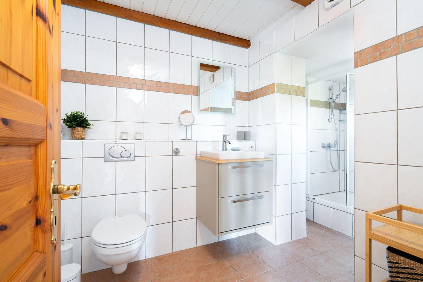 Die Einrichtung gleicht einem gemütlichen Landhaus-Look mit einer Prise Seaside-Style. Zum Außenbereich gehören zwei sonnenverwöhnte Terrassen. Der Tag lässt sich perfekt auf der Südterrasse mit einem Kaffee beginnen. Nachmittags lädt die Hauptterrasse in Süd-Westlage zum Sonnenbaden oder Grillen ein. Am Abend sitzen alle mit sandigen Füßen vom Strand und dem Grillenzirpen im Ohr bei einem Glas Wein zusammen und vergessen dabei die Zeit.