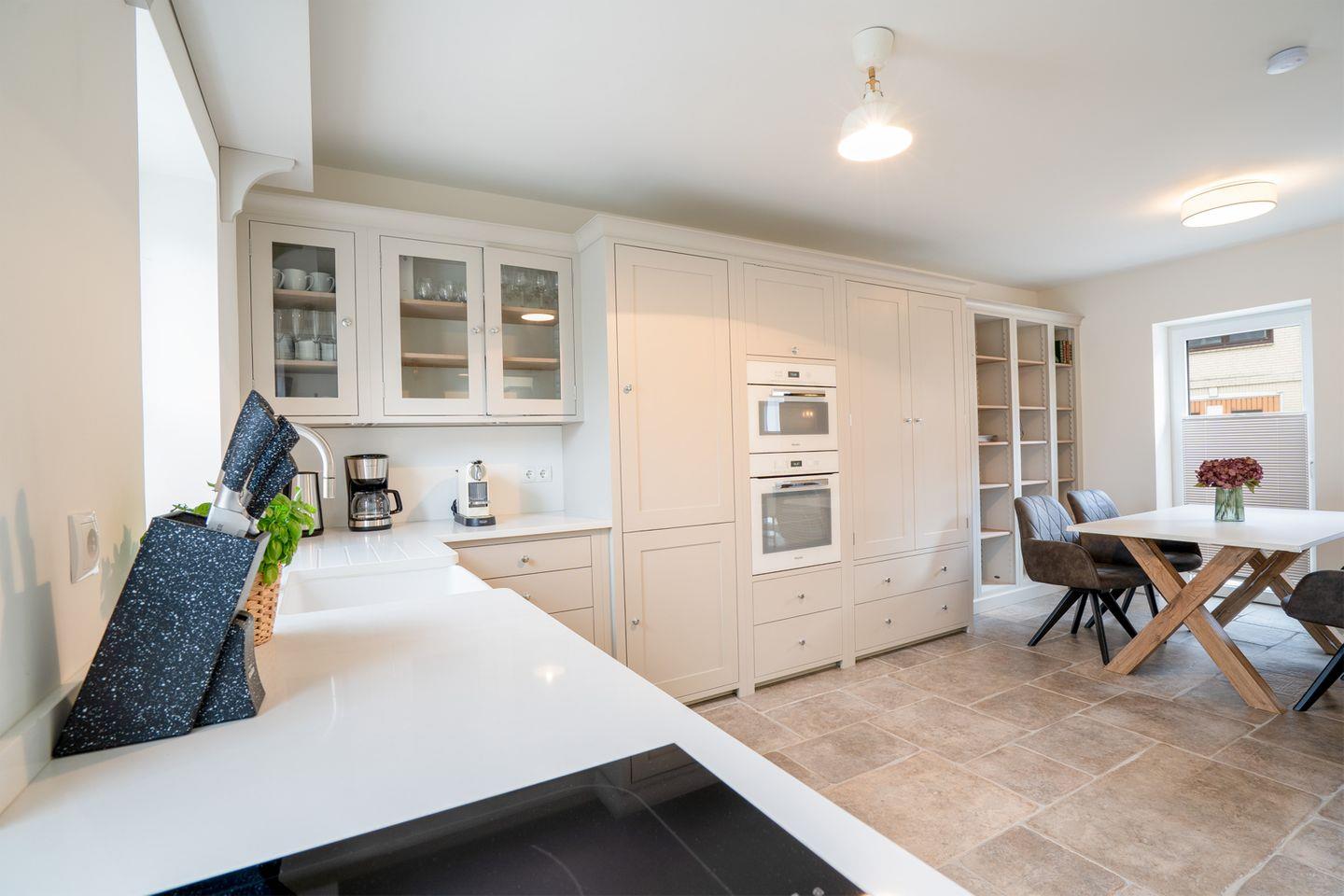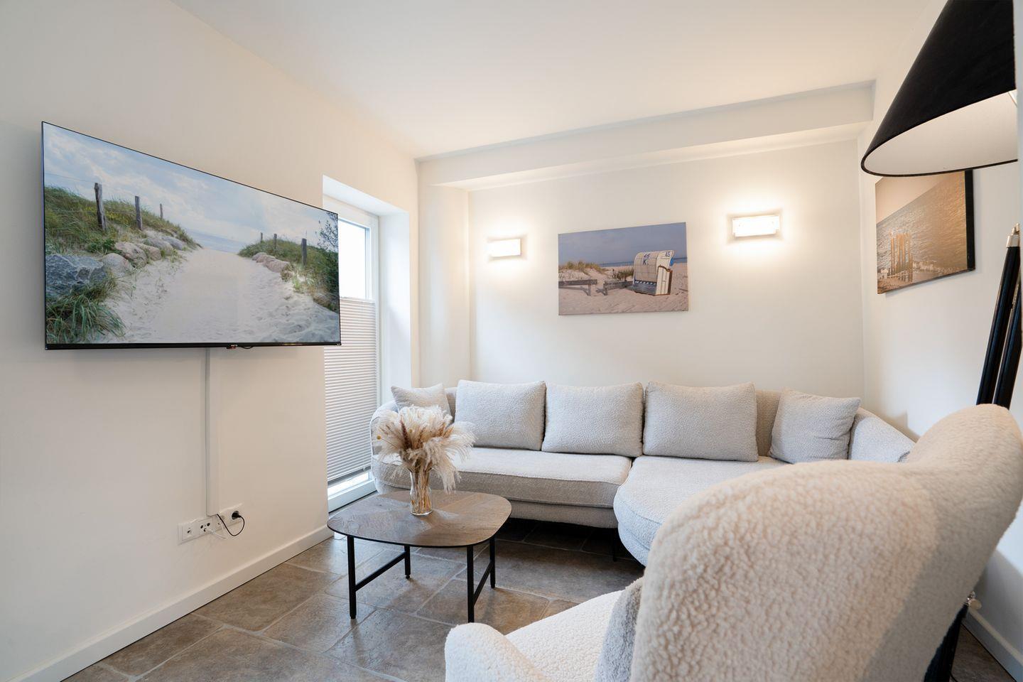 Die hochwertige Küche ist voll ausgestattet und lädt mit einem Esstisch für vier Personen zu geselligen Mahlzeiten ein. Gleich daneben sorgt eine gemütliche Sitzecke mit TV für entspannte Abende.