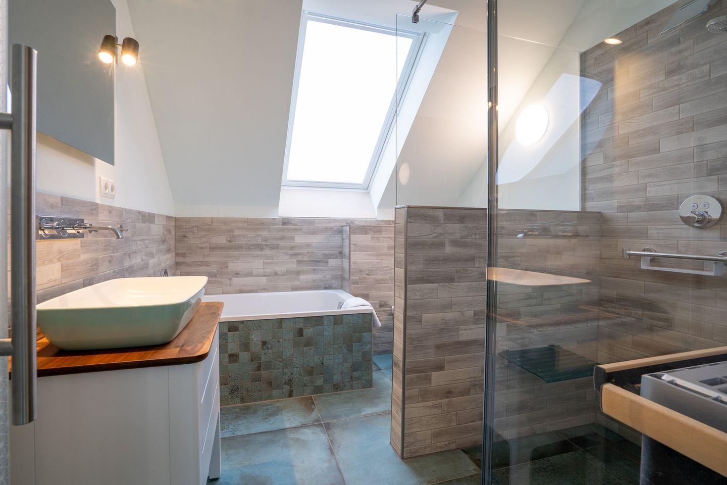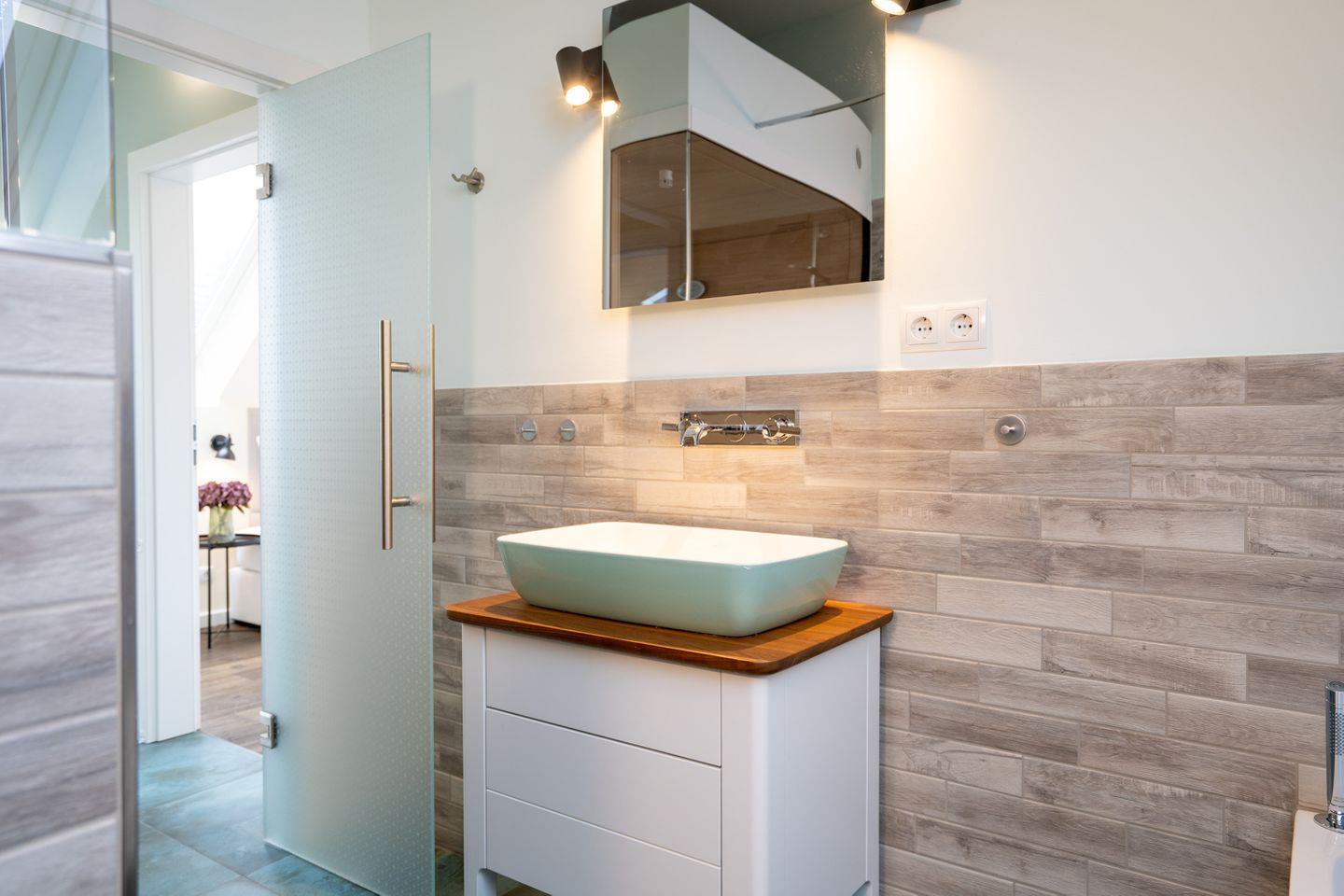 Im oberen Stockwerk erwartet Sie ein helles Schlafzimmer mit Doppelbett, TV und Kleiderschrank – der perfekte Rückzugsort zum Ausschlafen und Entspannen. Der angrenzende, möblierte Balkon mit Grill bietet herrliche Möglichkeiten für laue Abende unter freiem Himmel. Das großzügige Badezimmer auf dieser Etage überzeugt mit Badewanne, ebenerdiger Dusche, WC, stilvollem Waschtisch – und als besonderes Highlight: einer privaten Sauna für Ihr persönliches Wellness-Erlebnis.