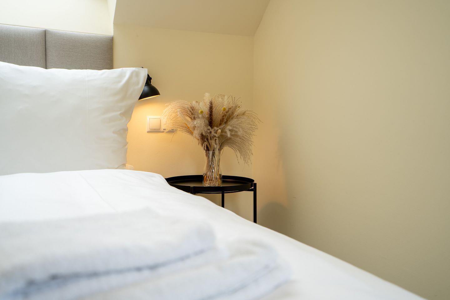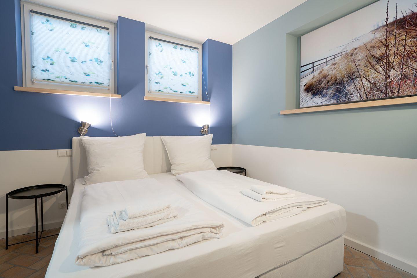 Im unteren Bereich der Wohnung befindet sich ein weiteres Schlafzimmer mit Doppelbett. Von hier aus gelangen Sie in ein separates Ankleidezimmer mit Kleiderschrank – ideal für längere Aufenthalte. Ein zweites, separates Badezimmer mit Dusche, WC und Waschtisch bietet zusätzlichen Komfort und Privatsphäre.