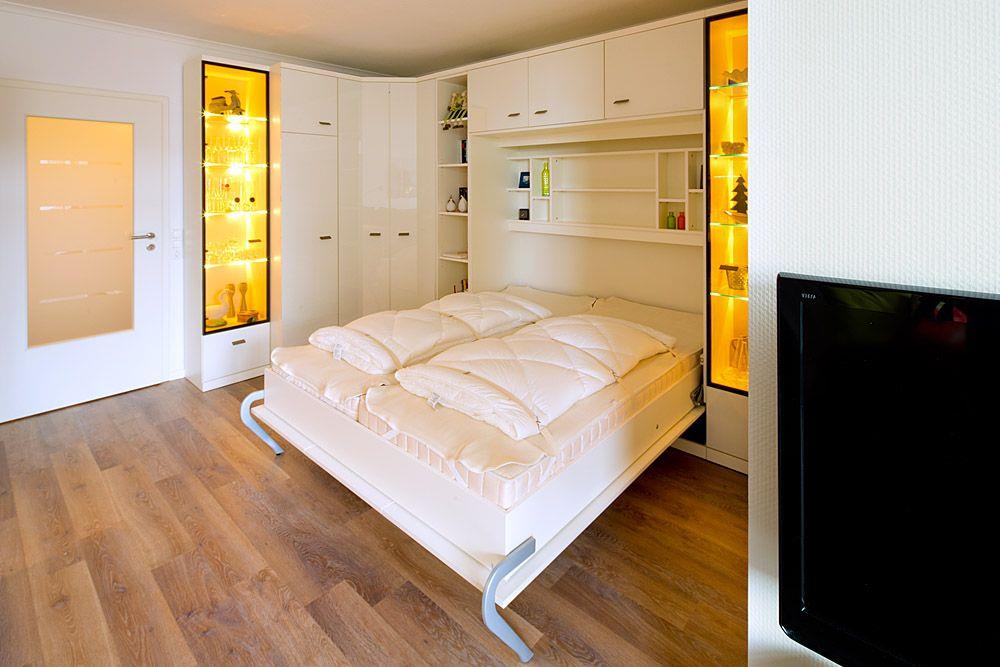 Ein bequemes Sofa bietet Platz zum Entspannen, dazu stehen ein 37-Zoll-Flachbild-TV und eine Stereoanlage mit Blu-ray-Player für gemütliche Abende bereit. In der Wohnwand verbirgt sich ein ausklappbares Doppelbett (160 cm x 200 cm) mit viel Stauraum im angrenzenden Schrank.