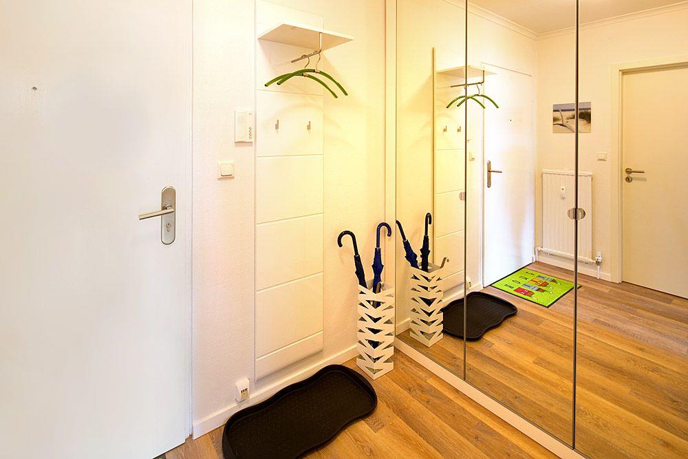 Im modernen Duschbad finden Sie alles, was Sie brauchen: Spiegel, Waschbeckenschrank und Föhn. Im Flur sorgt ein großer Spiegelschrank für ausreichend Stauraum für Kleidung, Schuhe und mehr.