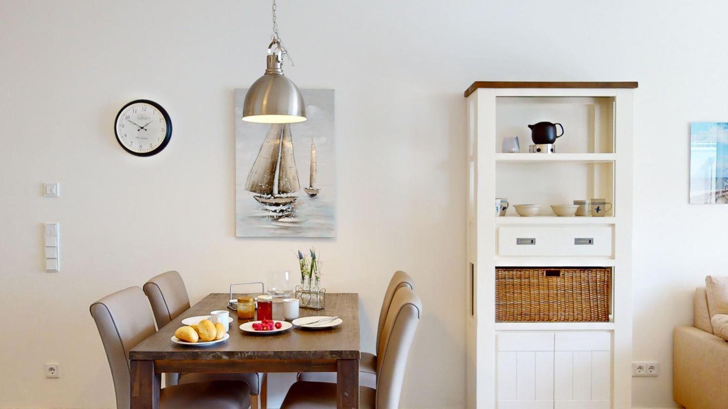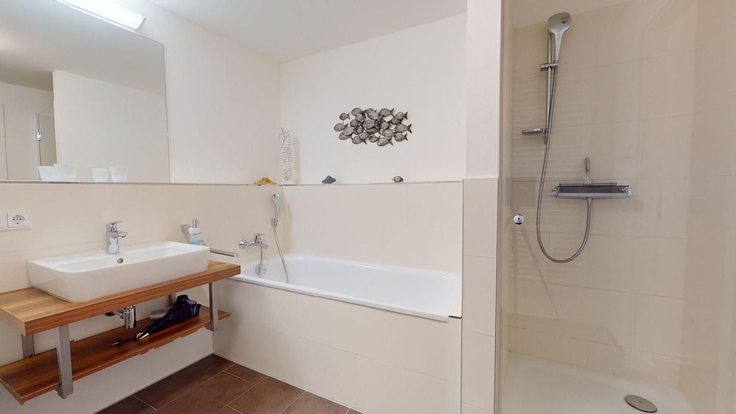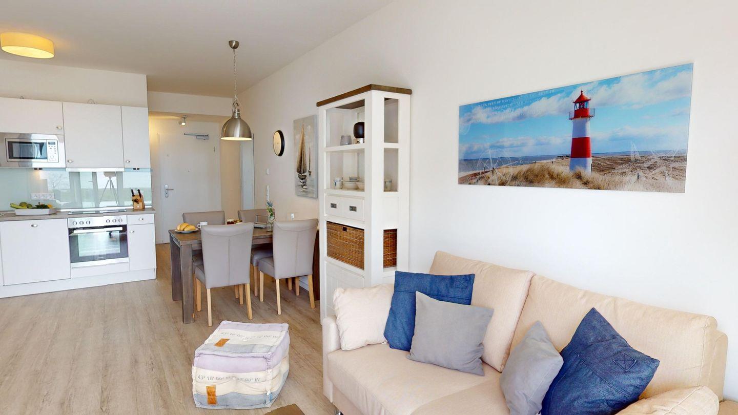 Die 59 m² große Wohnung ist modern und hell eingerichtet. Der einladende Wohn- und Essbereich grenzt an eine voll ausgestattete Küchenzeile. Das Sofa lässt sich auch als Schlafcouch für zwei Personen nutzen. Das Schlafzimmer ist mit einem Boxspring-Doppelbett ausgestattet. Im Badezimmer erwartet Sie eine Badewanne und eine separate Dusche.