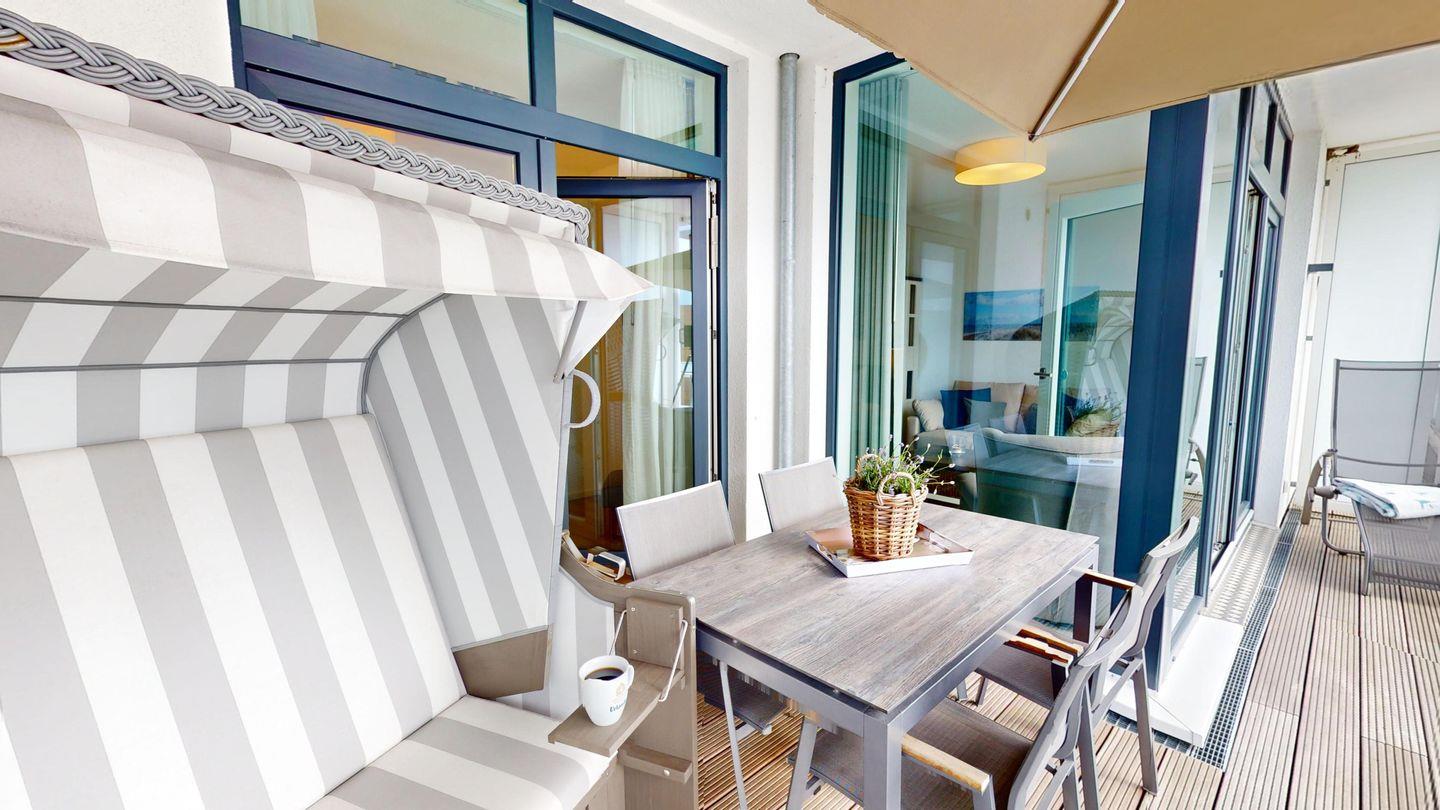 Auf dem überdachten Balkon erwartet Sie ein Tisch mit vier Stühlen, Sonnenliegen sowie ein Strandkorb für gemütliche Auszeiten mit Blick auf die Ostsee.
