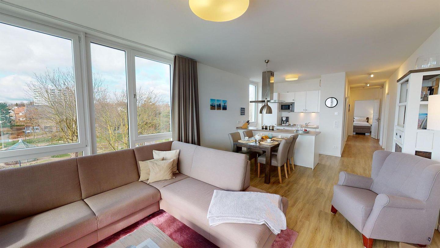 Das 84 qm große 3-Zimmer Apartment befindet sich im 2. Obergeschoss des Hauses E. Es ist für eine Belegung mit 5 (4 Erwachsene + 1 Kind) Personen ausgelegt.