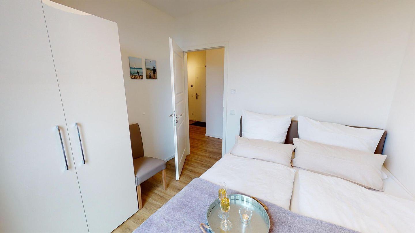 Weiter über den Flur gelangen sie rechterhand in das zweite, etwas kleinere Schlafzimmer auch mit einem Boxspring-Doppelbett und einen Kleiderschrank ausgestattet. Linkerhand vom Flur, führt Sie Ihr Weg in das zweite Badezimmer, dies mit einer fast bodengleichen Dusche. Am Ende des Flurs erreichen Sie das Herzstück des Apartments, den großzügigen Wohnbereich. Ausgestattet mit einer schönen, offenen Einbauküche, einem einladenden Essbereich und einer gemütlichen Sofaecke - inklusive Meerblick! Das Sofa bietet eine Schlaffunktion und dient somit als Schlafplatz für eine Person.