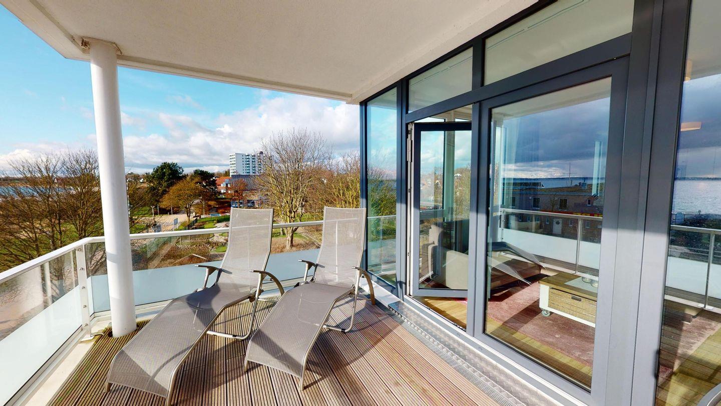 Über das Wohnzimmer gelangen Sie auf den großen Balkon mit einmaligem Meerblick! Hier stehen zwei Sonnenliegen sowie ein Tisch mit vier Stühlen für Sie bereit, das Urlaubsgefühl ist komplett!