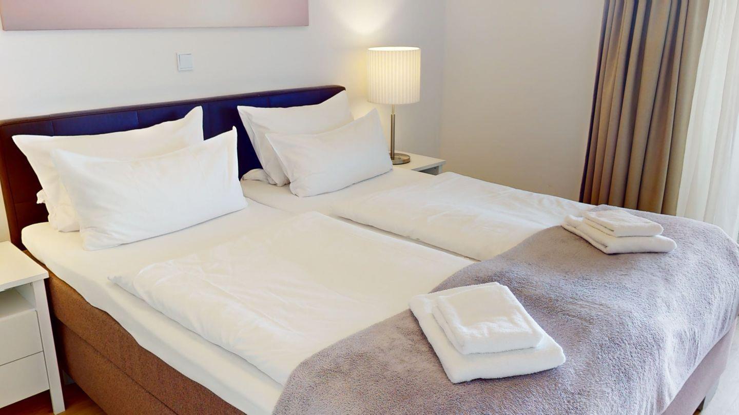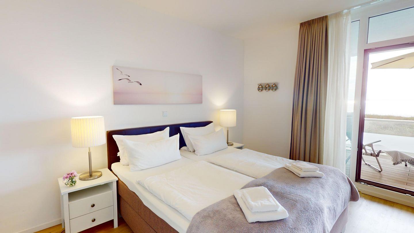 Die Wohnung im zweiten Obergeschoss hat zwei Zimmer (ein Schlafzimmer, ein Wohnzimmer mit Küchenzeile) und ist für vier Personen ausgelegt. Das Schlafzimmer verfügt über ein extra langes Doppel-Boxspringbett (1,80 m x 2,10 m) und einen Fernseher. Auf dem Schlafsofa, im Wohnzimmer, finden zwei weitere Personen einen Schlafplatz. Das Bad mit Dusche und Badewanne bietet größtmöglichen Komfort. Zusätzlich ist eine Aufstehhilfe für die Badewanne angebracht.