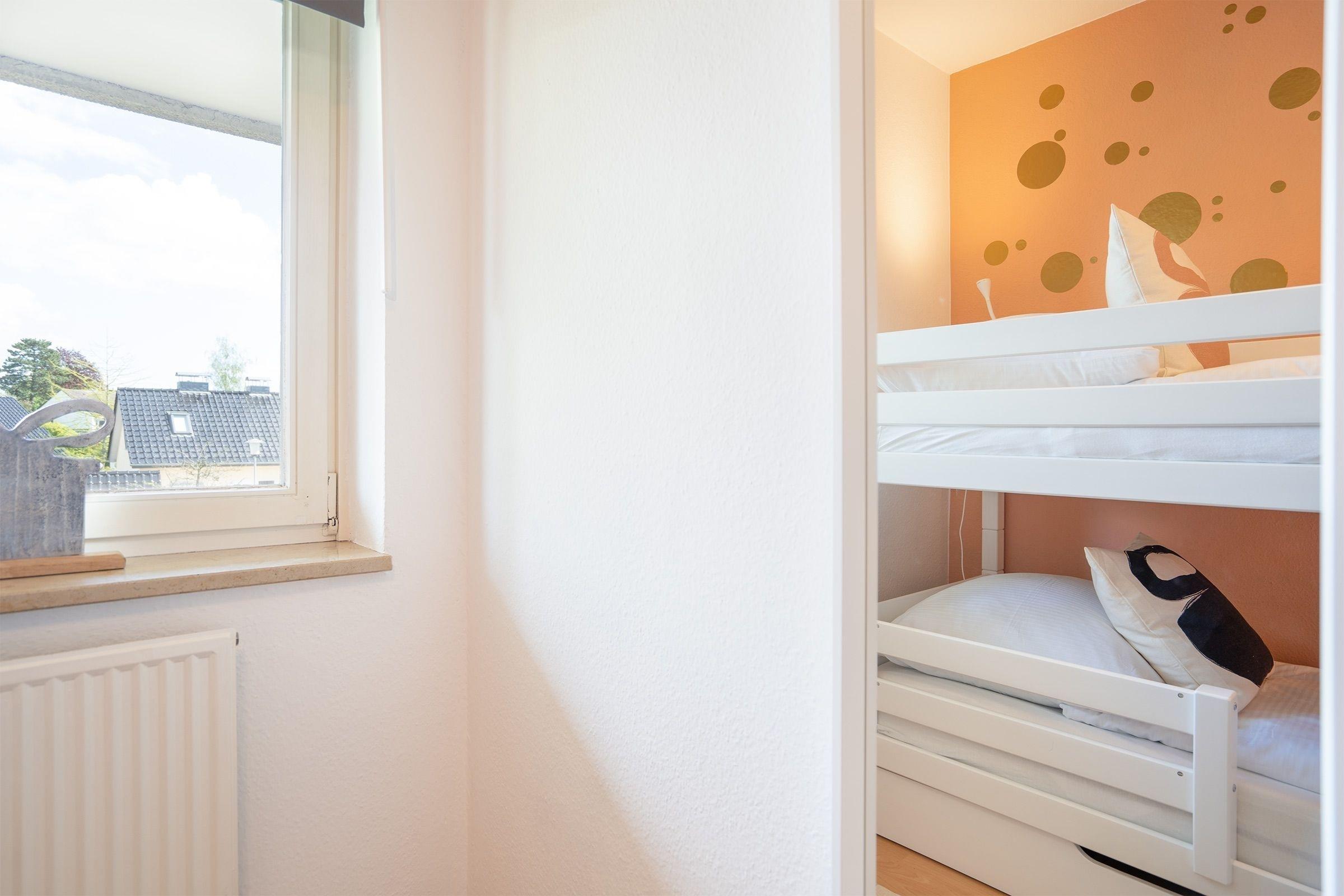Schlafzimmer: 1 Etagenbett (je 90x200 cm, jeweils bis 140 kg belastbar), Kleiderschrank, Verdunkelung: Rollo, Platz für Babybett vorhanden