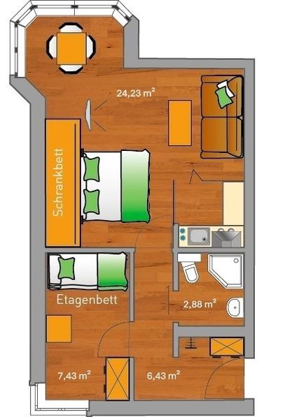41 m² Wohnfläche bieten Ihnen allen Komfort für max. vier Personen, der einen erholsamen und wirklich besonderen Urlaub ausmacht. Das Wohnzimmer ist ausgestattet mit einer Sitzgarnitur, einem Essplatz für vier Personen sowie einem elektrisch ausfahrbaren Doppelbett (1,80x2,00 m), das auf Wunsch und Knopfdruck unsichtbar wird.