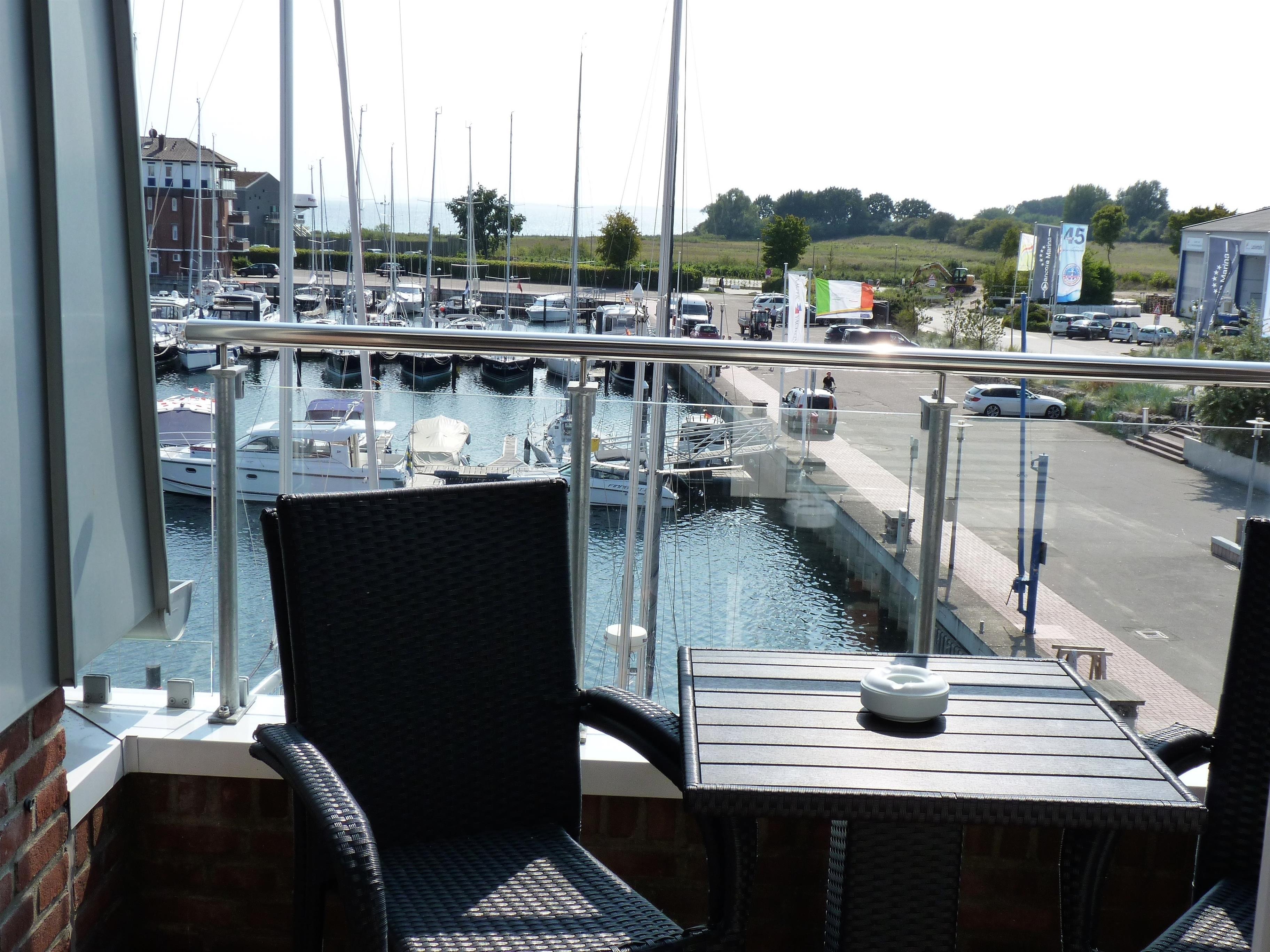Balkon mit Blick über den Yachthafen und Ostsee: Sitzgarnitur