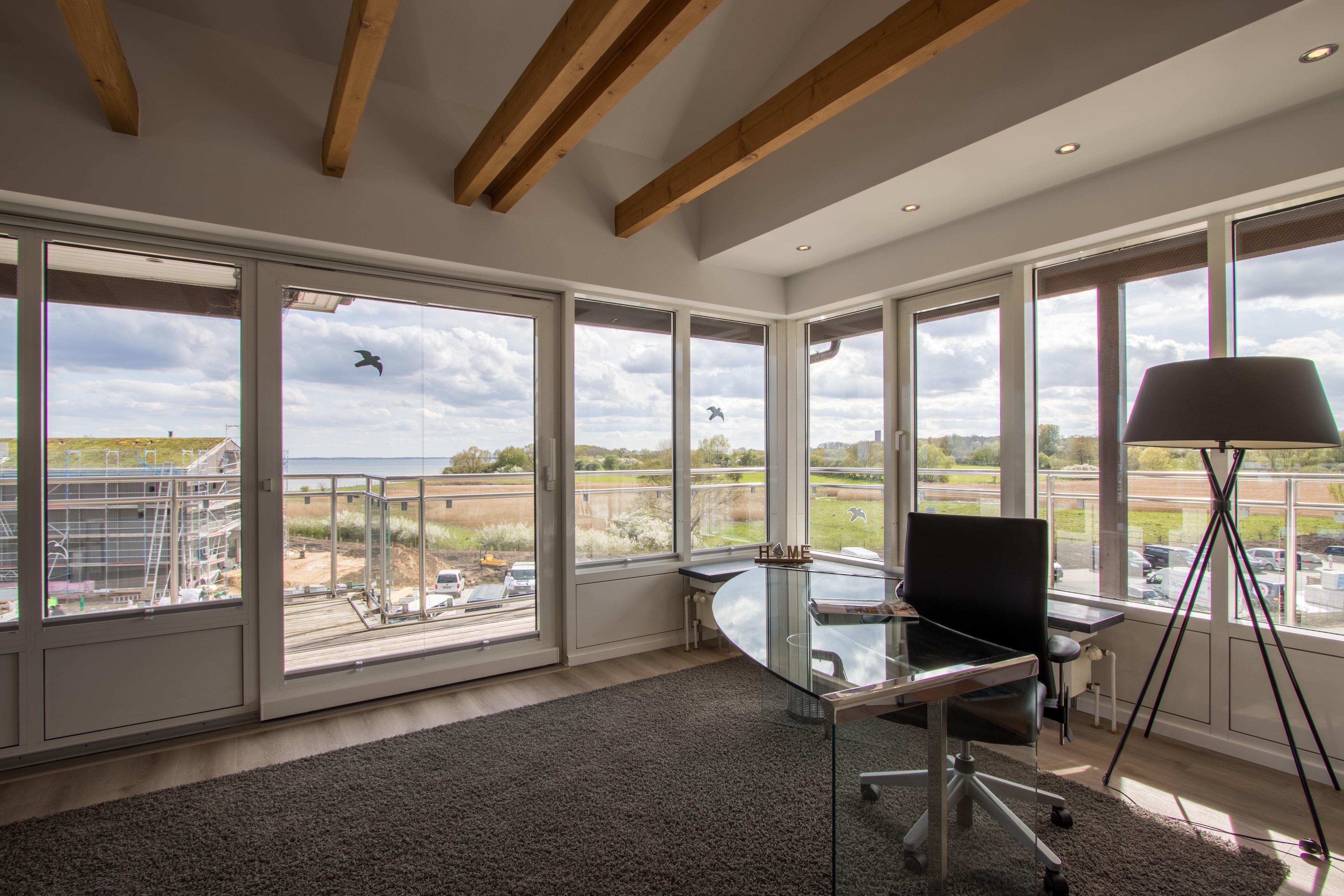 Hier oben in der 3. Etage, die Sie bequem mit Ihrem eigenen Fahrstuhl erreichen, haben Sie einen traumhaften Blick über Meer und Land, weiße Segelyachten und angrenzendes Naturschutzgebiet. Diese wirklich einmalige Aussicht auf die Lübecker Bucht wird Sie begeistern - ebenso wie die Ausstattung unseres Schmuckstückes.