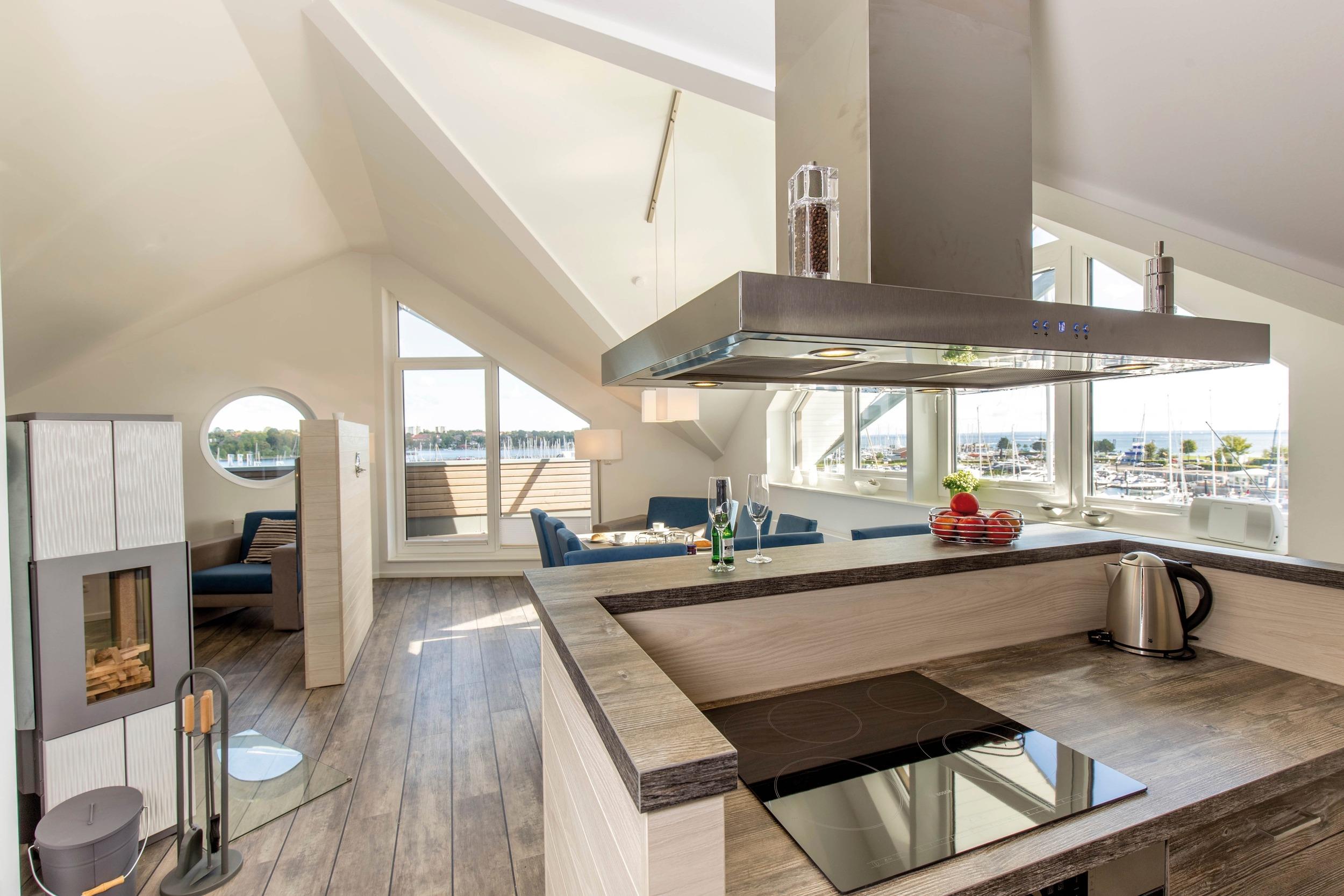 Grandios und unbeschreiblich schön - dieser Ausblick aus unserem 5-Sterne Penthouse im Appartementhaus I. Modern und luftig ist der einzigartige Loft-Aufbau der Dachkonstruktion, der so mit der maritimen Umgebung des ancora Marina Yachthafens harmoniert. Das modern und in hochwertiger Qualität eingerichtete Penthouse bietet Ihnen durch seine großzügigen Fensterfronten ein helles und freundliches Ambiente. Genießen Sie von drei Balkonen einen unvergleichlichen Blick über die Ostsee, den Yachthafen mit seinen weißen Segelyachten oder das angrenzende Naturschutzgebiet.