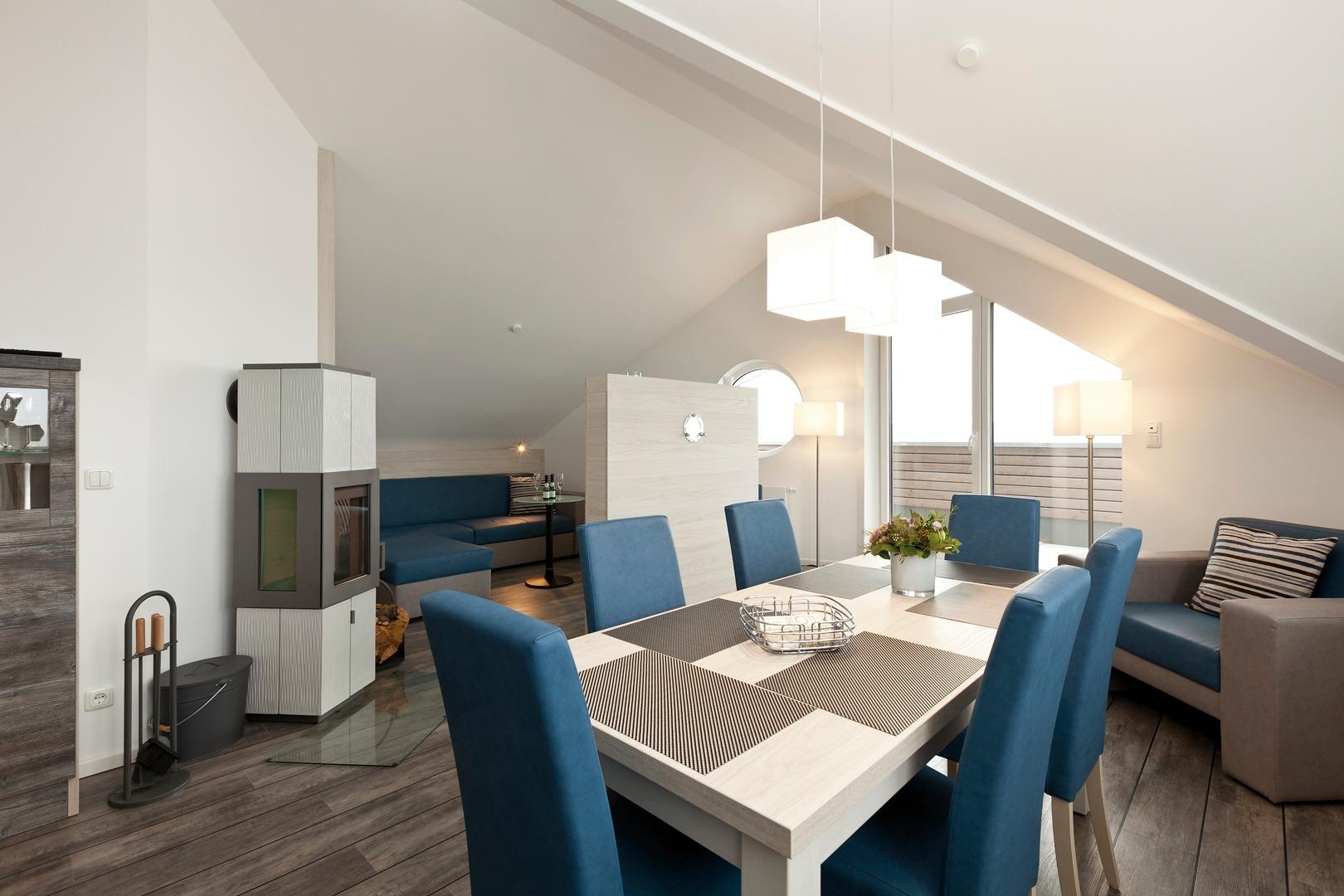 Wohnbereich: Kaminofen Flachbild-TV, MP3-Radio, Wlan kostenlos, Hochstuhl, Zugang zum Ostbalkon