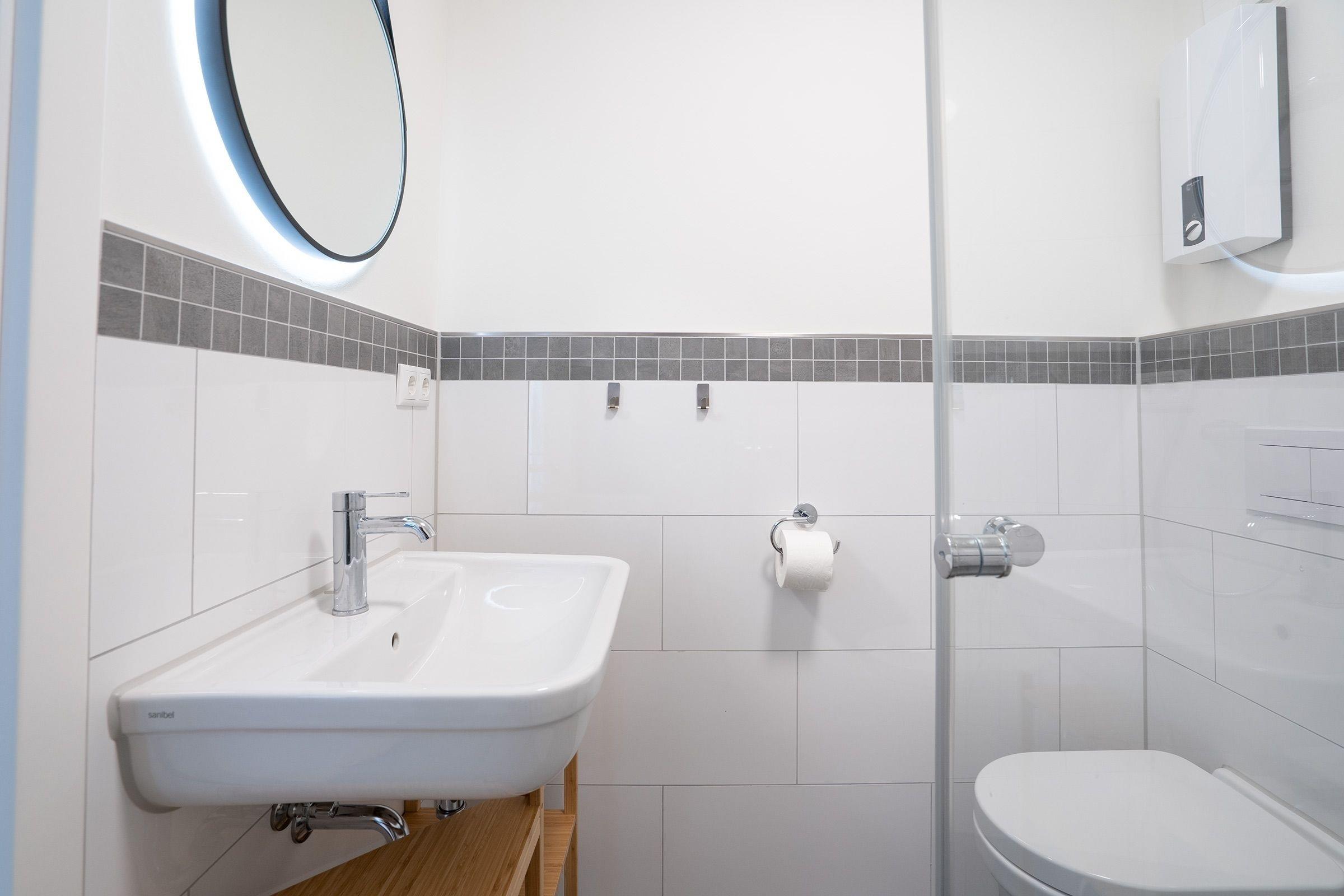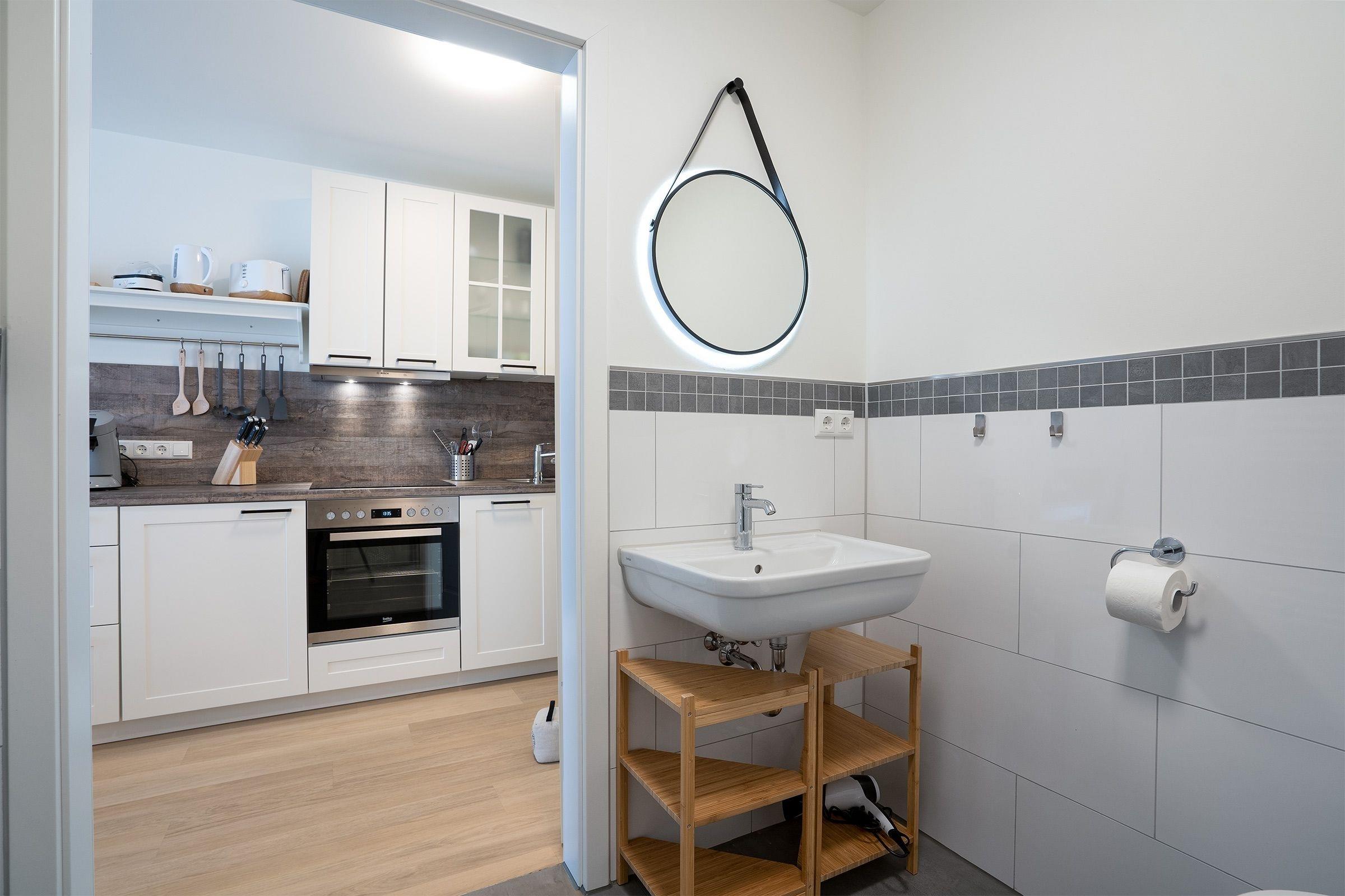 Auf kleinem Raum finden Sie hier alles, um vom Alltag abzuschalten und die Seele baumeln zu lassen. Der Wohn-, Ess- und Kochbereich ist liebevoll eingerichtet und verspricht entspannte Stunden zu Zweit. Kuscheln Sie sich abends gemütlich auf das Sofa, das auch als Ausweichschlafstätte (140x200 cm) genutzt werden kann und entspannen Sie bei einem guten Film. Im separaten Schlafzimmer befindet sich ein gemütliches Boxspringbett (ca. 140x200 cm). Das Duschbad mit ebenerdiger Regendusche verfügt über eine angenehme Fußbodenheizung. Verlegen Sie doch Ihre morgendliche Ausflugsplanung bei einem frischen Kaffee aus der Senseo Padmaschine auf den möblierten Balkon und genießen Sie die ersten Sonnenstrahlen. Die Ostsee erreichen Sie von hieraus fußläufig in 15 Minuten über einen idyllischen Wanderweg und auch der sehenswerte Ancora-Yachthafen ist schnell erreichbar. In unmittelbarer Nähe (50m) befindet sich eine Bushaltestelle, wenn Sie Ihrem Auto eine Pause gönnen möchten.
