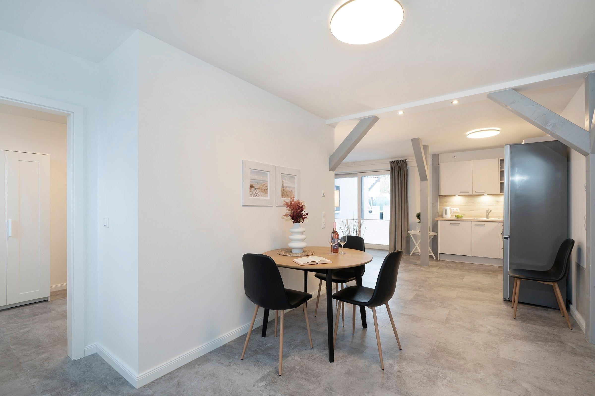 Durch den geräumigen Flur gelangen Sie in den lichtdurchfluteten und geschmackvoll eingerichteten Wohnbereich und machen Sie es sich hier auf der Couch vor dem Flachbild-Fernseher gemütlich. Bei Bedarf kann diese in einen weiteren Schlafplatz (90x200 cm) verwandelt werden. Die 17 m² große, möblierte Süd-Terrasse lädt zum Sonnenbaden und Relaxen an der frischen Luft ein. In der offen gestalteten Küche, die mit allen Annehmlichkeiten ausgestattet ist, können Sie Ihre Mahlzeiten gemeinsam zubereiten.