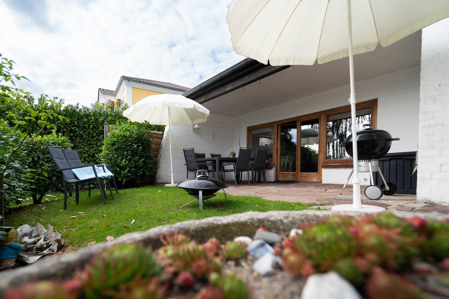 Die großzügige Terrasse bietet eine Sitzgruppe, Sonnenliegen und einen Grill. Im eingegrünten Garten gibt es viel Platz zum Spielen.
