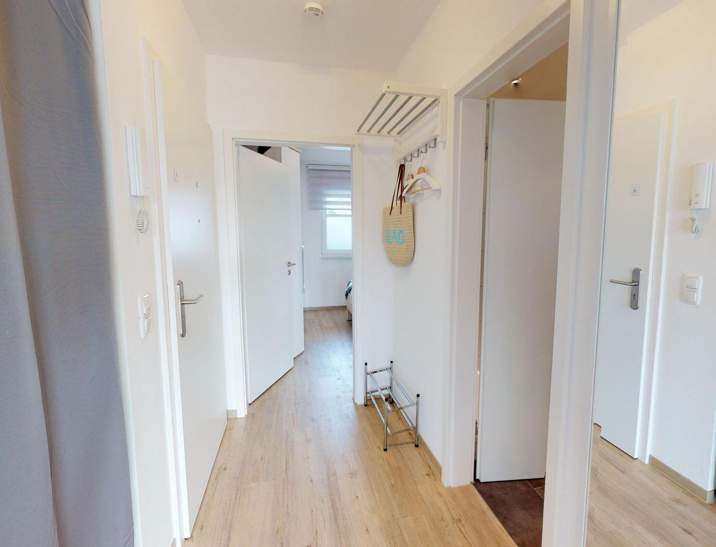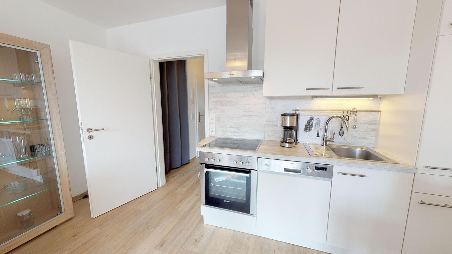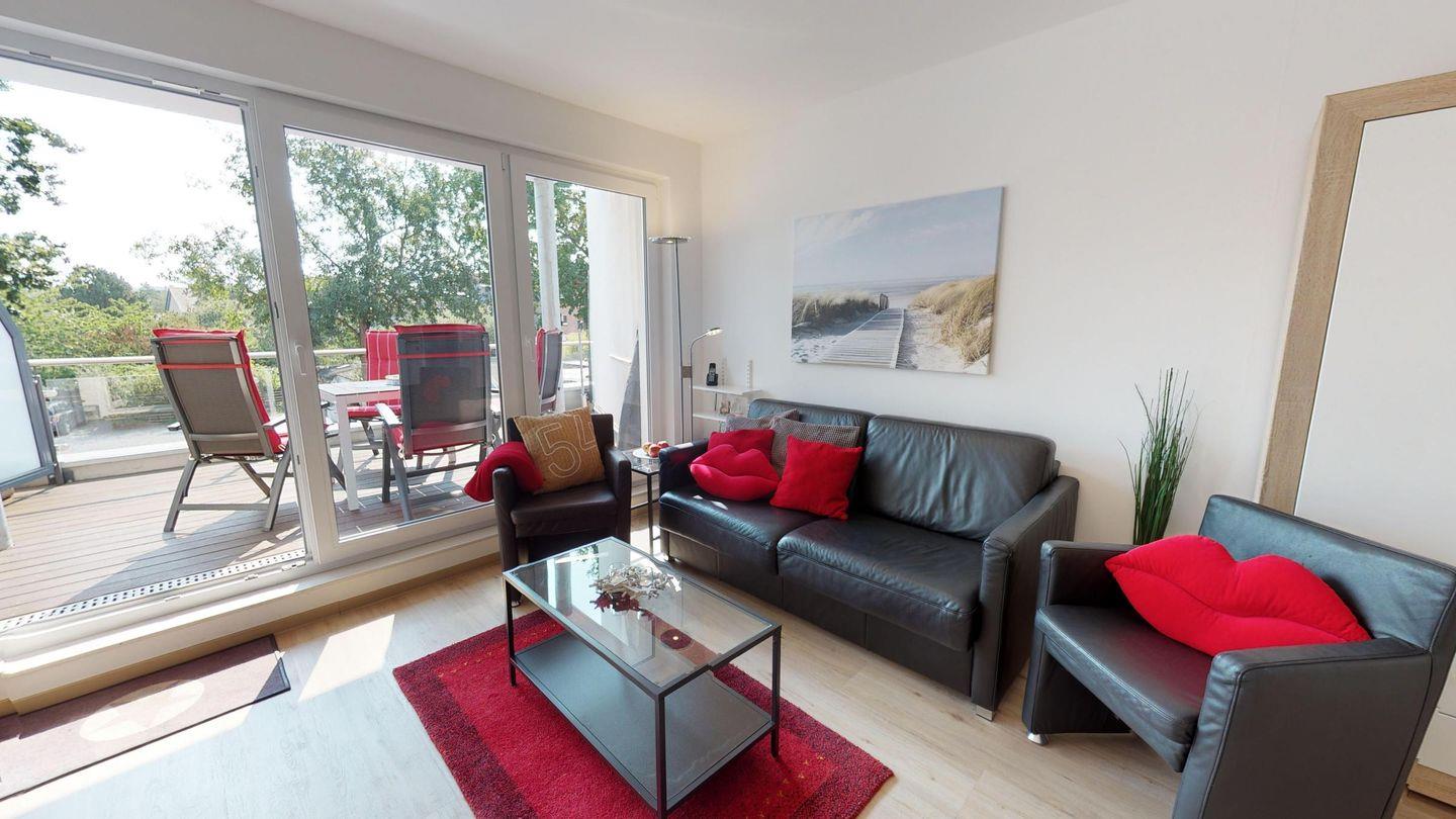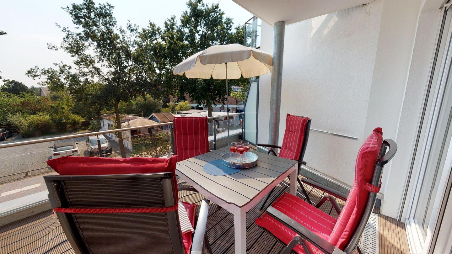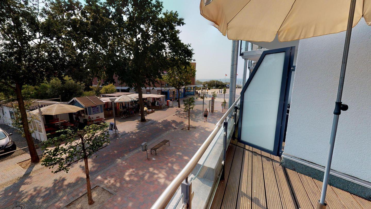 Vom großzügigen, möblierten Süd-Ost-Balkon genießen Sie einen herrlichen seitlichen Blick auf das Meer und die Seebrücke. Die Wohnung verfügt über einen zweiten Westbalkon mit zwei Klappliegen für sonnige Stunden.