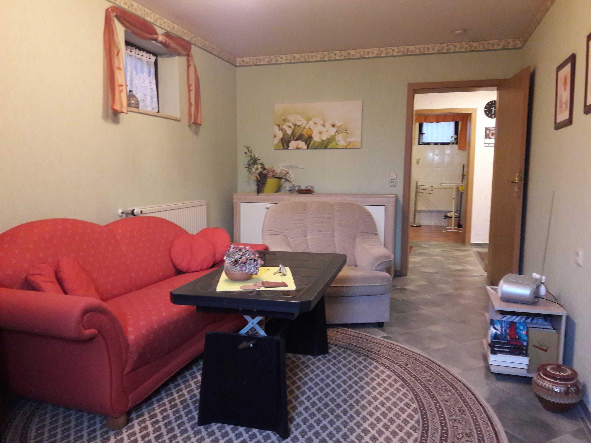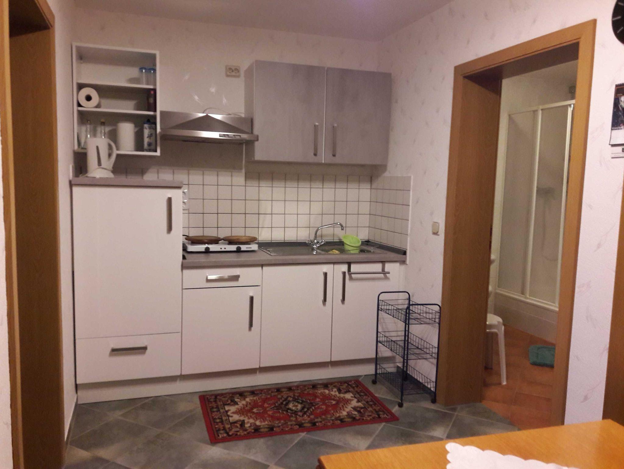 Die Ferienwohnung verfügt über einen Wohn-, und einen Schlafraum und ein Bad mit Dusche. Die voll ausgestattete Küche hat eine Küchenzeile mit Kühlschrank, Plattenkocher und einen Minibackofen.