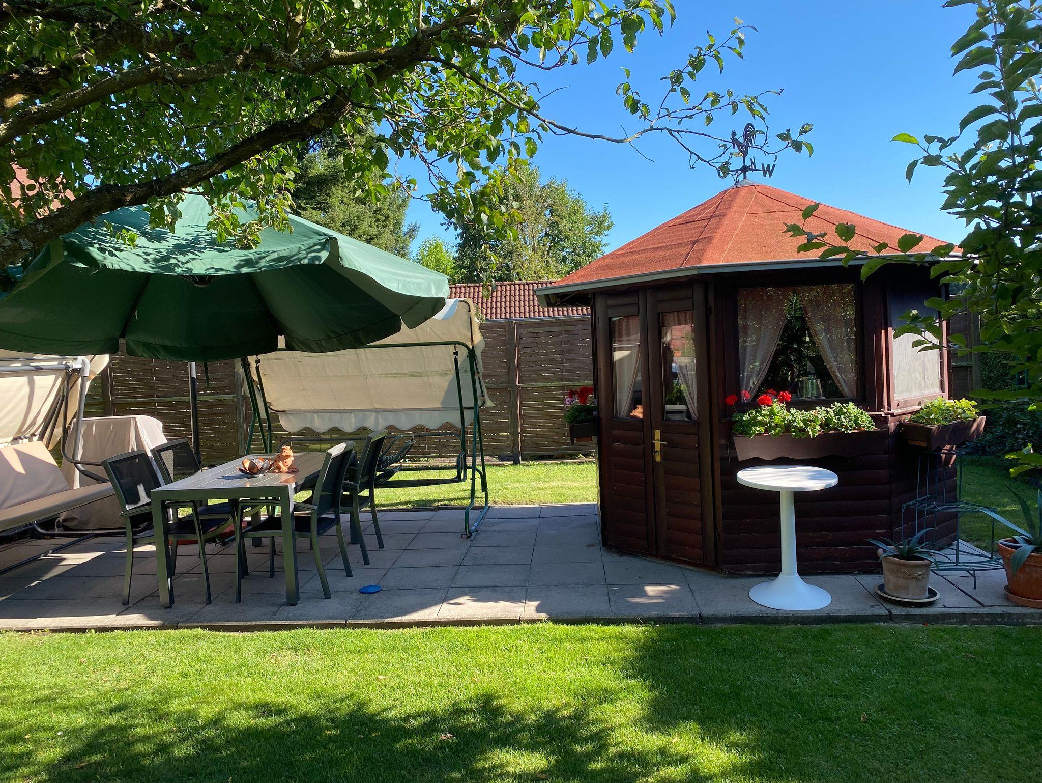 Auf unserem Aussengelände stehen für Sie Gartenmöbel, Sonnenschutz und Grill bereit.
