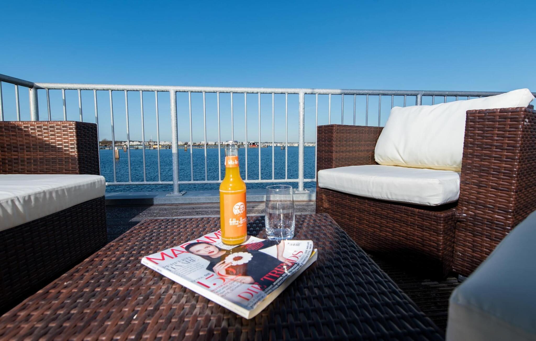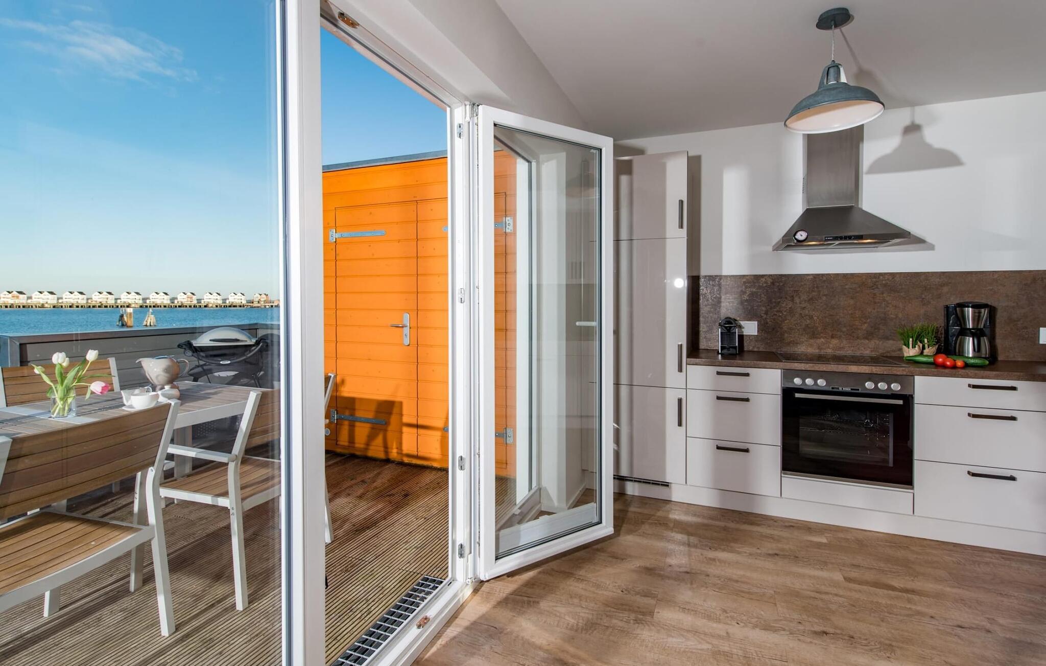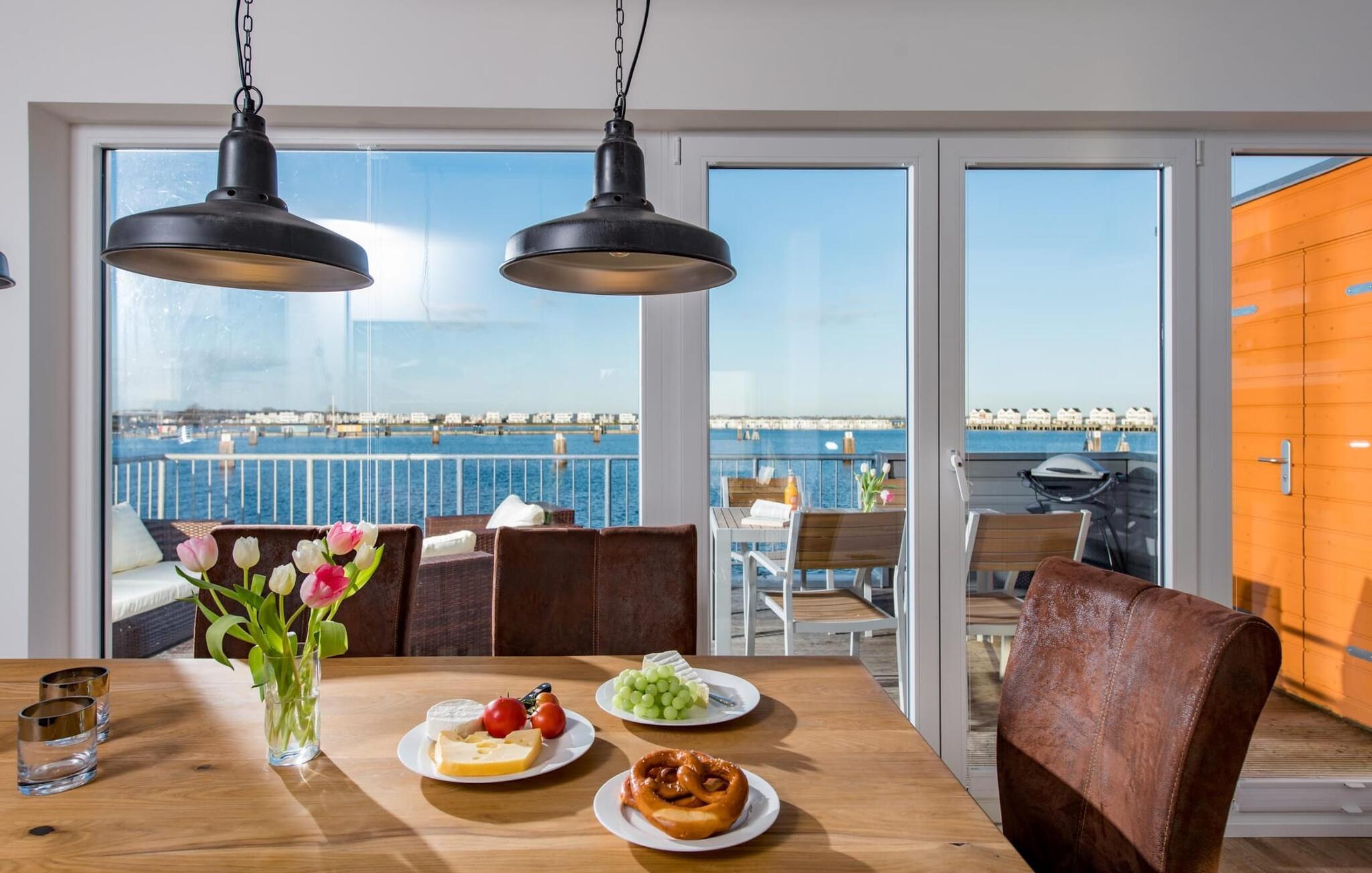Sommerhusets opholds-/spisestue er oversvømmet med lys og har panoramavindue fra gulv til loft, der fører til de tilstødende terrasser på begge sider. En fantastisk udsigt åbner op på terrassen ved siden af ??spisepladsen med udsigt over sejler- og sportsbådshavnen i OstseeResort Olpenitz. Havnebiograf og romantiske solnedgange er garanteret og giver underholdning under en hyggelig grill.