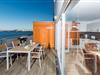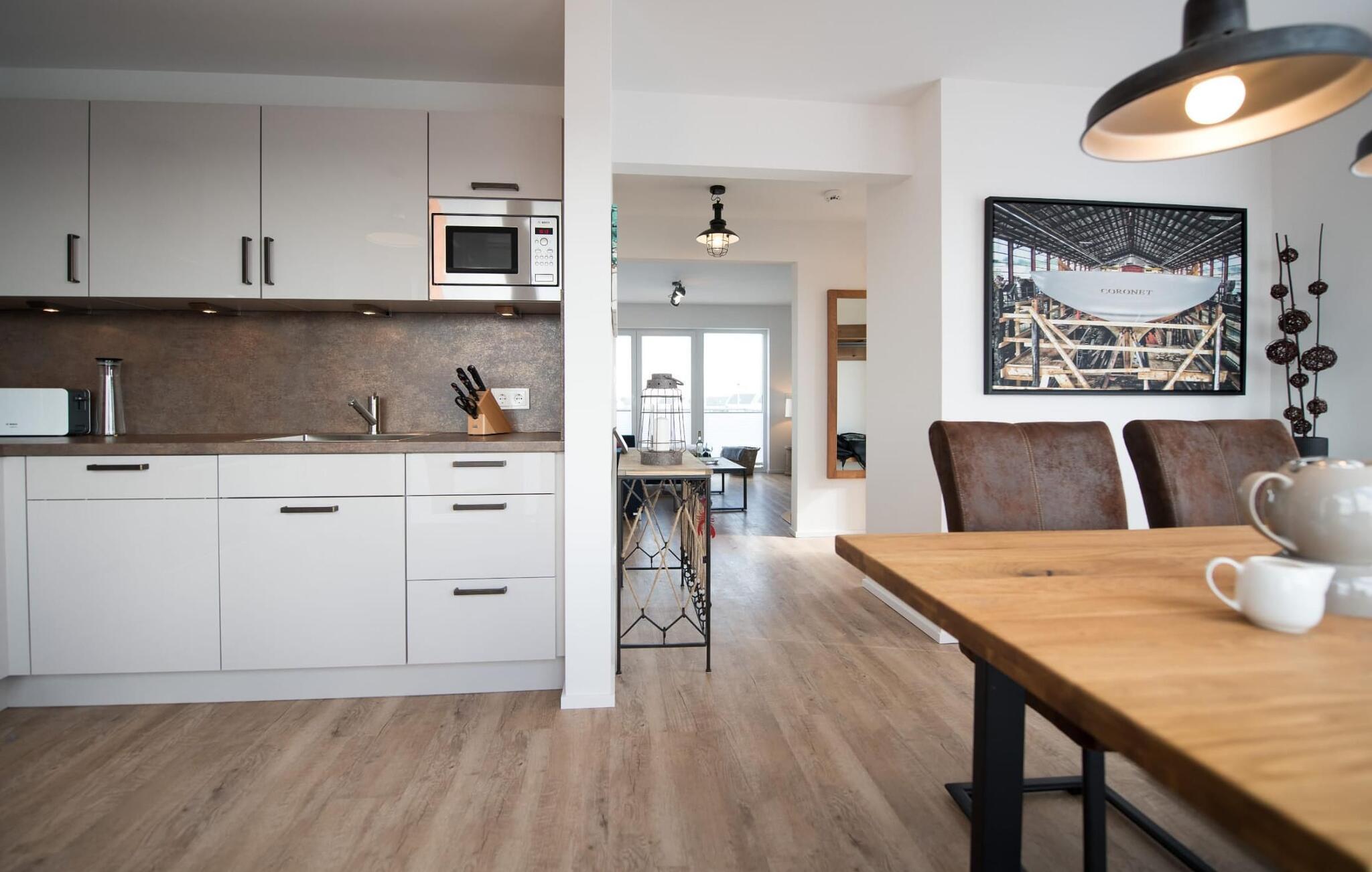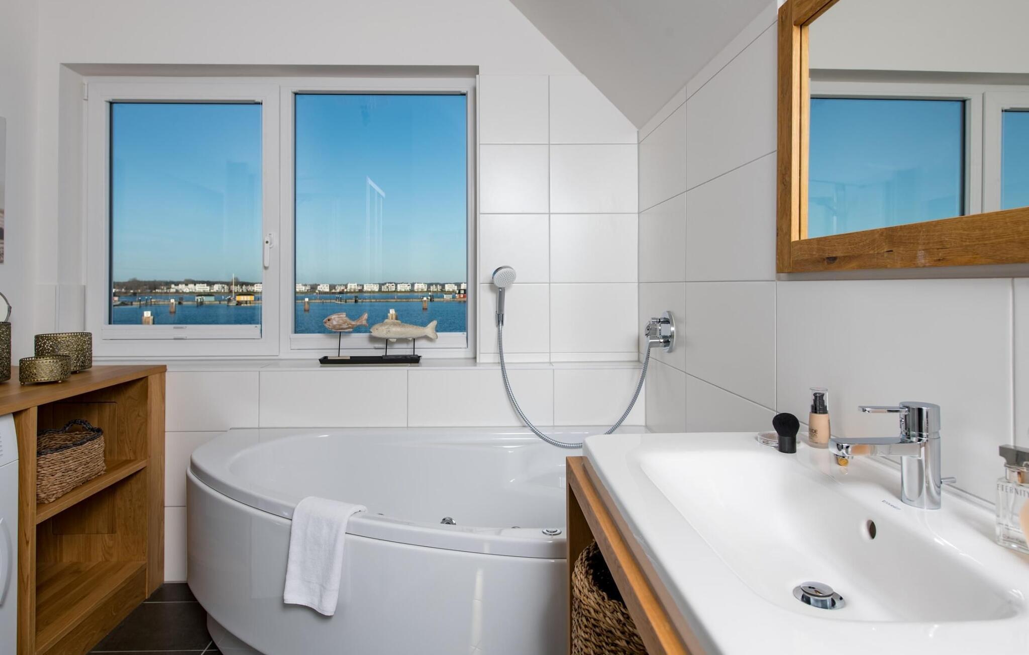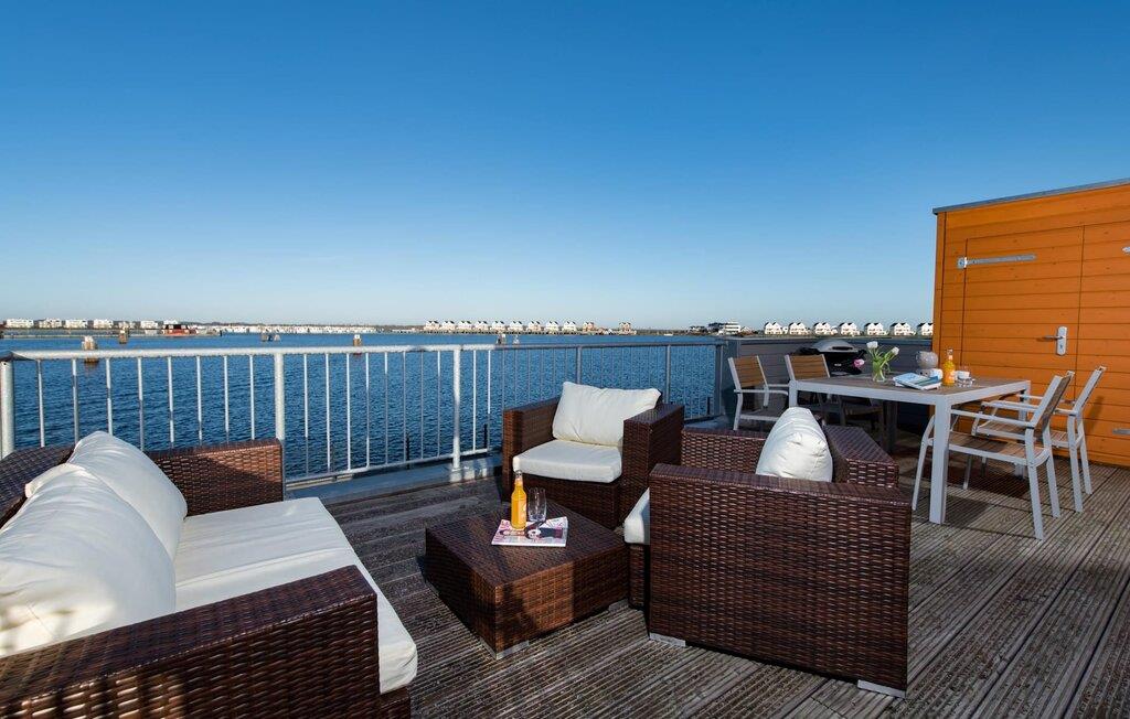 Sommerhusets opholds-/spisestue er oversvømmet med lys og har panoramavindue fra gulv til loft, der fører til de tilstødende terrasser på begge sider. En fantastisk udsigt åbner op på terrassen ved siden af ??spisepladsen med udsigt over sejler- og sportsbådshavnen i OstseeResort Olpenitz. Havnebiograf og romantiske solnedgange er garanteret og giver underholdning under en hyggelig grill.