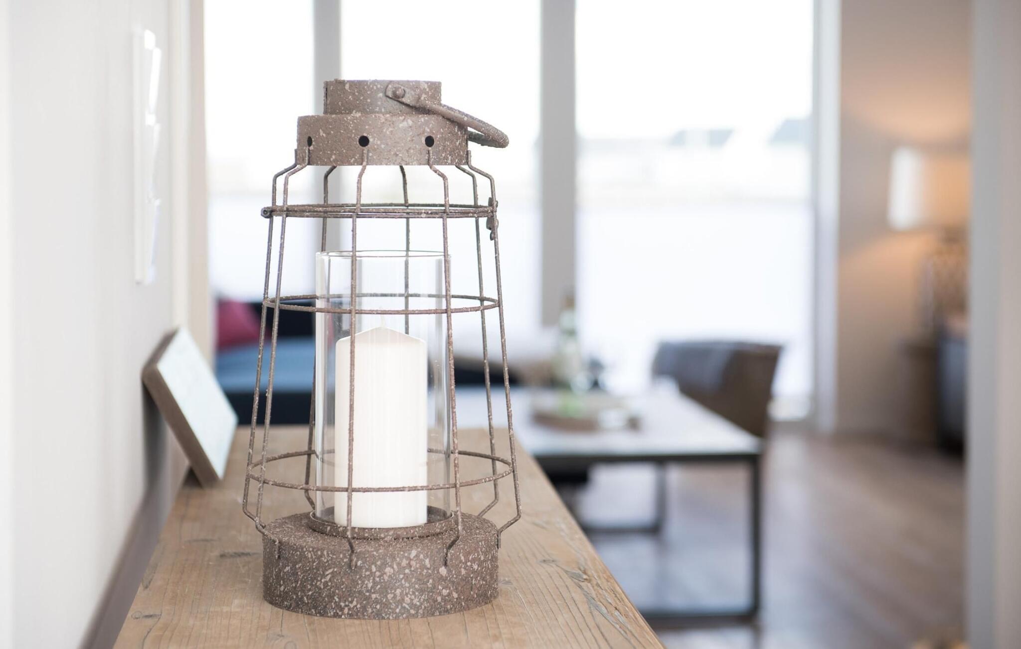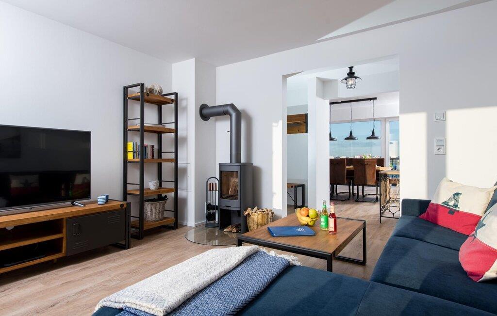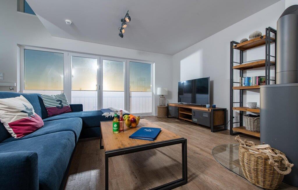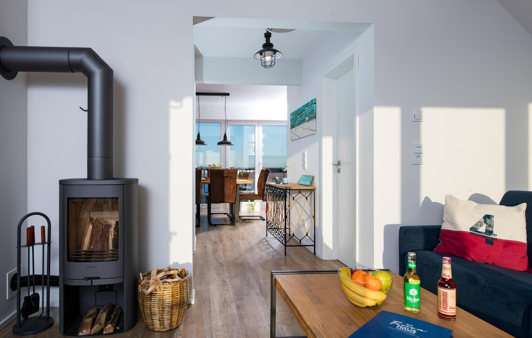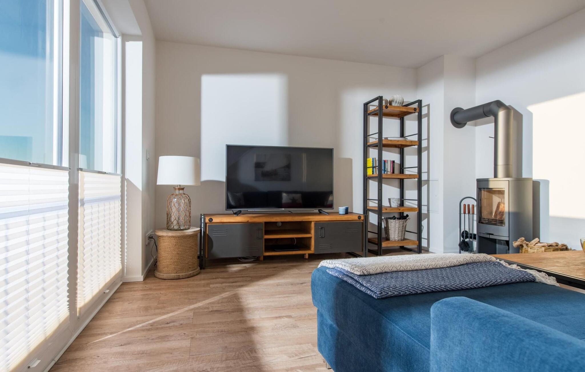 Der bliver hyggeligt i stuen, hvor en hyggelig siddegruppe indbyder til at nyde en aften ved pejsen på dårlige vejrdage. Smart TV med Telekom Home Entertainment-programmet tilbyder også indendørs underholdning.